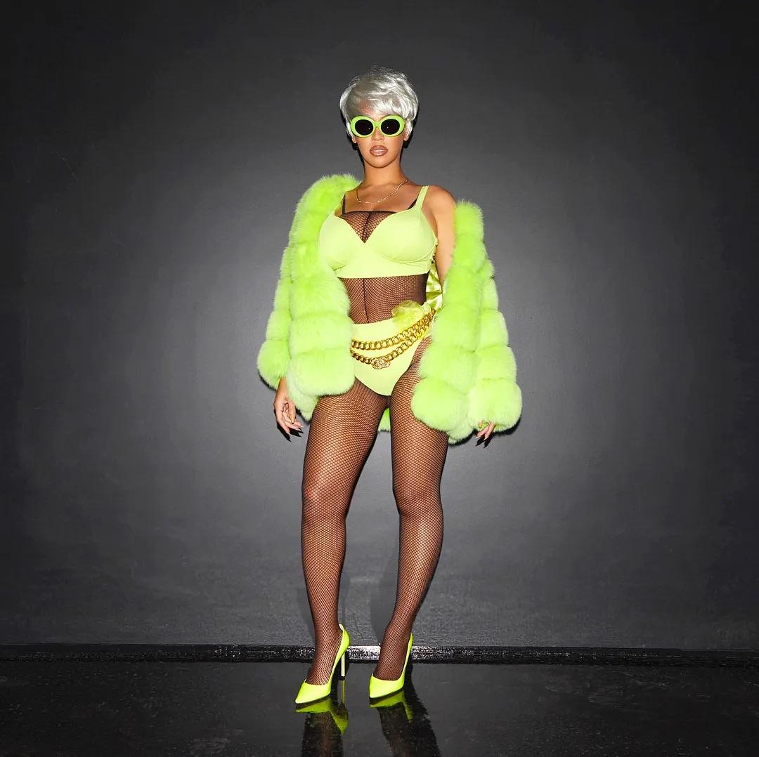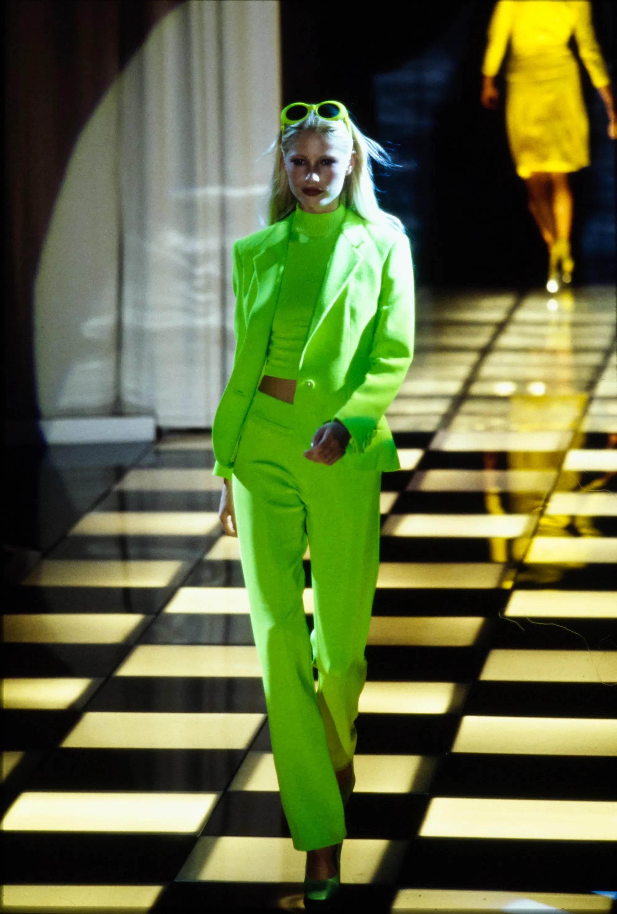 It's a 'Big Momma Thing', but you already know that. These bright green Gianni Versace sunglasses feature rhinestone-covered frames, round shape, black lenses, and silver-tone Versace Medusa emblems on both arms. Lil Kim and Beyoncé have famously worn similar versions, with the non-rhinestone version debuting during the Gianni Versace Spring/Summer 1996 collection runway show.