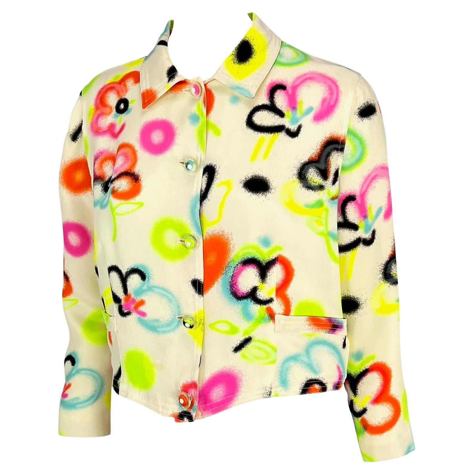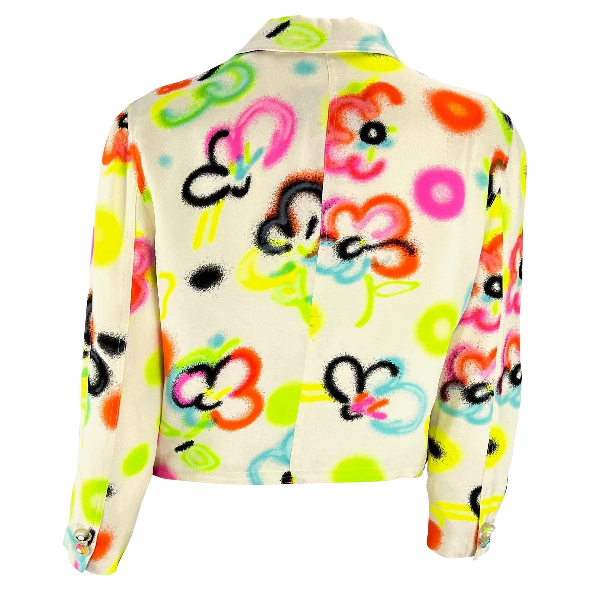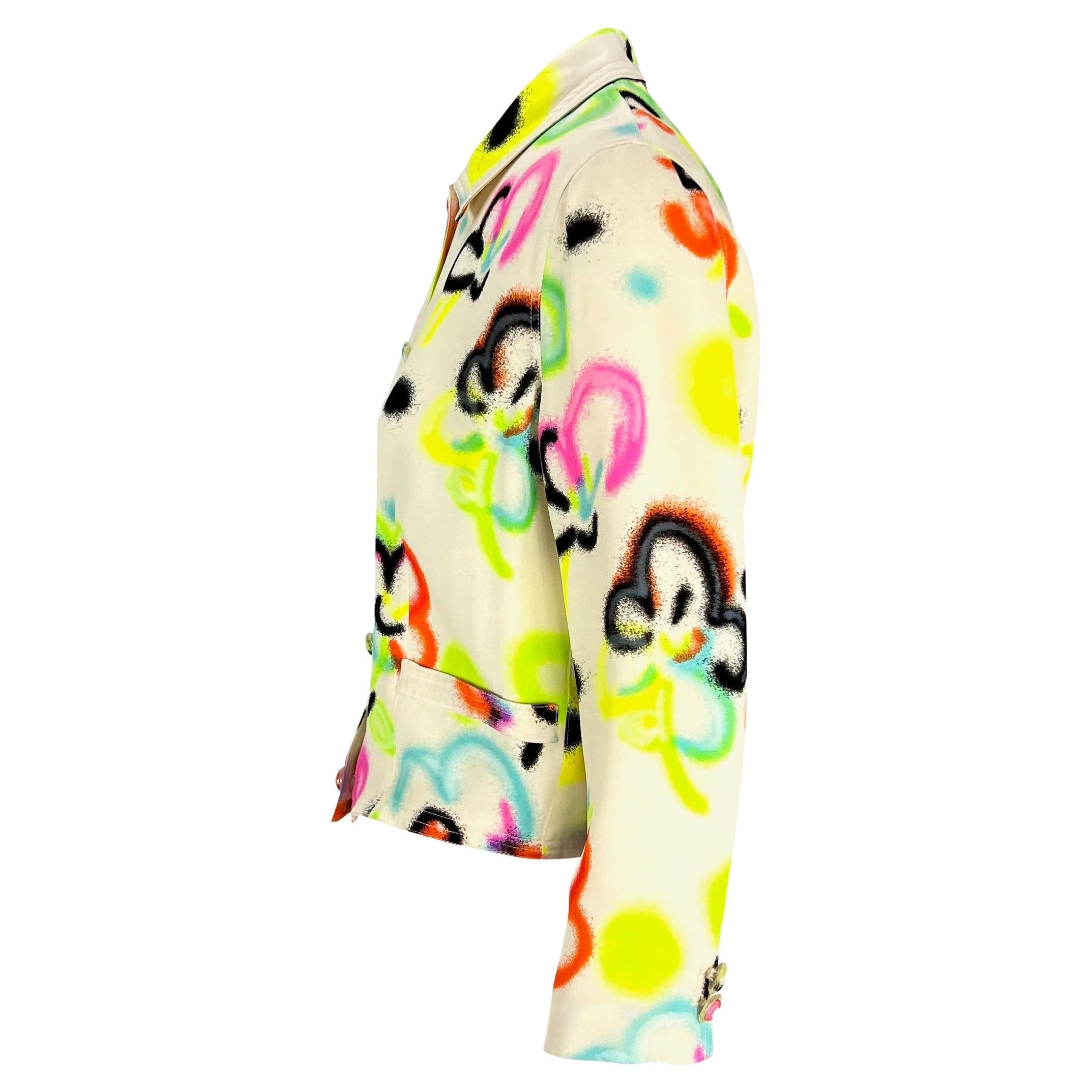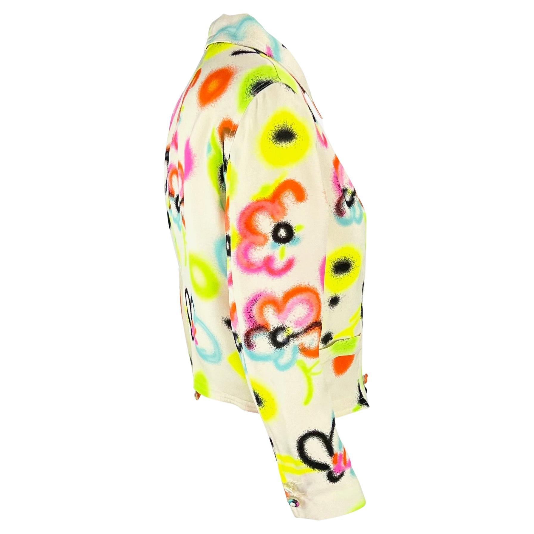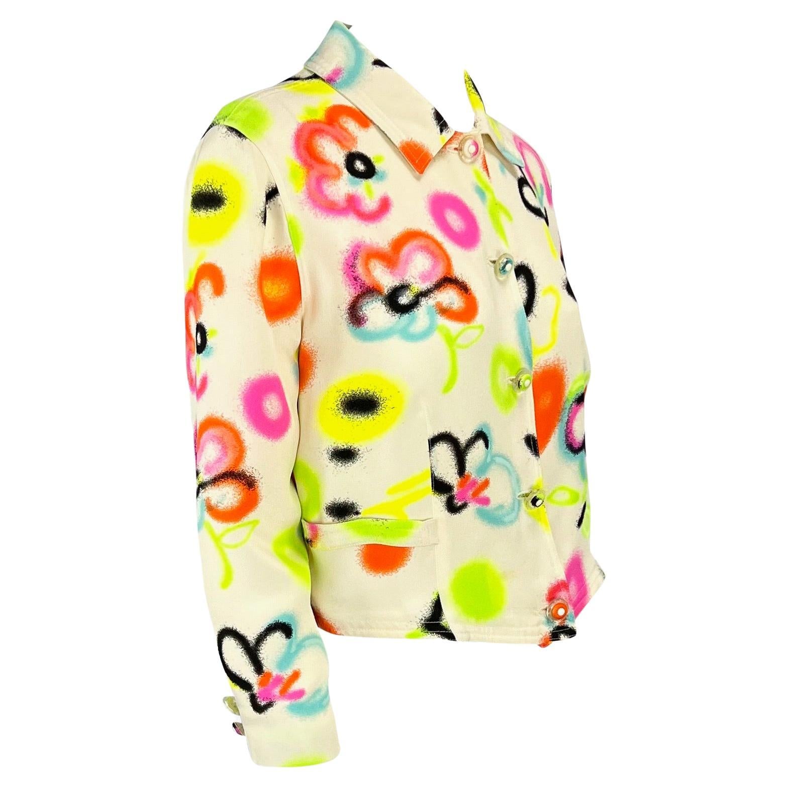 Presenting a cropped Gianni Versace Couture jacket designed by Gianni Versace. This button-up jacket from the Spring/Summer 1996 collection features bright neon flowers with a spray paint effect. This jacket is made with a collar, Versace Medusa buttons at the front closure, and cuffs. A fabulous piece of 1990s Gianni Versace, this is an essential piece for any Versace lover!