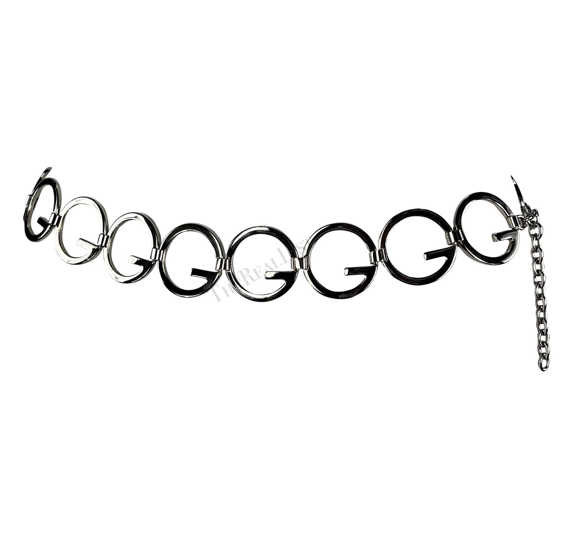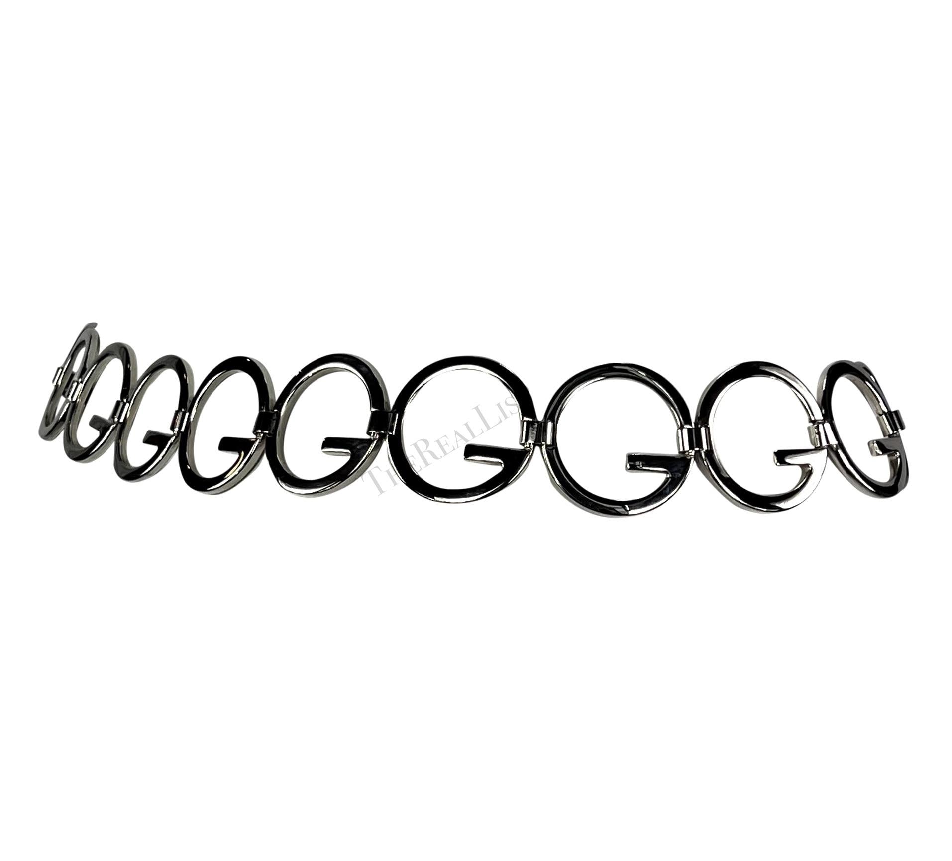 This incredible silver-tone metal Gucci 'G' chain belt was designed by Tom Ford. From the Spring/Summer 1996 collection, this chrome metal belt is constructed using large 'G' logo links. Size - N/A Width: 1.5" Waist: 30 - 33.5"