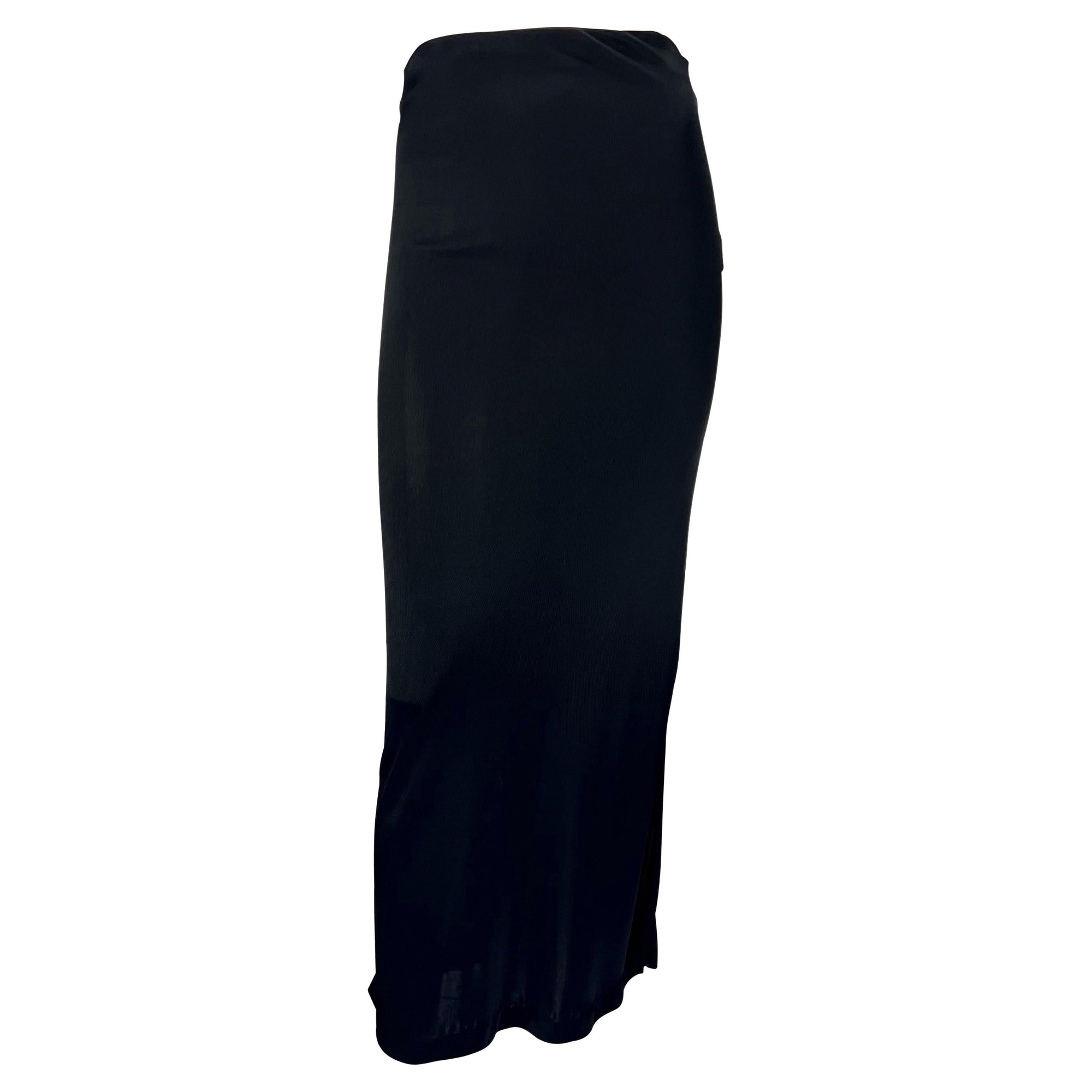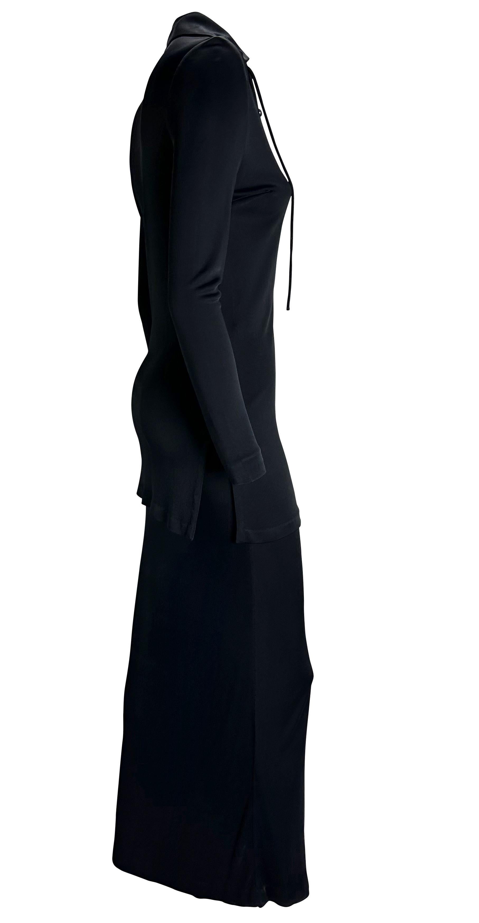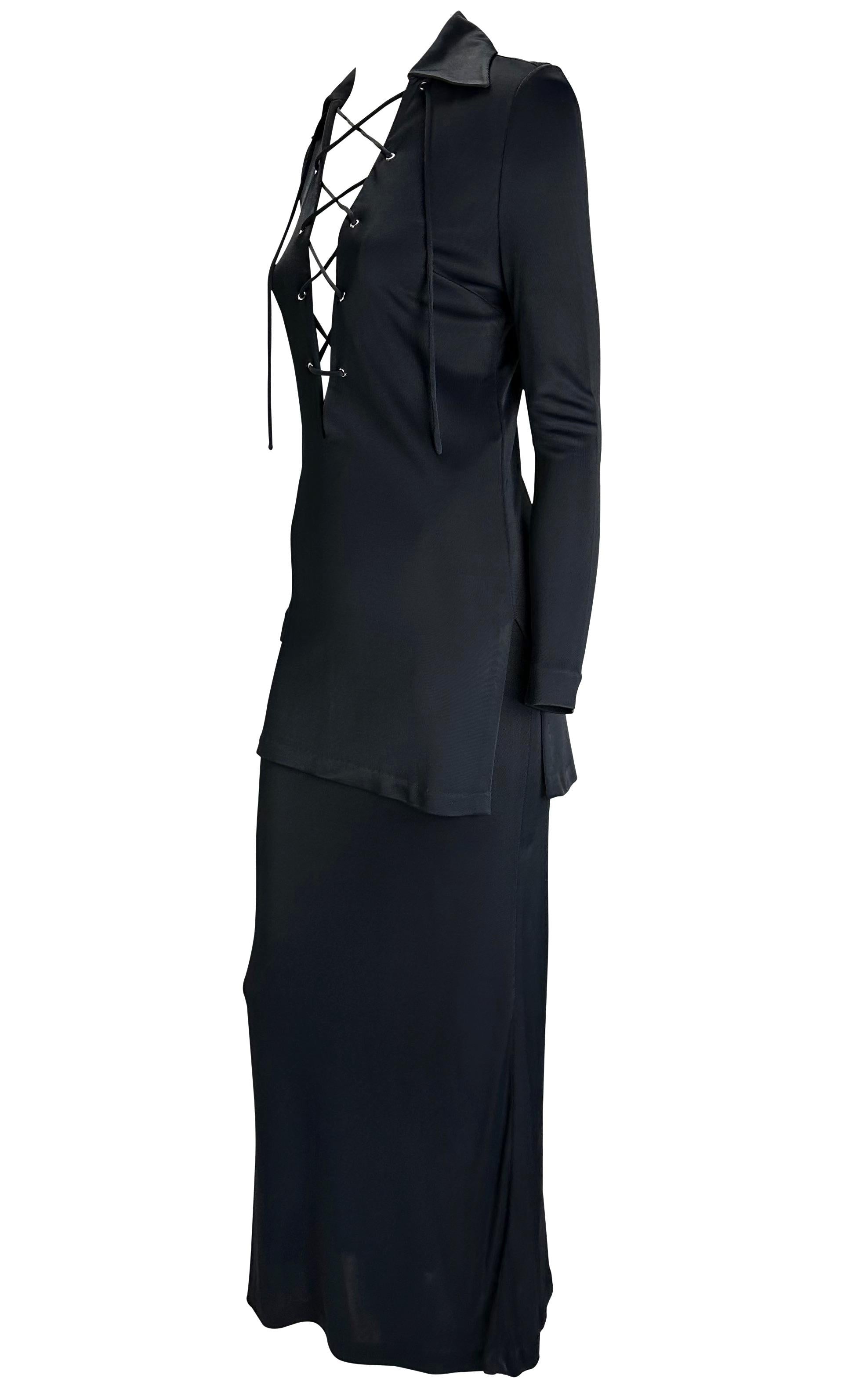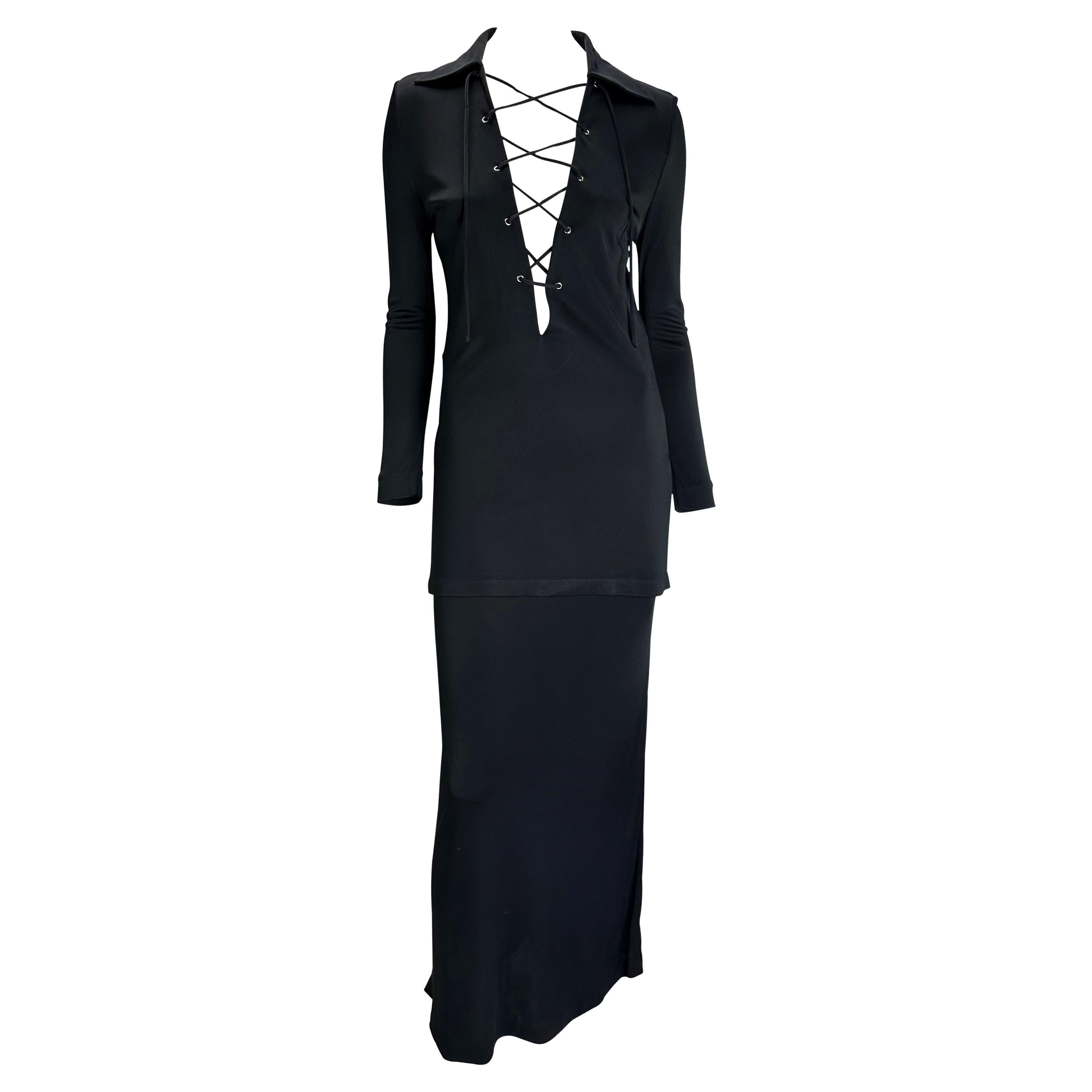 Presenting another iconic piece of fashion history - a navy viscose lace-up tunic and maxi skirt set designed by Tom Ford for Gucci's Spring/Summer 1996 collection. Madonna wore an identical set to the 1996 VH1 Fashion Awards, where she presented Tom Ford with the Fashion's Future Award and received the Most Fashionable Artist Award. A similar look debuted on the season's runway on Linda Evangelista and appeared in the season's ad campaign, shot by Mario Testino. With an adjustable lace-up deep plunging neckline and body-hugging viscose material, this well-documented look is the perfect combination of comfort and sex appeal.