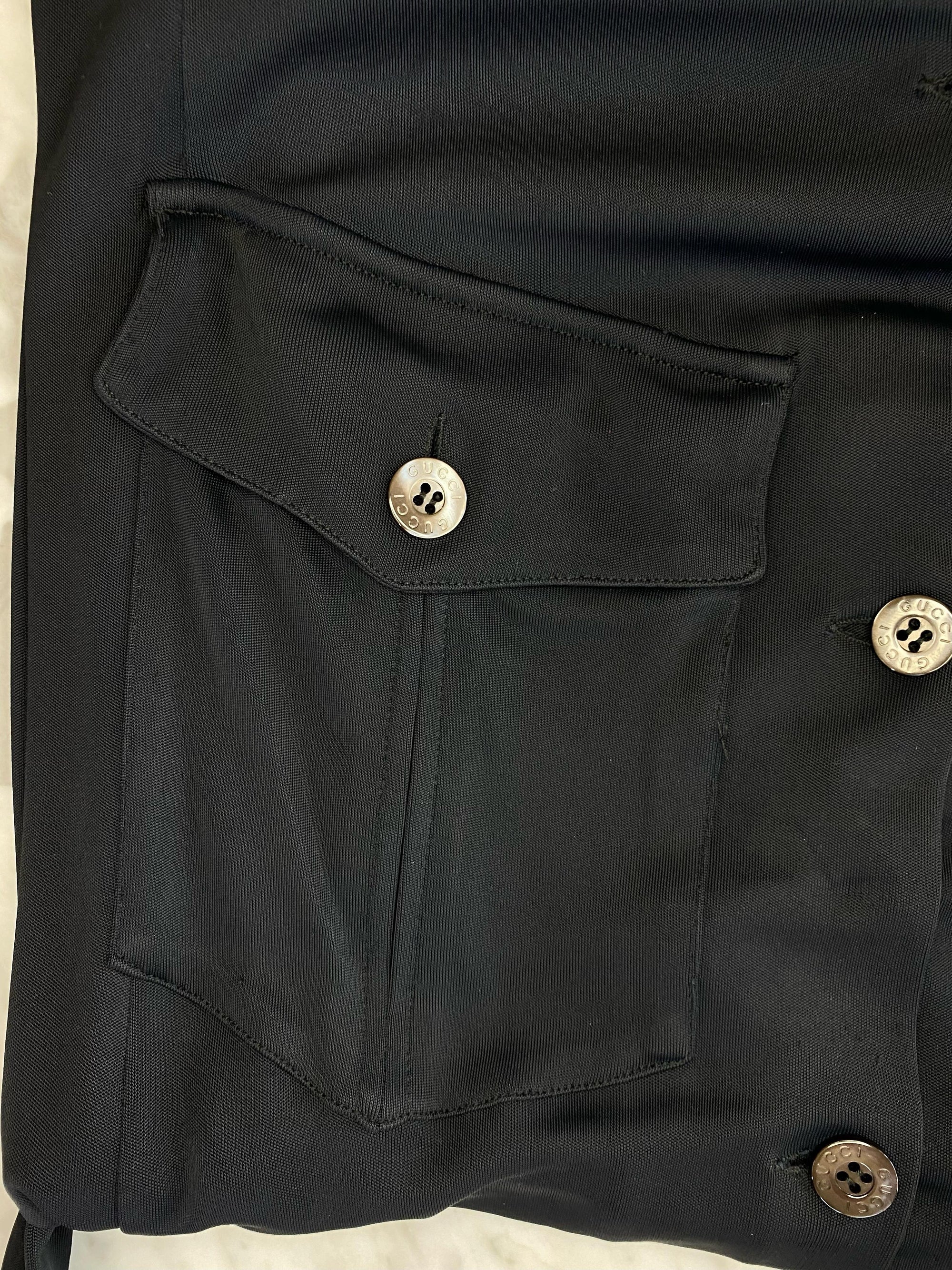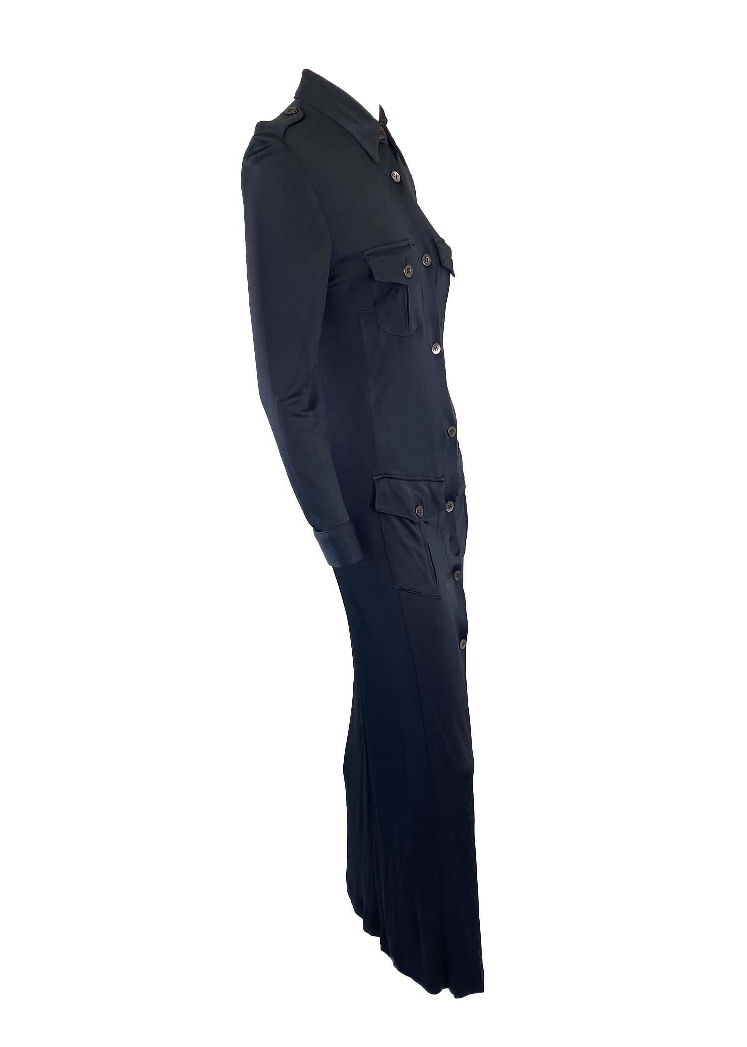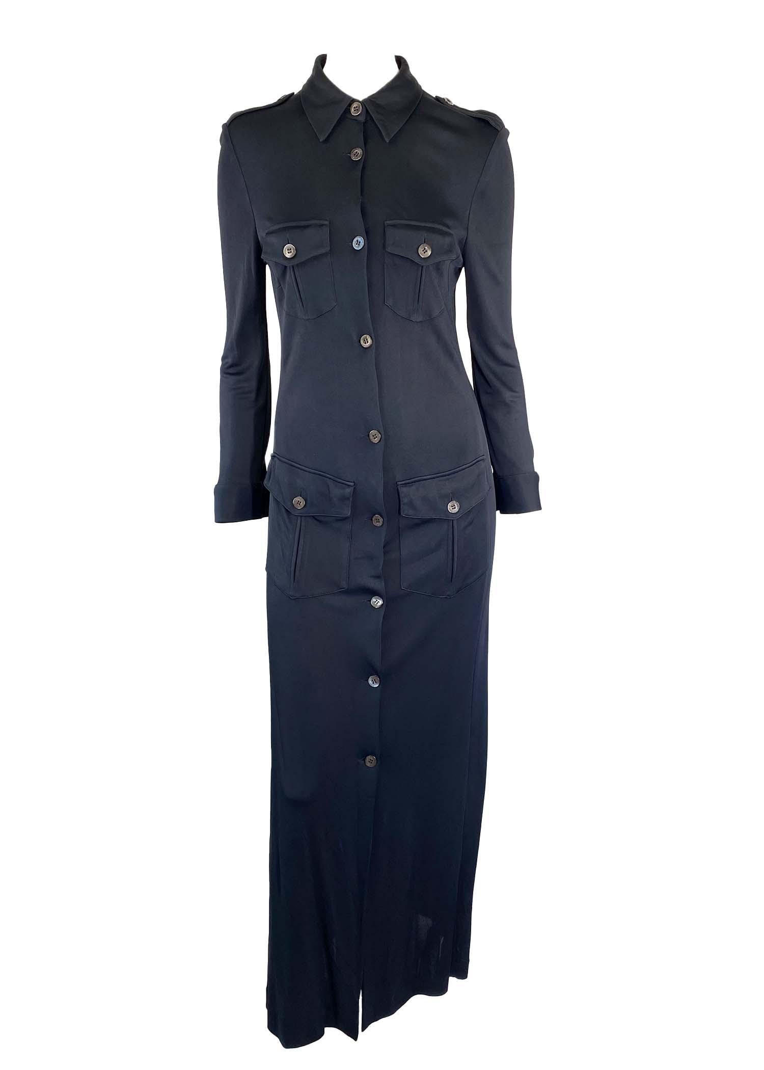 Presenting a navy viscose military-inspired maxi dress designed by Tom Ford for Gucci's Spring/Summer 1996 collection. This piece features epaulets and buttons with hidden reinforcing snaps down the center that can be undone to create a plunging neckline or a high-thigh slit. Nicole Kidman was photographed with Tom Cruise in one of these dresses in 1996, wearing the fabric tie as a matching headband. The tie that comes with this dress can be used as a headband, belt, or even a necktie.