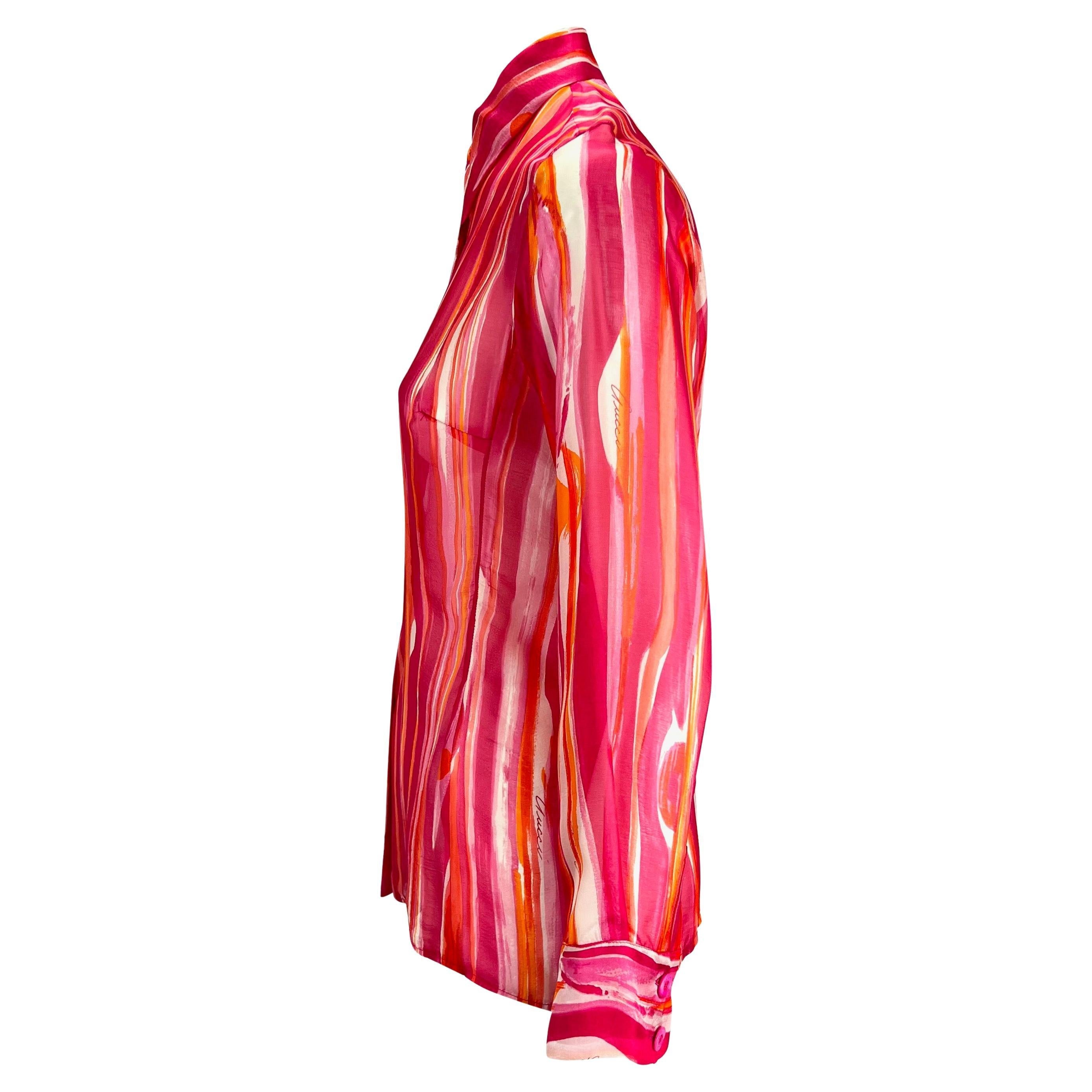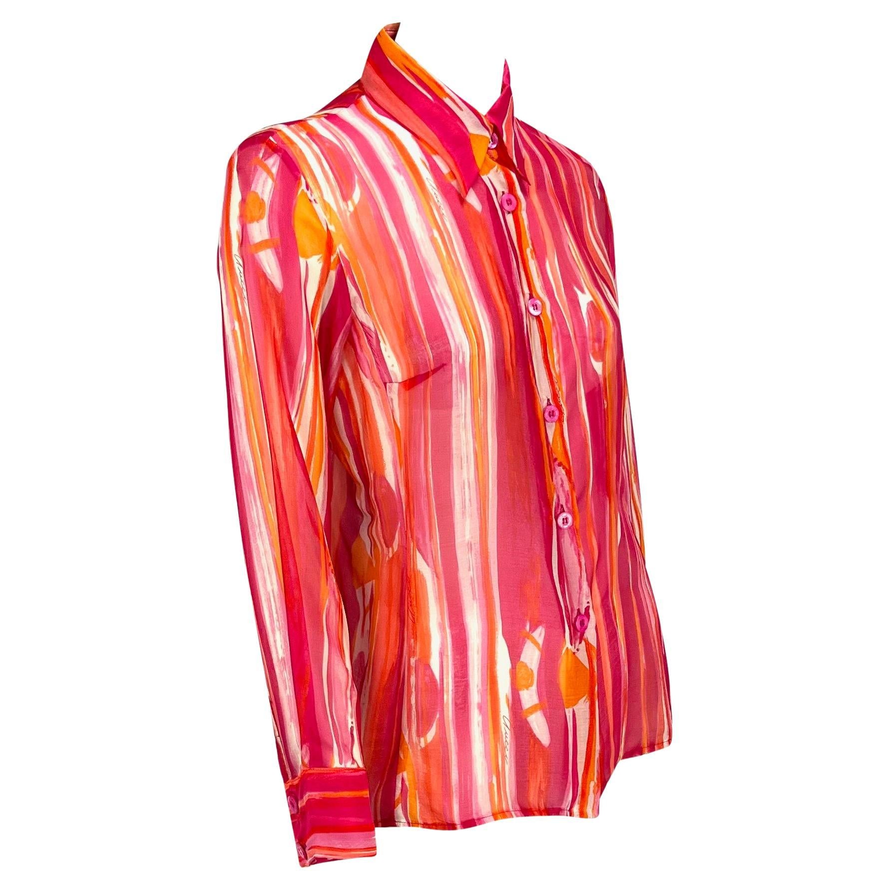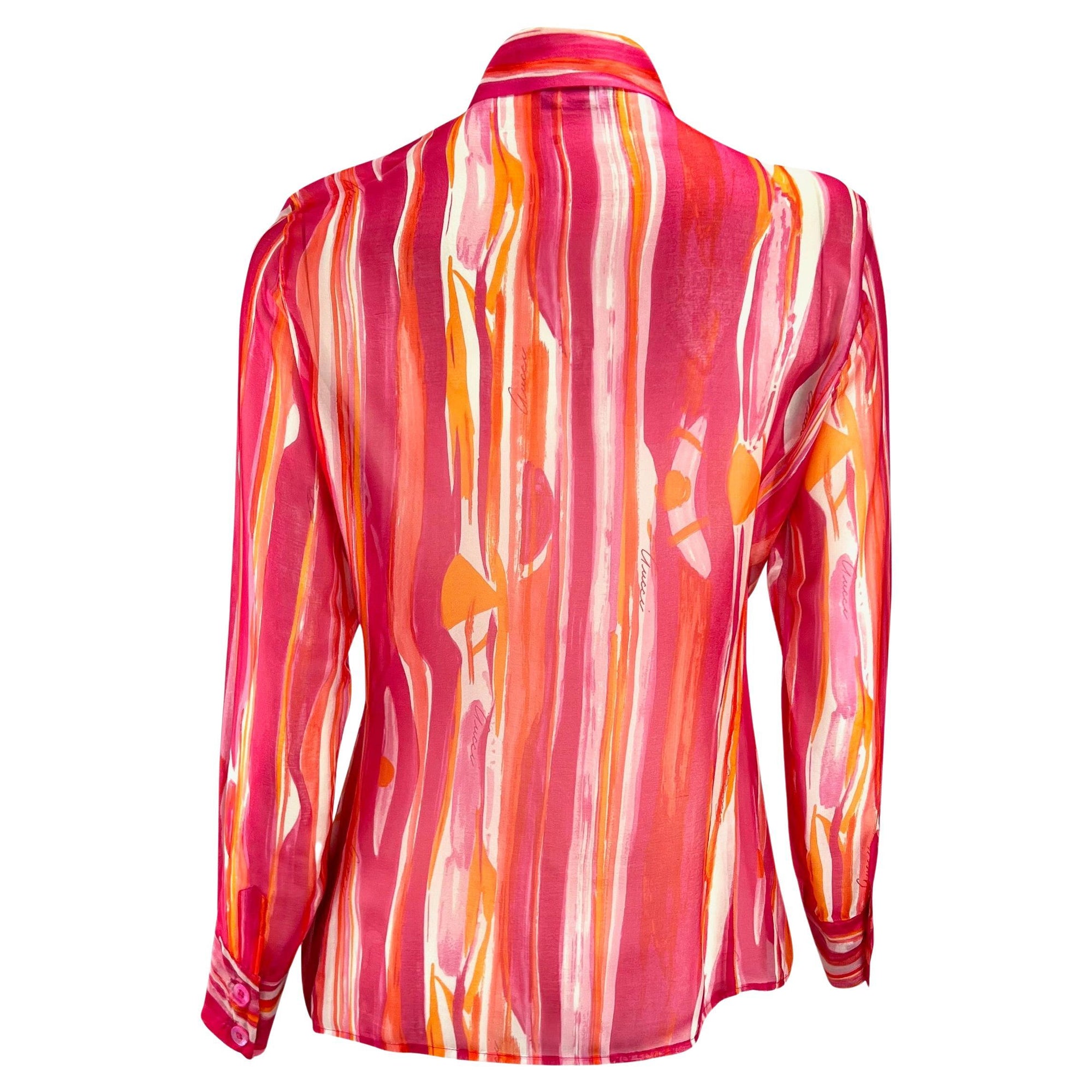 Presenting a sheer silk button-up top designed by Tom Ford for Gucci's Spring/Summer 1996 collection. This 1970s-inspired collection featured the same blouse in blue in the runway presentation and in the season's ad campaign, shot by Mario Testino. The silk organza features a bright orange, pink, and white watercolor print with the Gucci logo peppered throughout. Add this pop of color to your wardrobe, also available in smaller sizes!