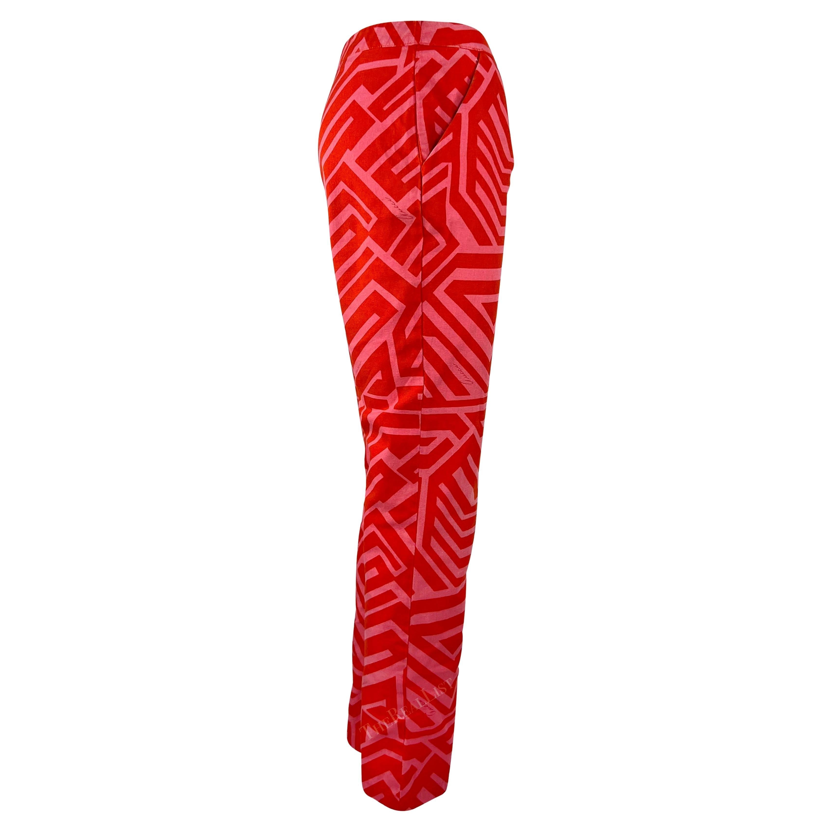 Presenting a pair of red abstract print Gucci by Tom Ford pants. From the Spring/Summer 1996 collection, these pants debuted on the season's runway and were also highlighted in the season's ad campaign, captured by Mario Testino. Covered in an abstract maze-like pattern, these slim pants are a must-have for any Gucci by Tom Ford lover or collector.