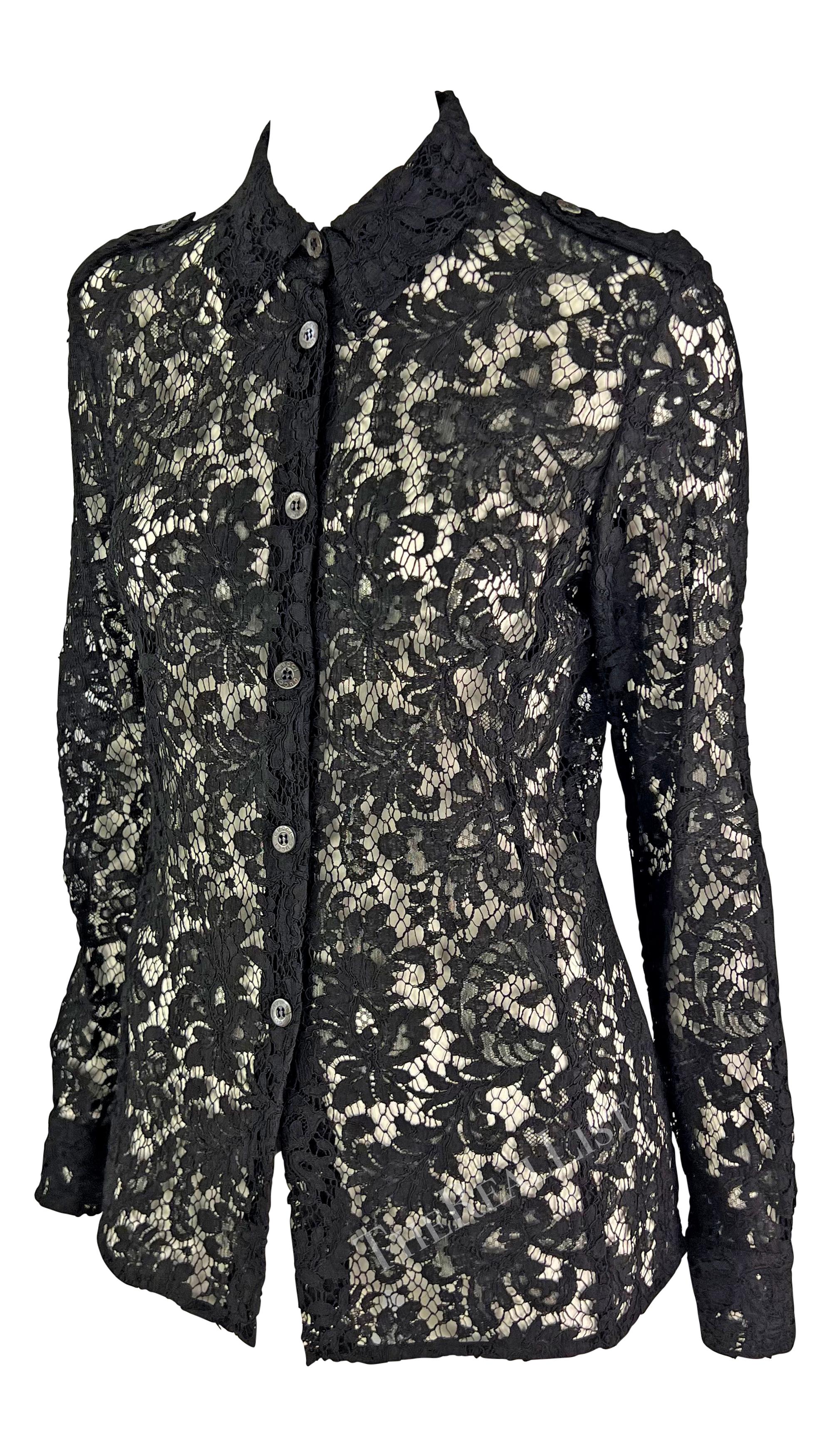 Presenting a military inspired black lace Gucci button up top, designed by Tom Ford. From the Spring/Summer 1996 collection, this top debuted on the the season's runway and in the January 1996 issue of US Vogue on Trish Goff, shot by Steven Meisel. The top is completely constructed of fine lace and features a button down front closure, epaulettes, and a standard collar. This beautiful and intricate top is the perfect elevated and unique piece to add glamour to your day or evening ensemble.