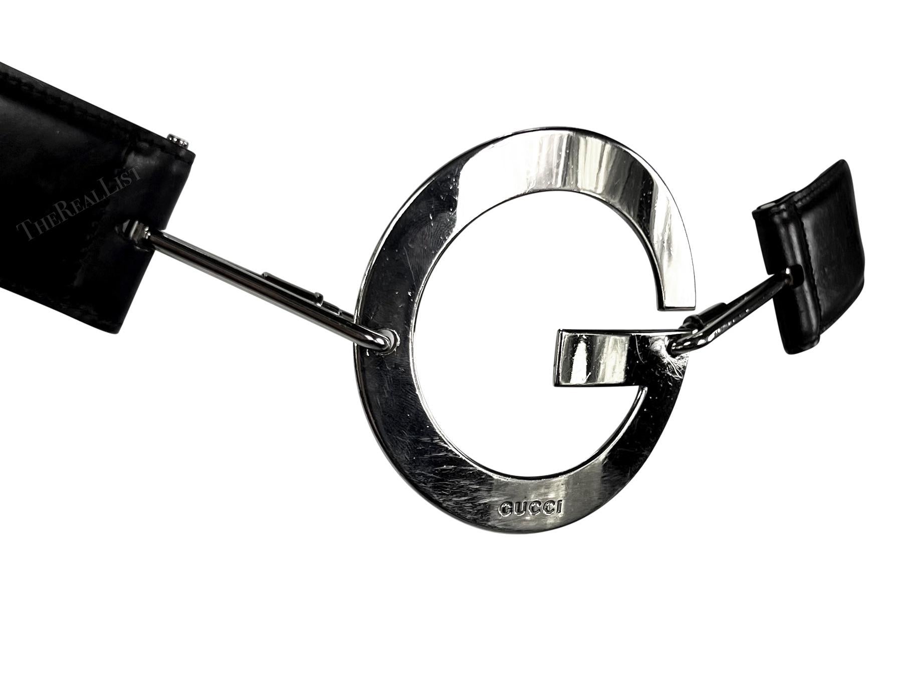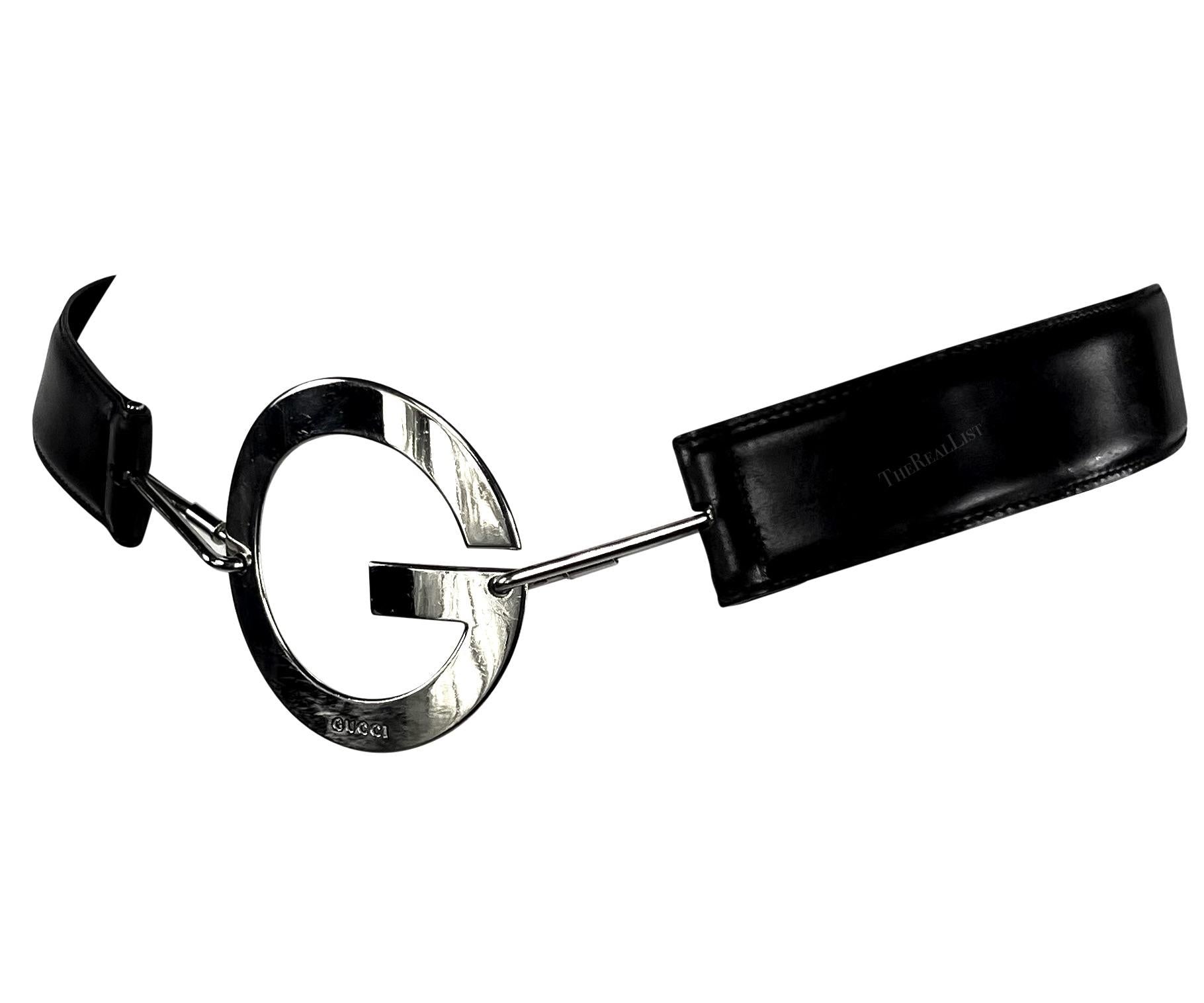 This iconic Gucci belt, designed by Tom Ford, is a standout piece from the Spring/Summer 1996 collection. Featuring a black leather strap and a large round silver 'G' buckle, it made its debut on the season's runway and was prominently featured in the collection's ad campaign, as well as in other advertisements.