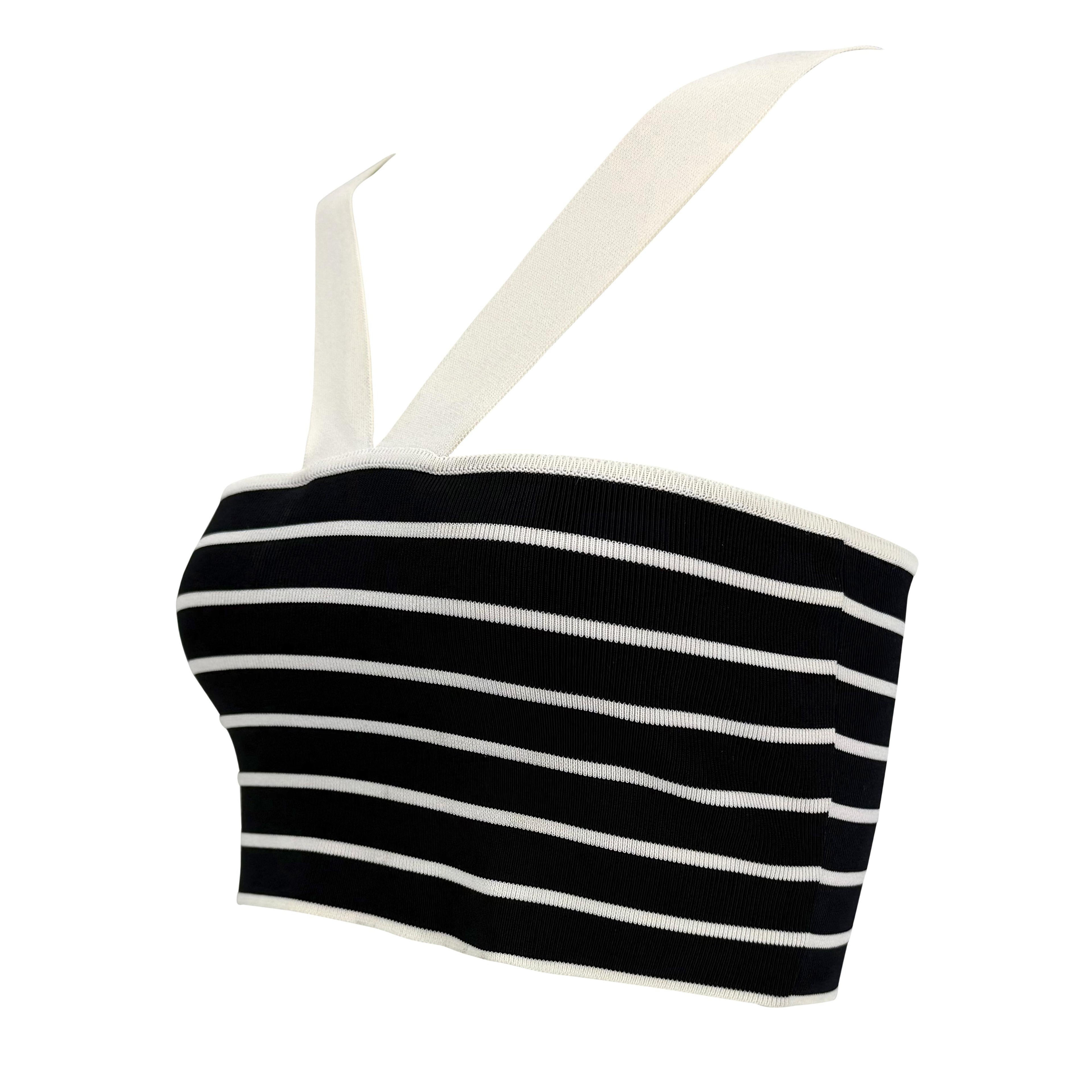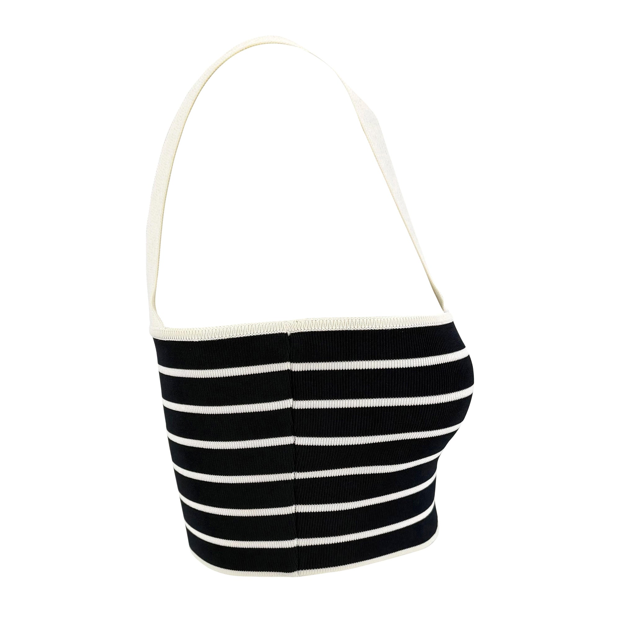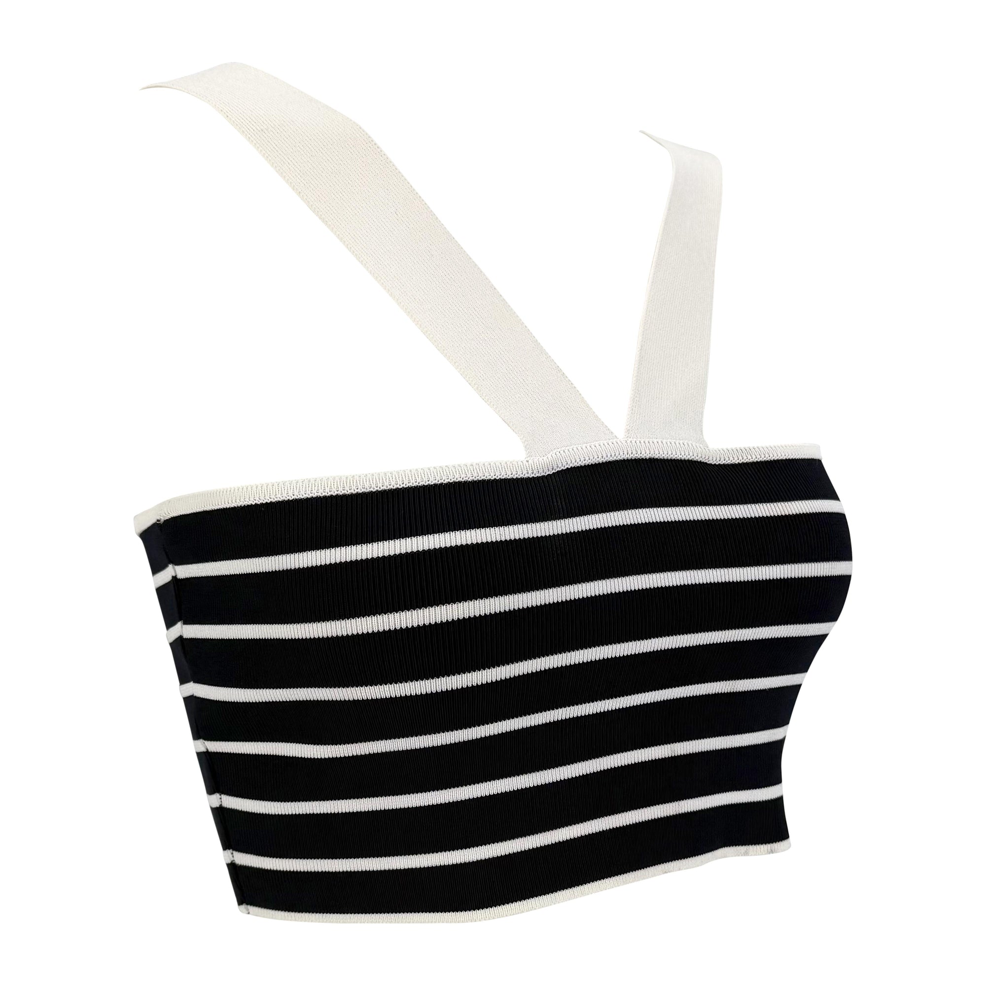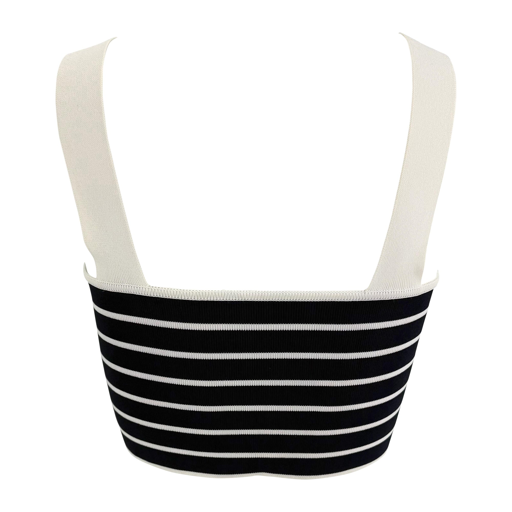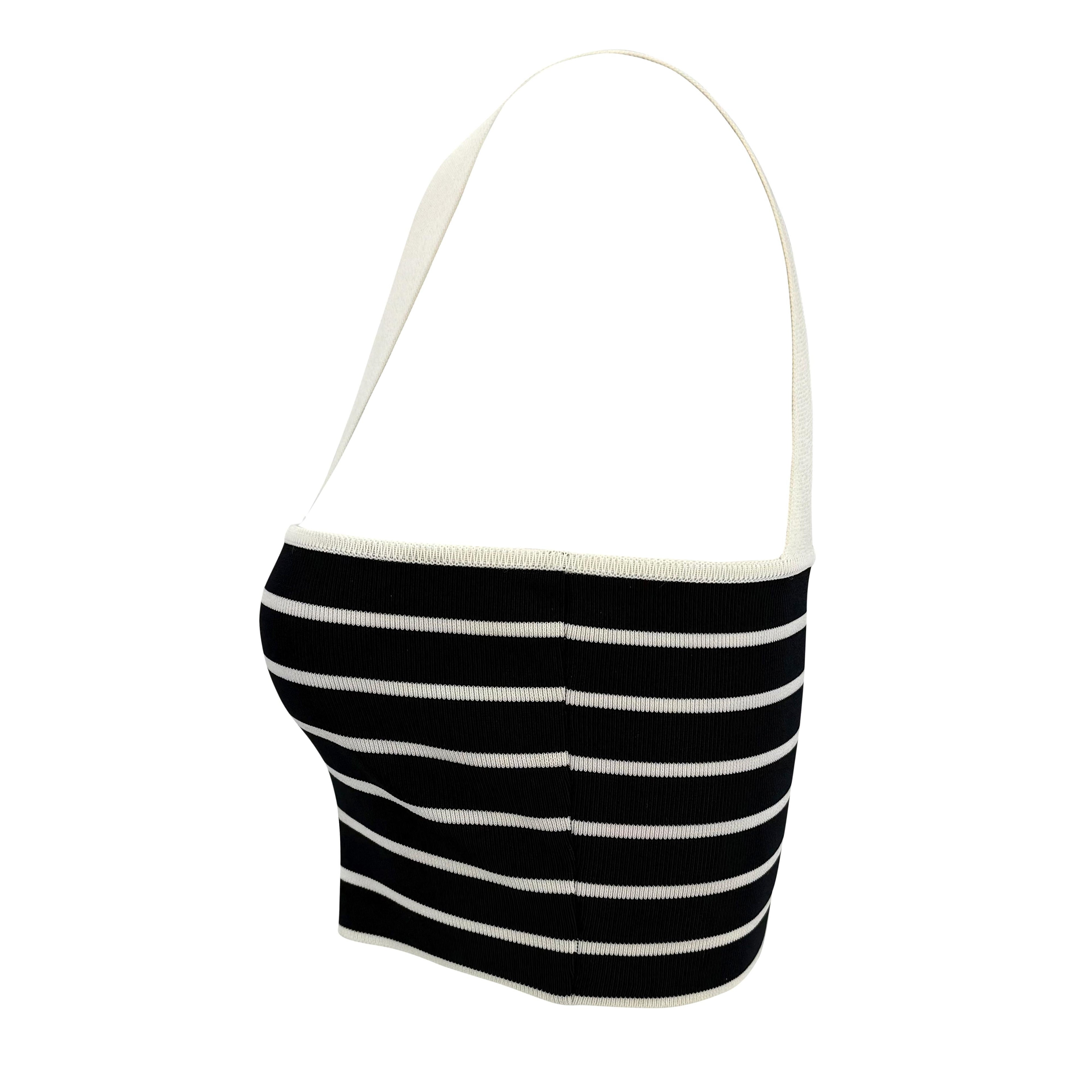 From Ralph Lauren’s Spring/Summer 1996 collection, this navy and white striped crop top is knit in stretch fabric. A pinched neckline frames the back, while wide ivory straps extend into a clean square bust. The design is fully reversible and features a streamlined, body-skimming silhouette seen on the season’s runway, modeled by Ingrid Seynhaeve. Pictured reversed as shown on the runway.