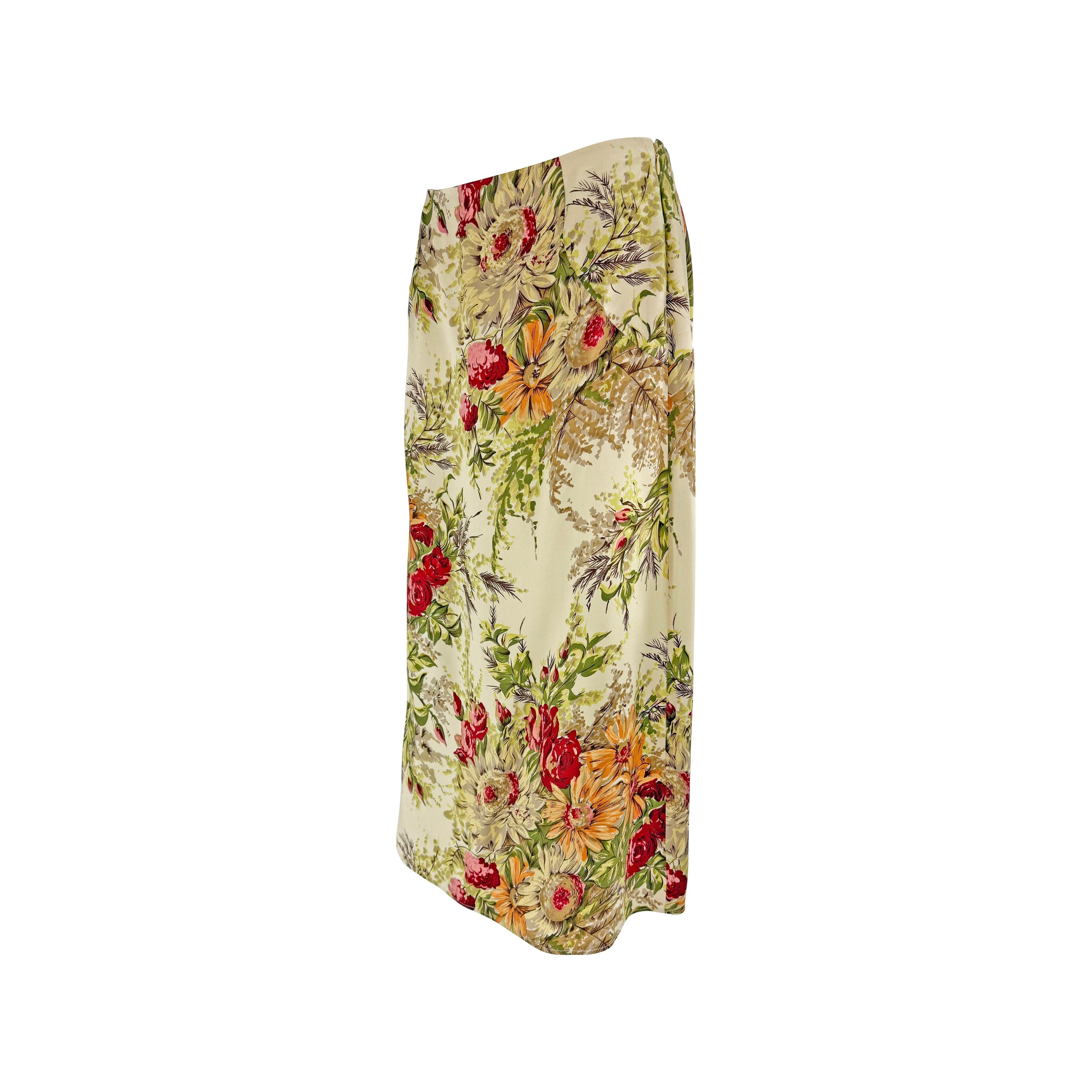 From Dolce & Gabbana's Spring/Summer 1997 collection, this beige satin midi skirt is adorned with a painterly floral print featuring chrysanthemums, dahlias, and roses in warm tones of red, orange, and green on a light tan background.