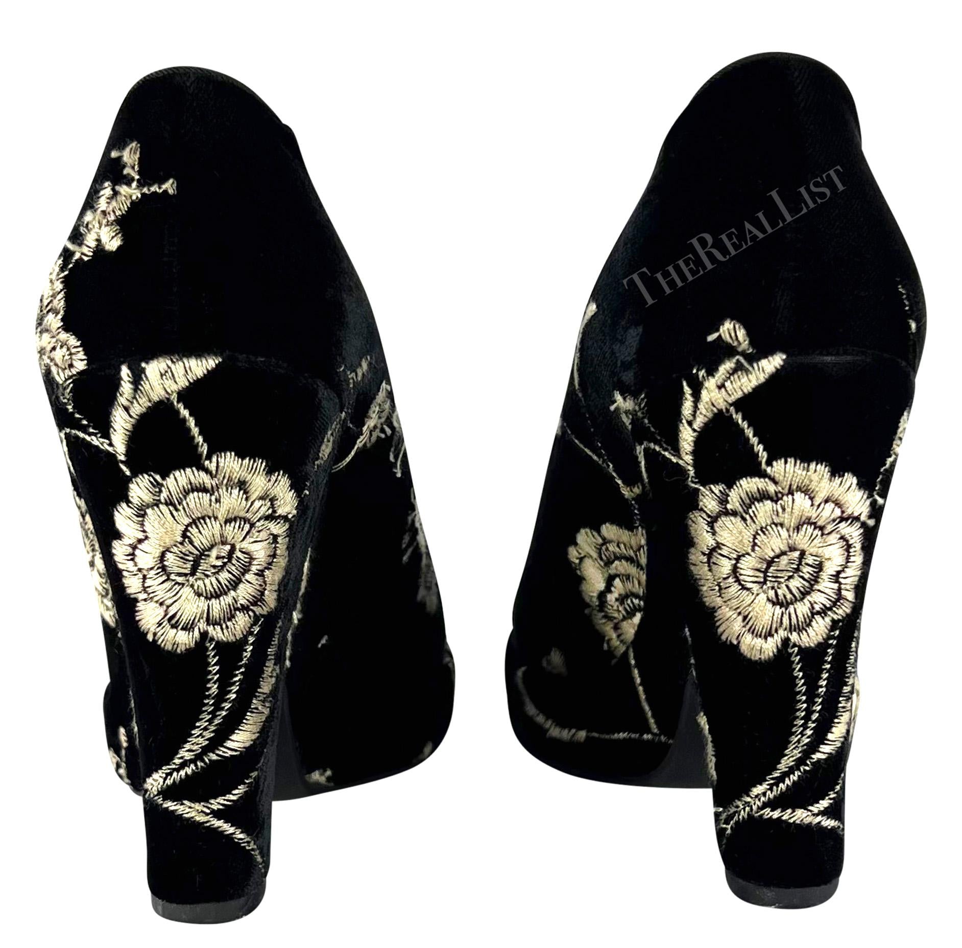 From the Spring/Summer 1997 collection, these black velvet Dolce & Gabbana platform heels feature a small platform and are made complete with an embroidered white floral pattern, that debuted on the season's runway. Never worn before, these heels from 25+ years ago come complete with their original box.