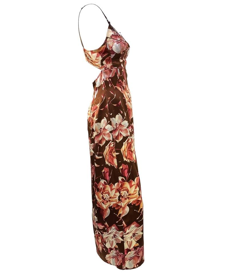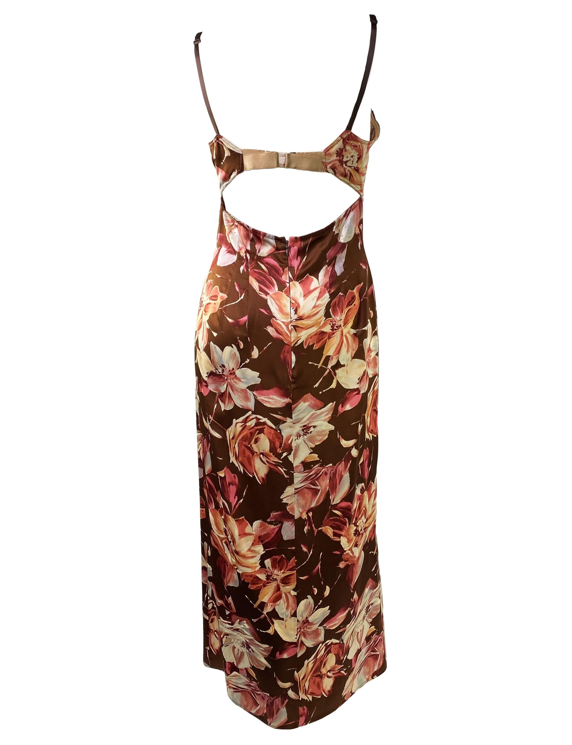 S/S 1997 Dolce & Gabbana Floral Brown Silk Bustier Strap Pin-Up Dress