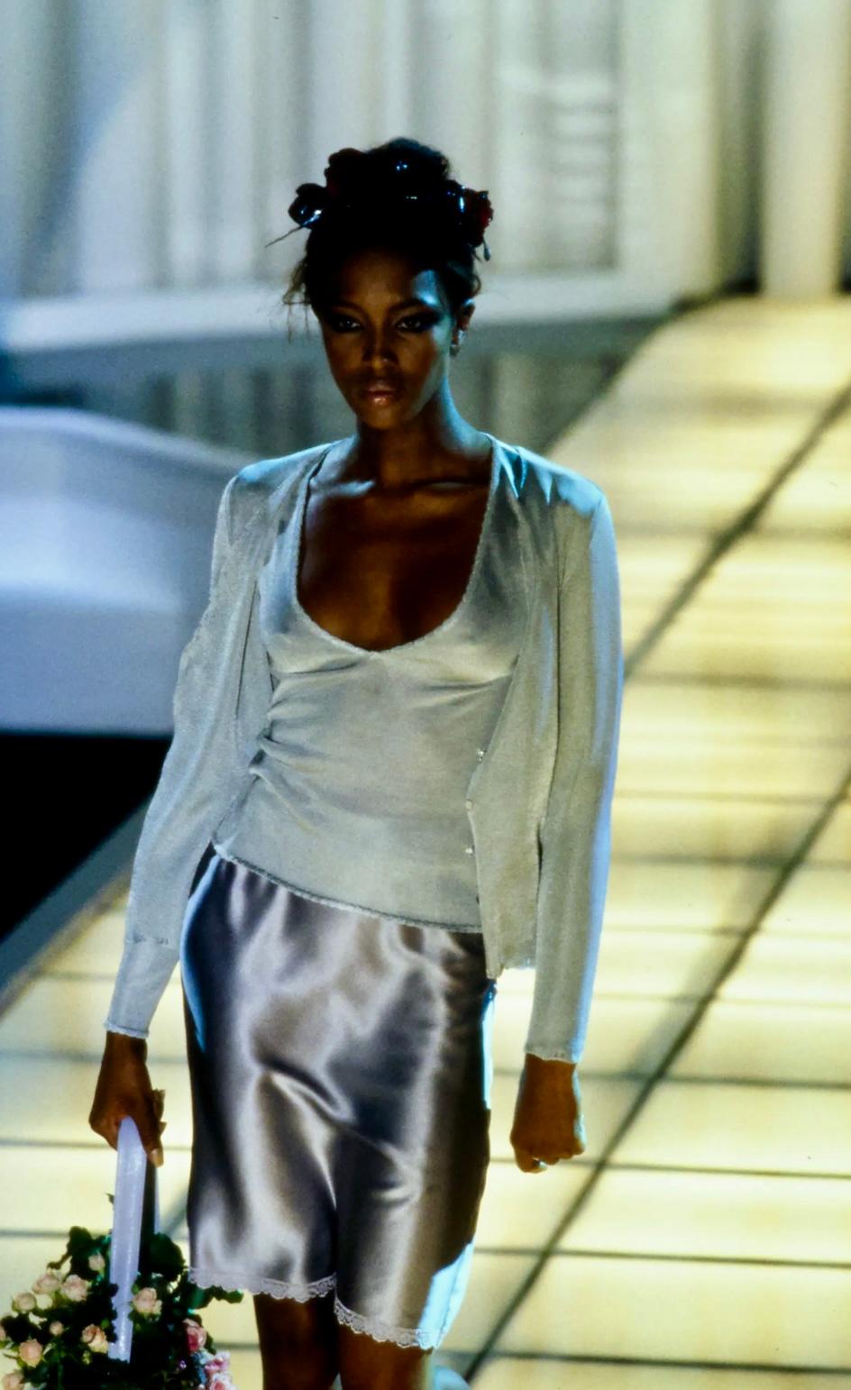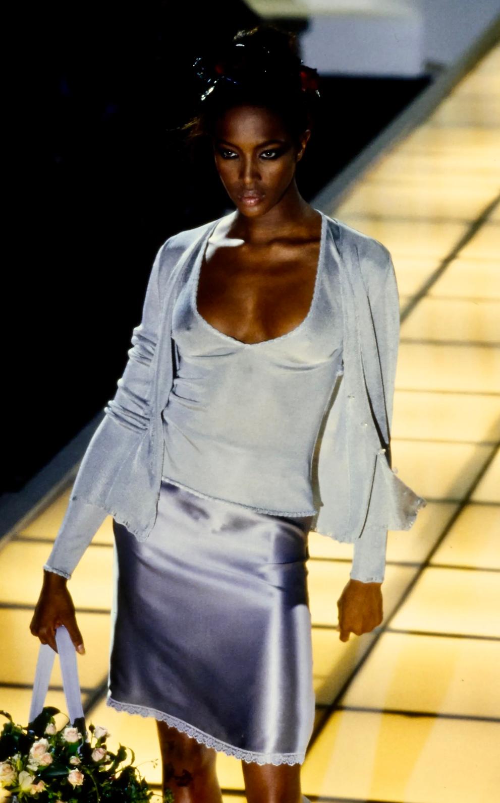 From the Spring/Summer 1997 collection, this Gianni Versace knit top debuted on the season's runway as part of look 32 in gray on Naomi Campbell. The matching black cardigan as seen on the runway is also available for purchase! This top features a v-neckline, short sleeves, and a scalloped hem throughout. Semi-sheer, this luxurious essential is the perfect addition to any wardrobe!