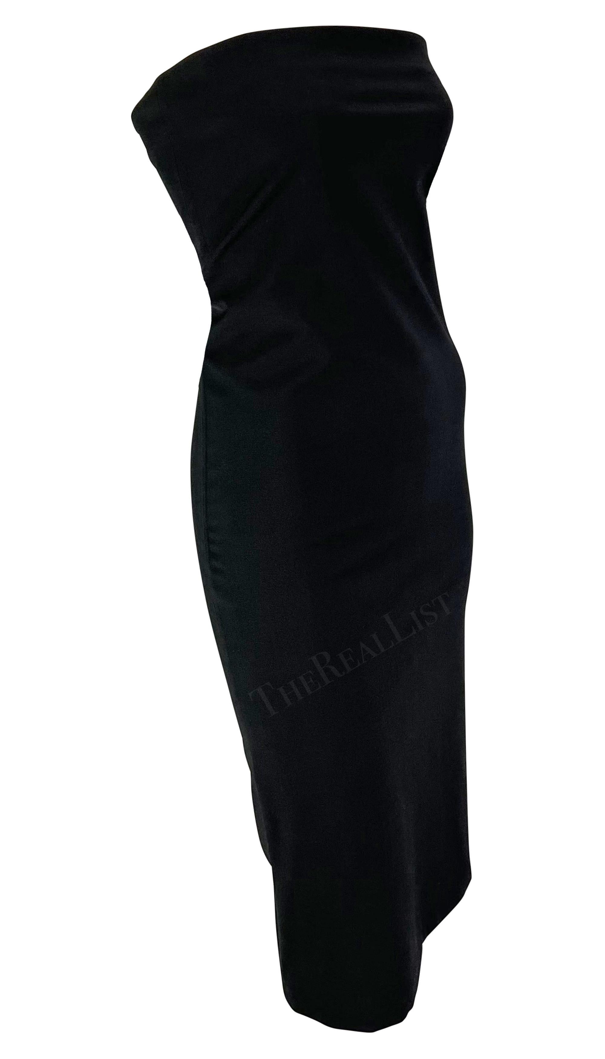Presenting a chic black Gucci tube dress, designed by Tom Ford. From the Spring/Summer 1997 collection, this dress debuted on the season's runway and was also highlighted in the season's ad campaign, captured by Mario Testino. This form-fitting strapless dress perfectly clings to the body. Make this dress your own by styling it with a gathered look at the waist or pulled down to smooth and highlight the natural curves.