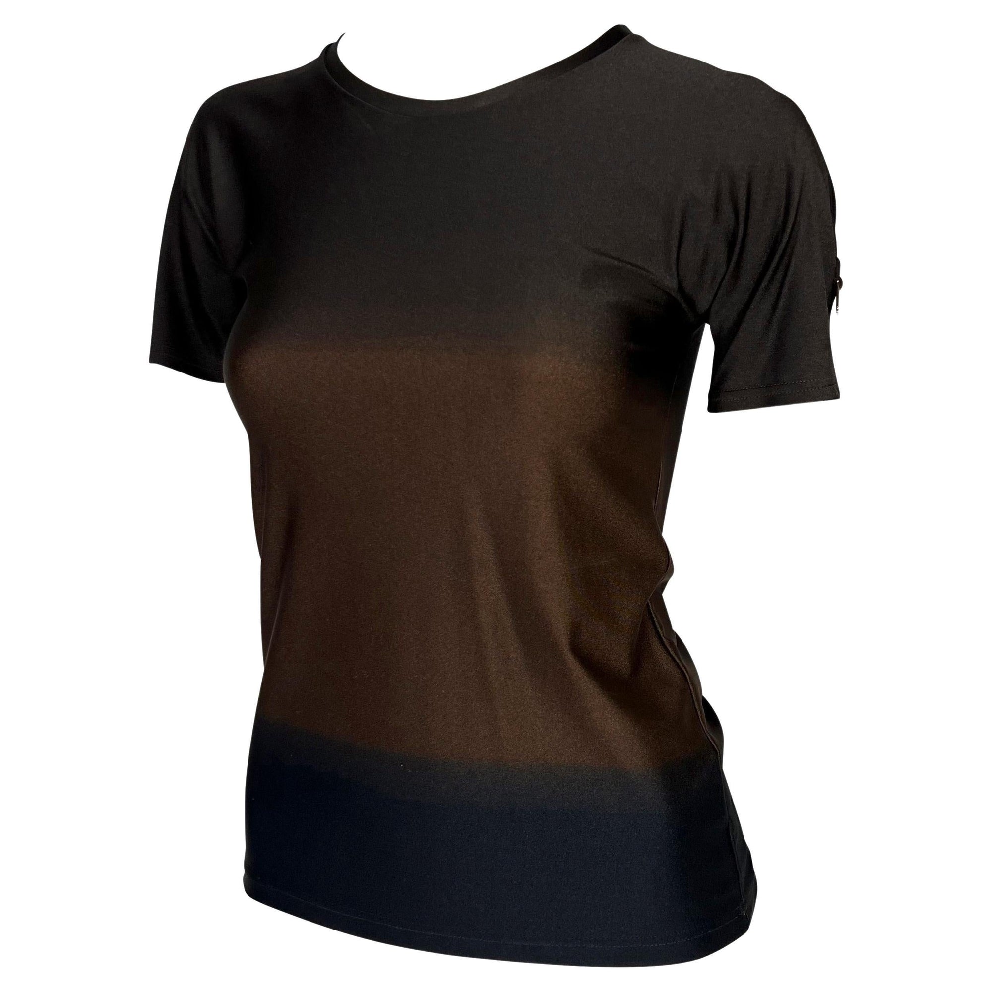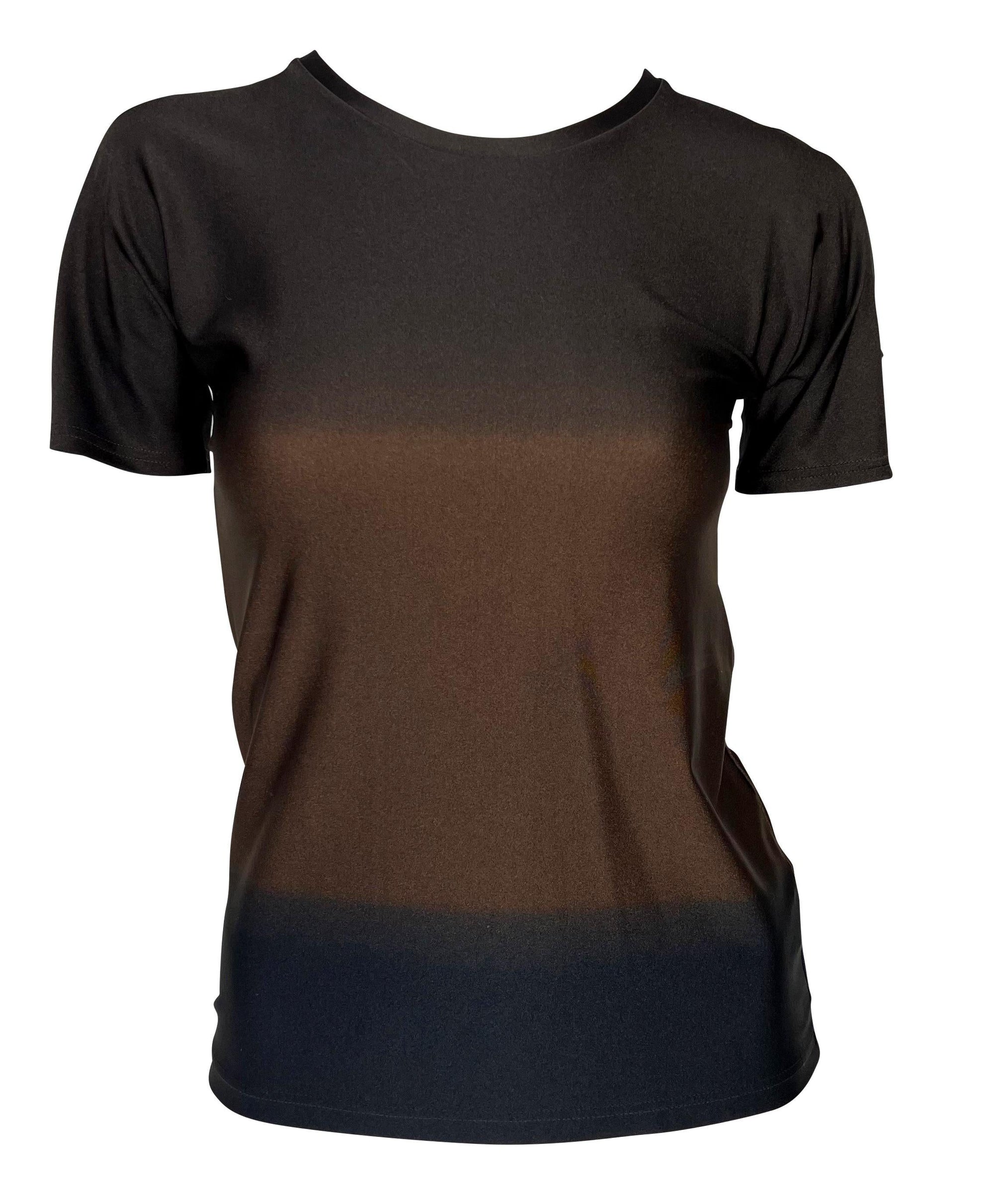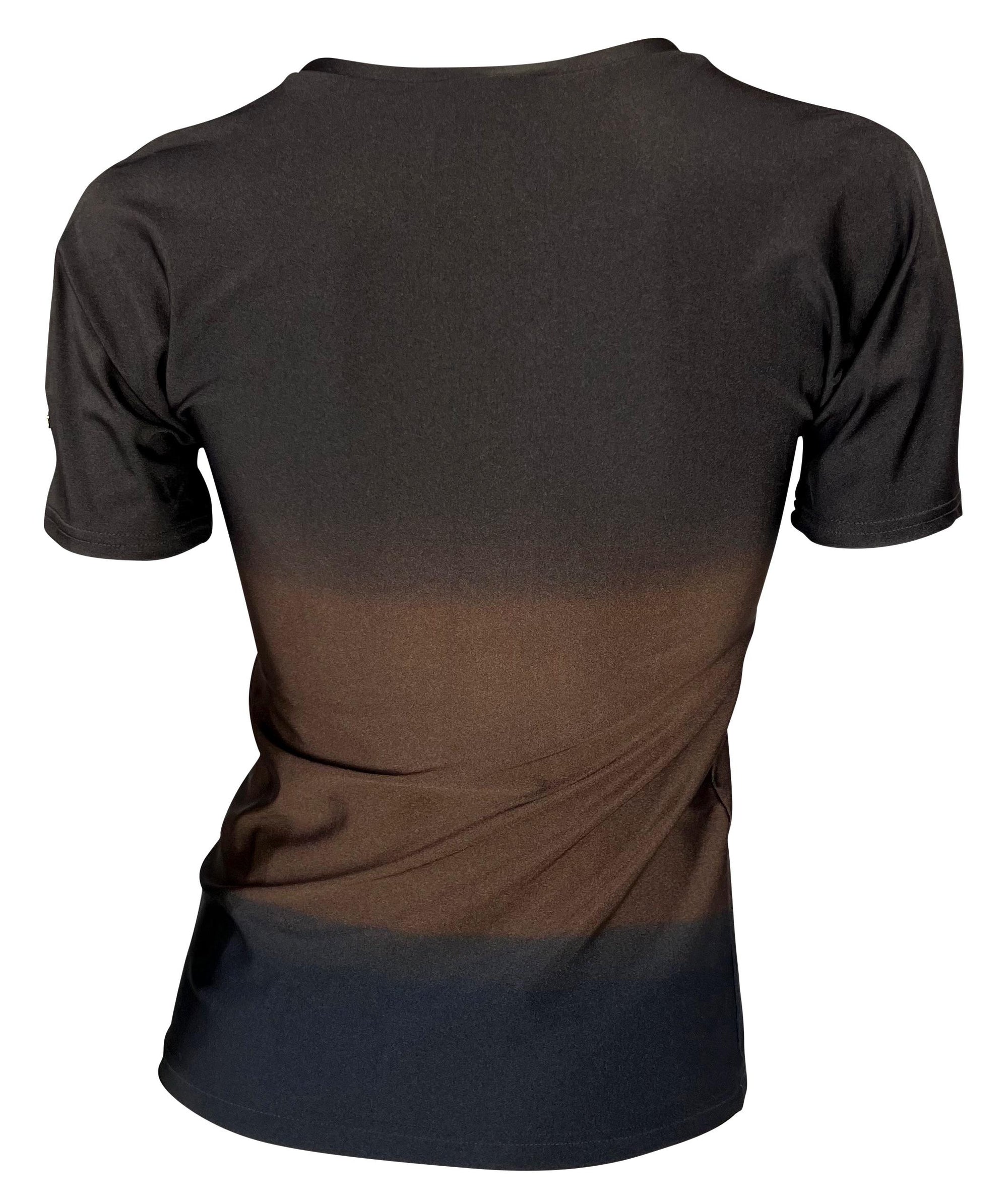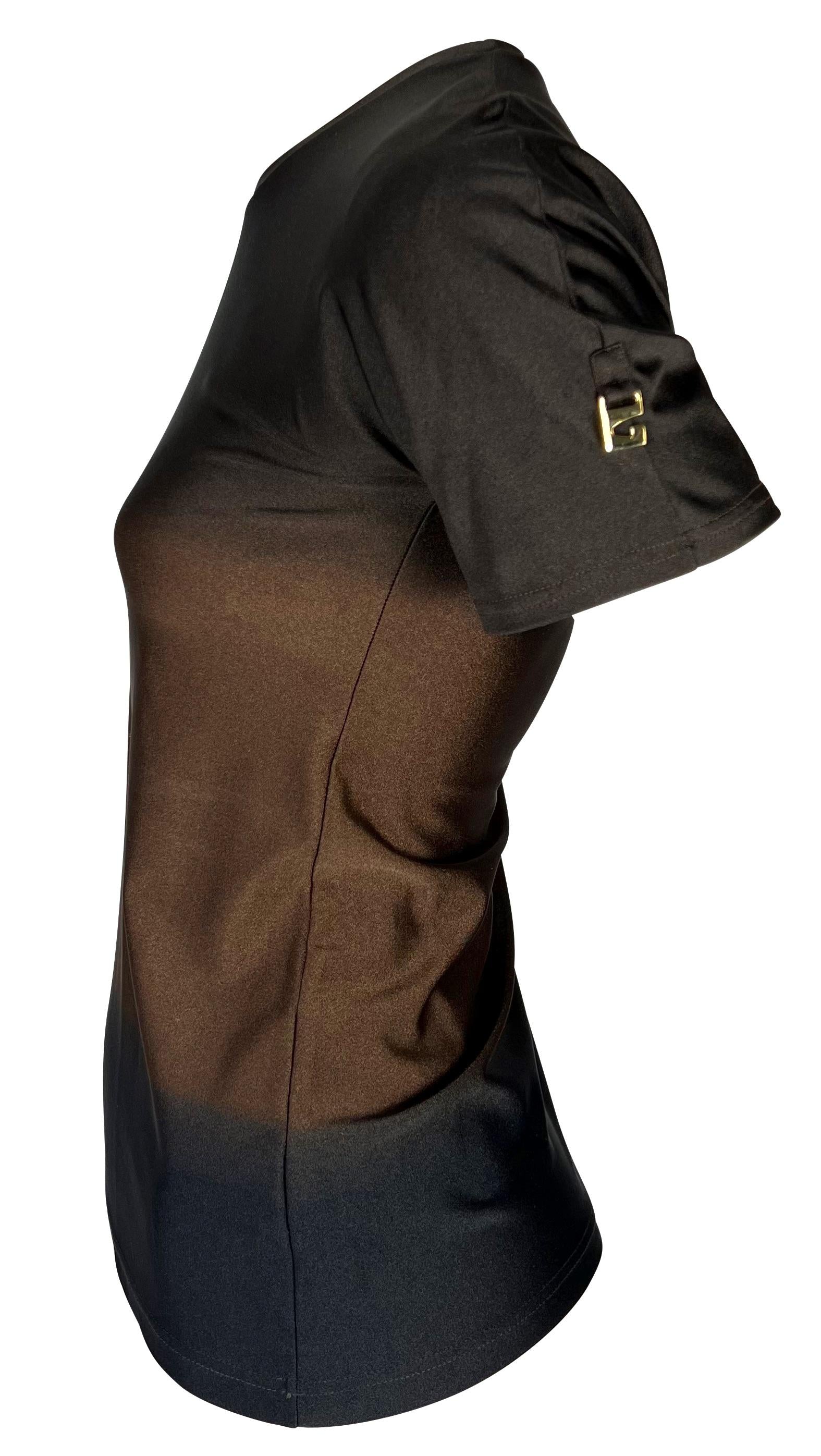 Presenting a brown ombré Gucci t-shirt designed by Tom Ford. From the Spring/Summer 1997 collection, this shirt is composed of a spandex blend material that provides stretch to the top and features a brown to dark brown ombré pattern. The same red Gucci shirt was featured on the May 1997 cover of U.S. Vogue on Georgina Grenville with matching bathing suit bottoms. The top is complete with a gold 'G' metal on the left shoulder.