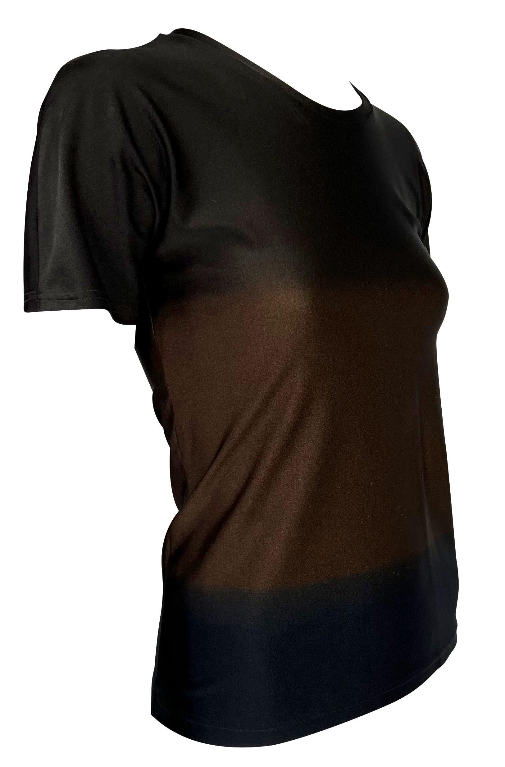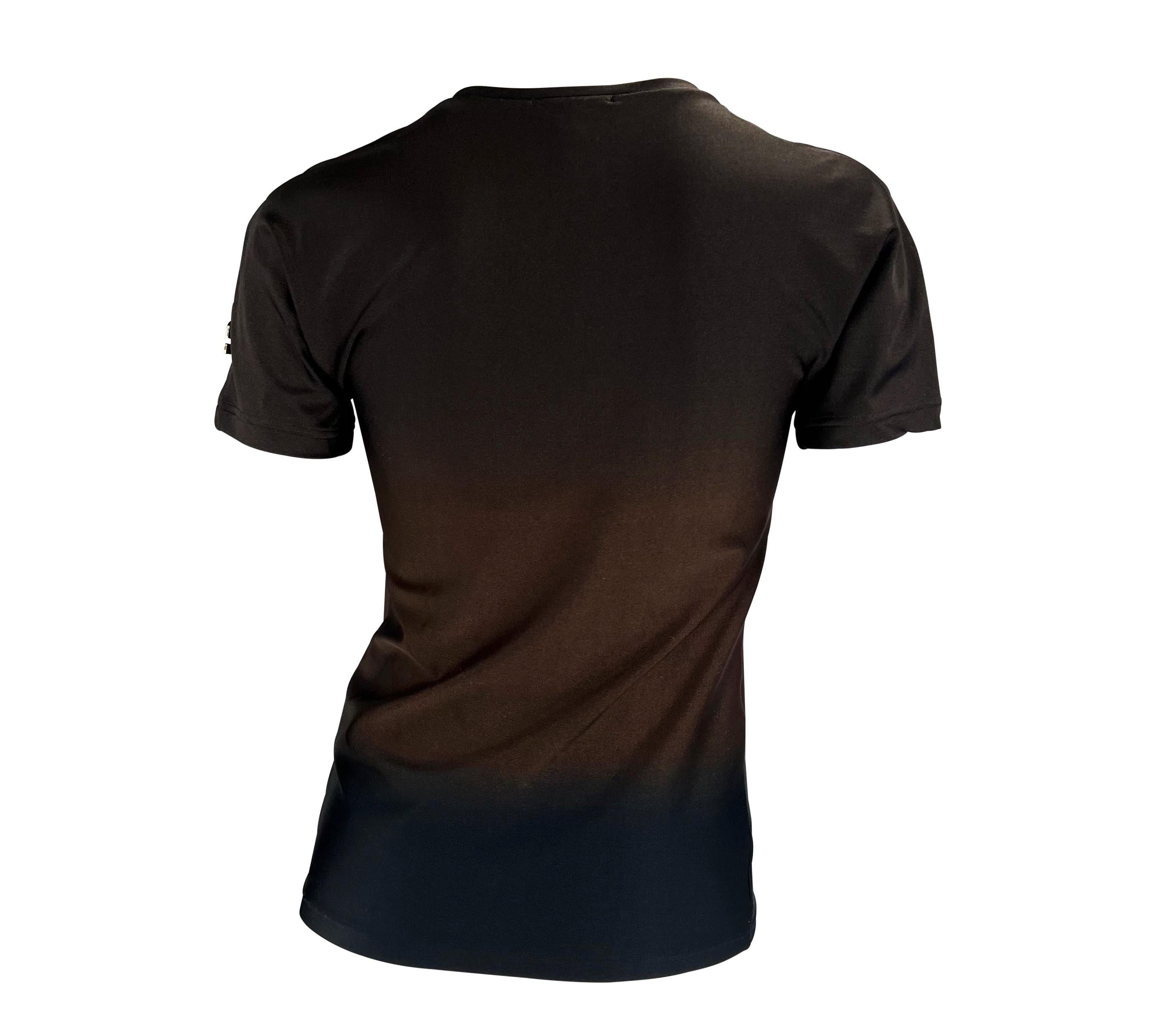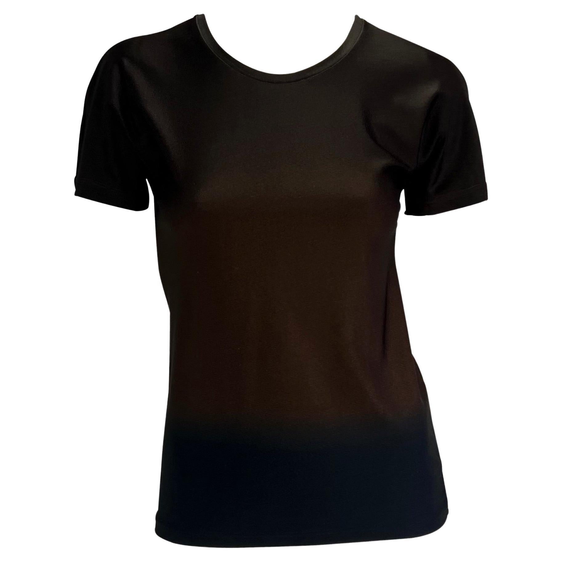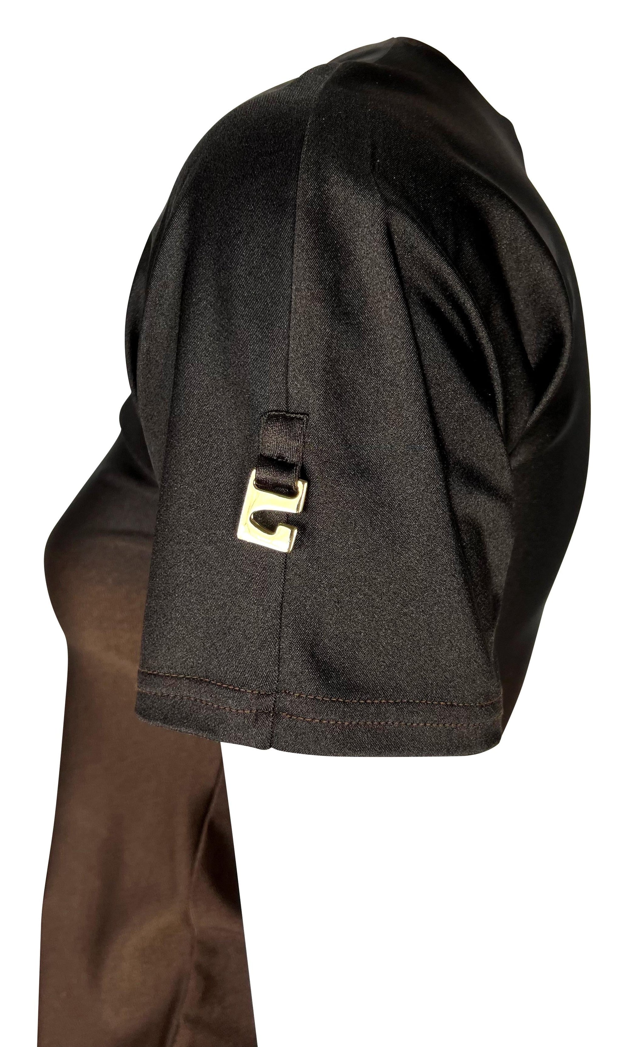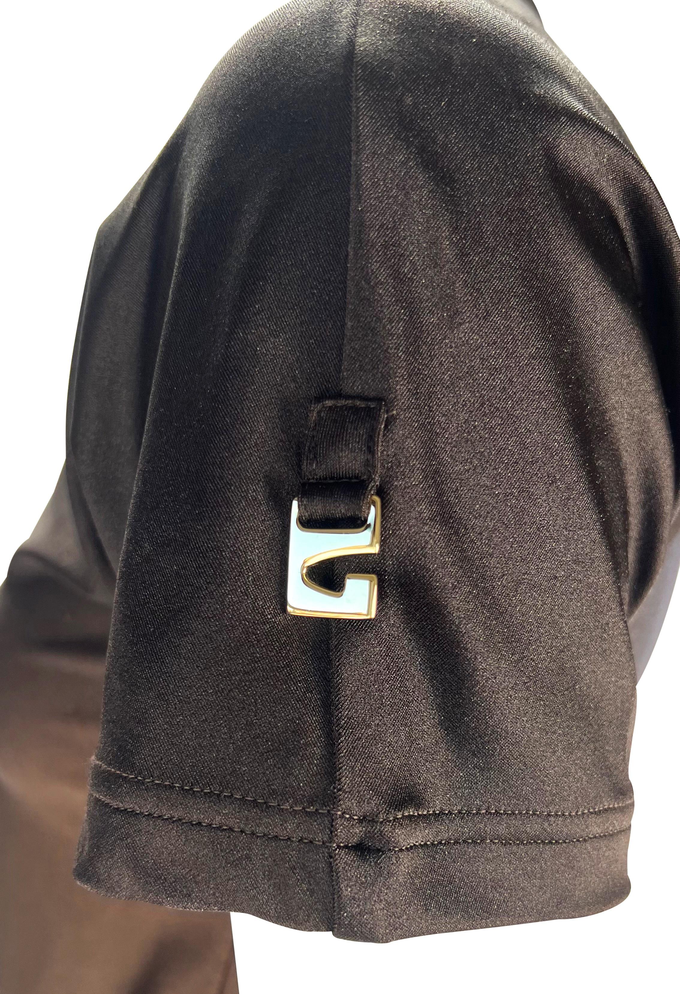 Presenting a brown ombré Gucci t-shirt designed by Tom Ford. From the Spring/Summer 1997 collection, this shirt is composed of a spandex blend material that provides stretch to the top and features a brown to dark brown ombré pattern. The same red Gucci shirt was featured on the May 1997 cover of U.S. Vogue on Georgina Grenville with matching bathing suit bottoms. The top is complete with a gold 'G' metal on the left shoulder.