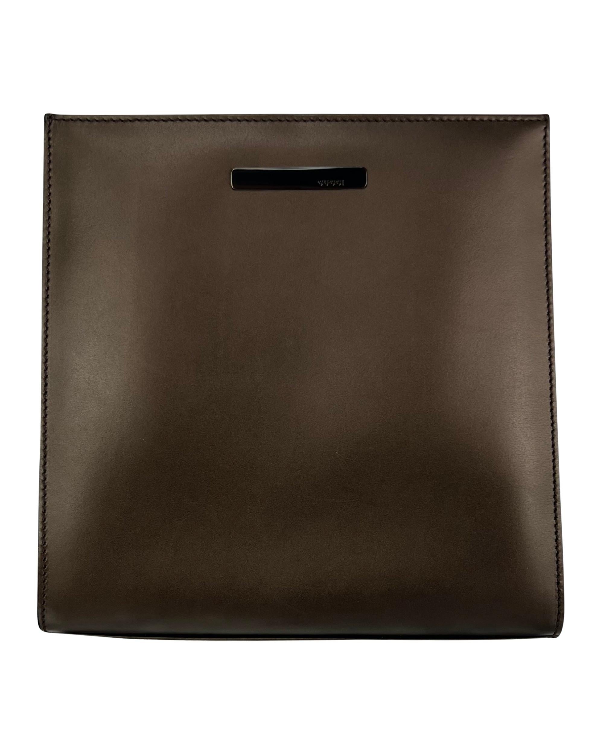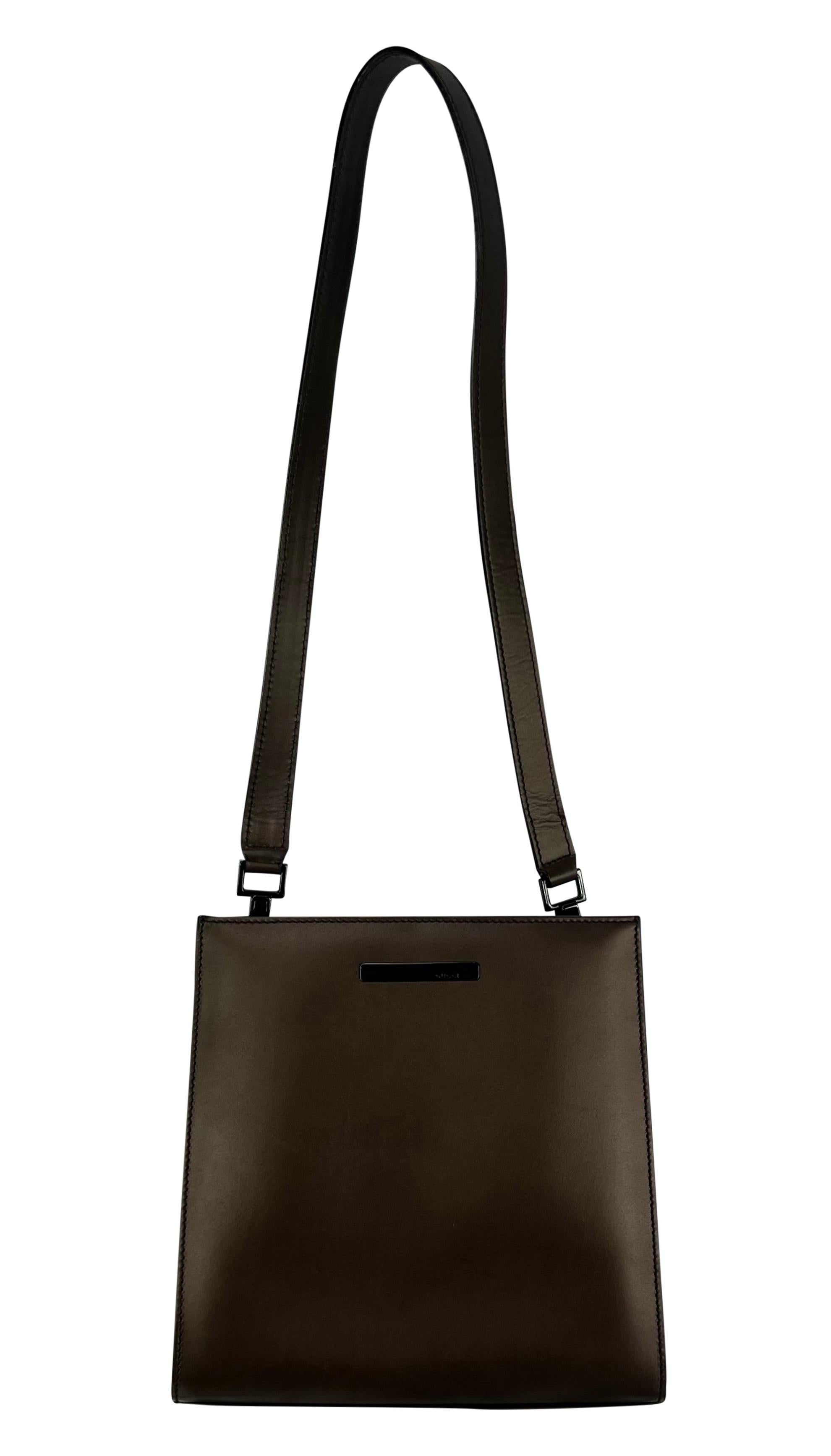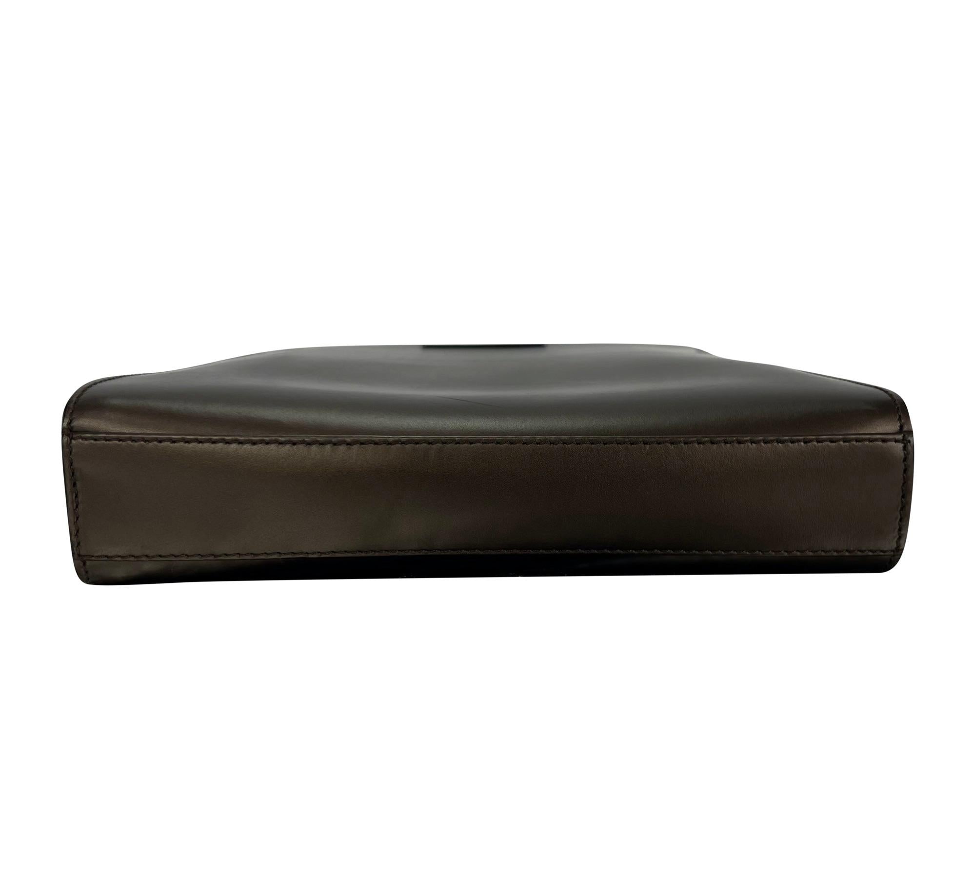 This metallic leather crossbody clutch from Gucci by Tom Ford's Spring/Summer 1997 collection is a versatile piece. It features a sleek design with a convertible function-use it with the structured top handle or as a crossbody using the detachable strap. The handle can also be tucked in for a more streamlined look.