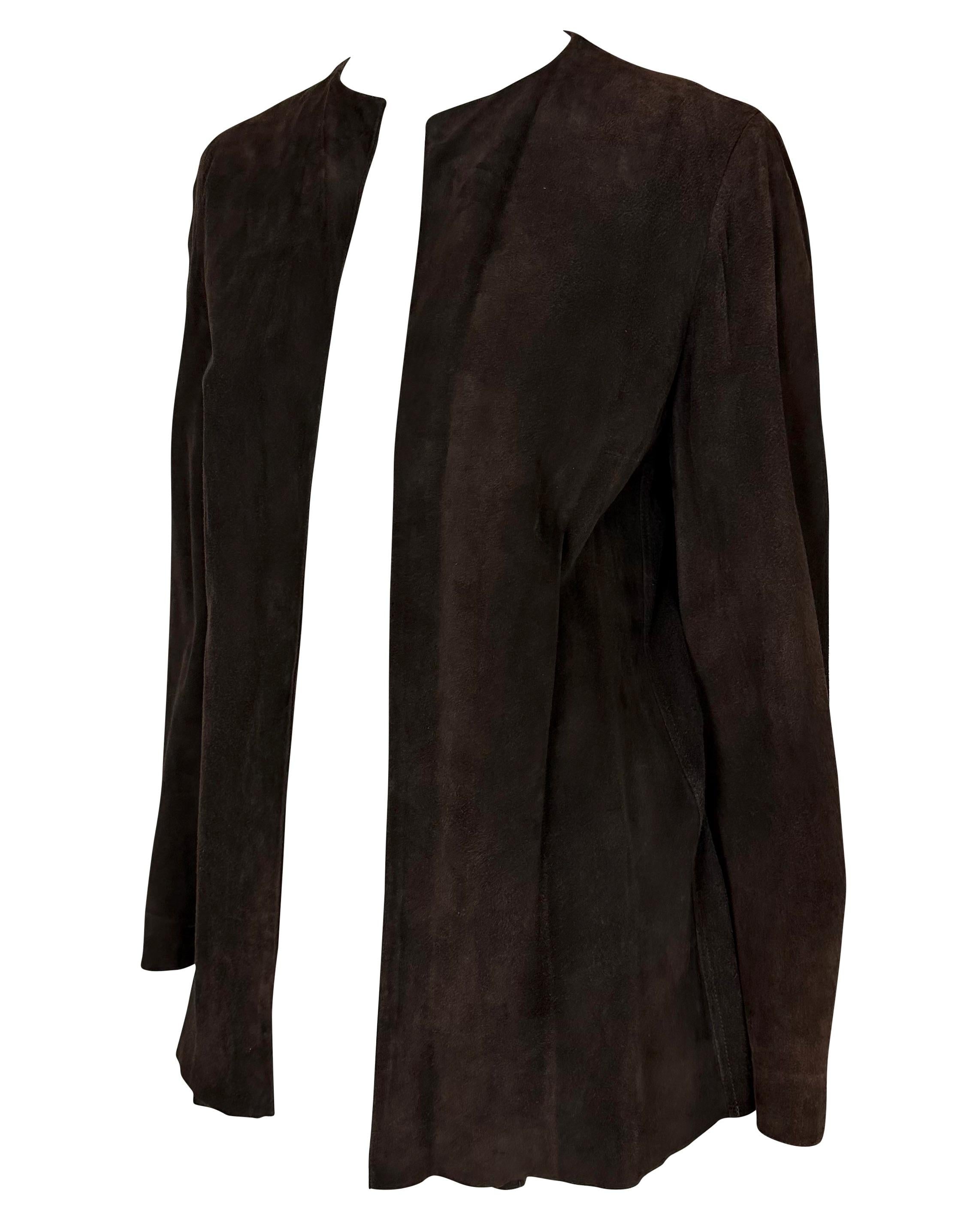 Presenting a fabulous brown suede Gucci open blouse/jacket designed by Tom Ford. From the Spring/Summer 1997 collection, this beautiful blouse or jacket debuted on the season's runway modeled by Naomi Campbell. It is constructed entirely of dark brown suede. This open jacket is the perfect versatile addition to any wardrobe!
