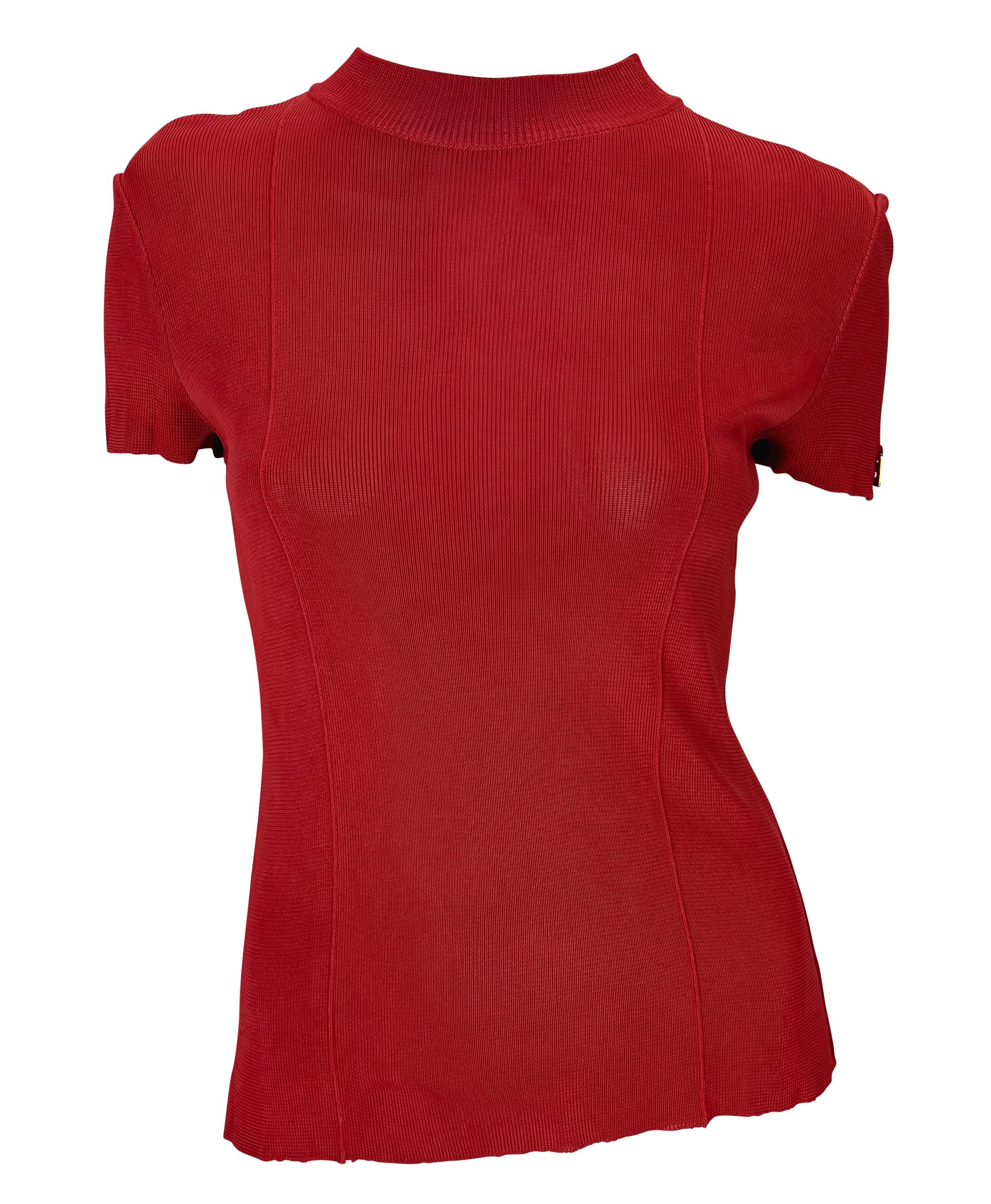 This red knit top from Gucci’s Spring/Summer 1997 collection was designed by Tom Ford. Crafted from stretch viscose, the t-shirt silhouette features a mock neckline and is accented with a gold-tone abstract “G” charm at the sleeve. A sleek wardrobe staple, it reflects Ford’s streamlined 1990s aesthetic for Gucci.