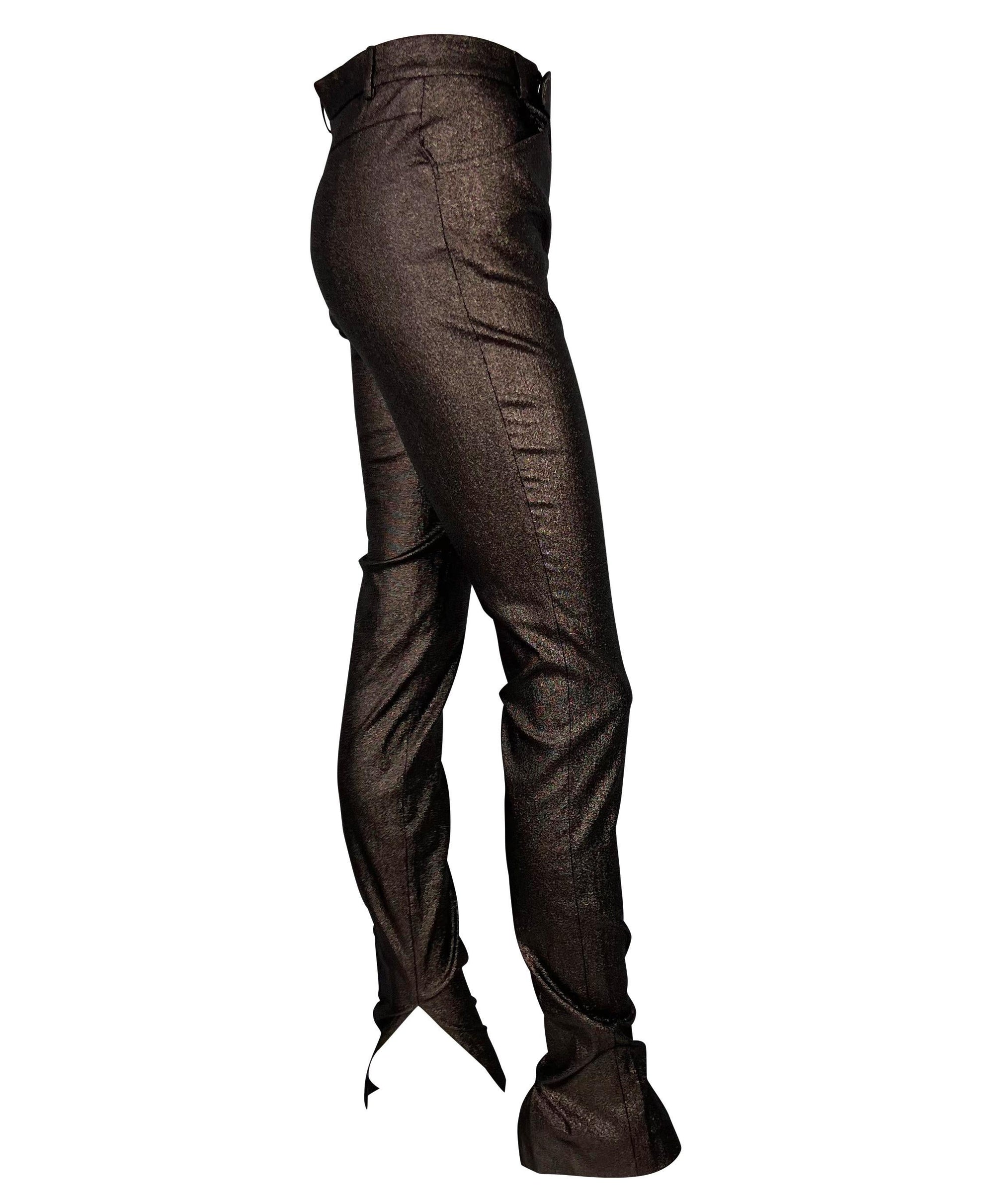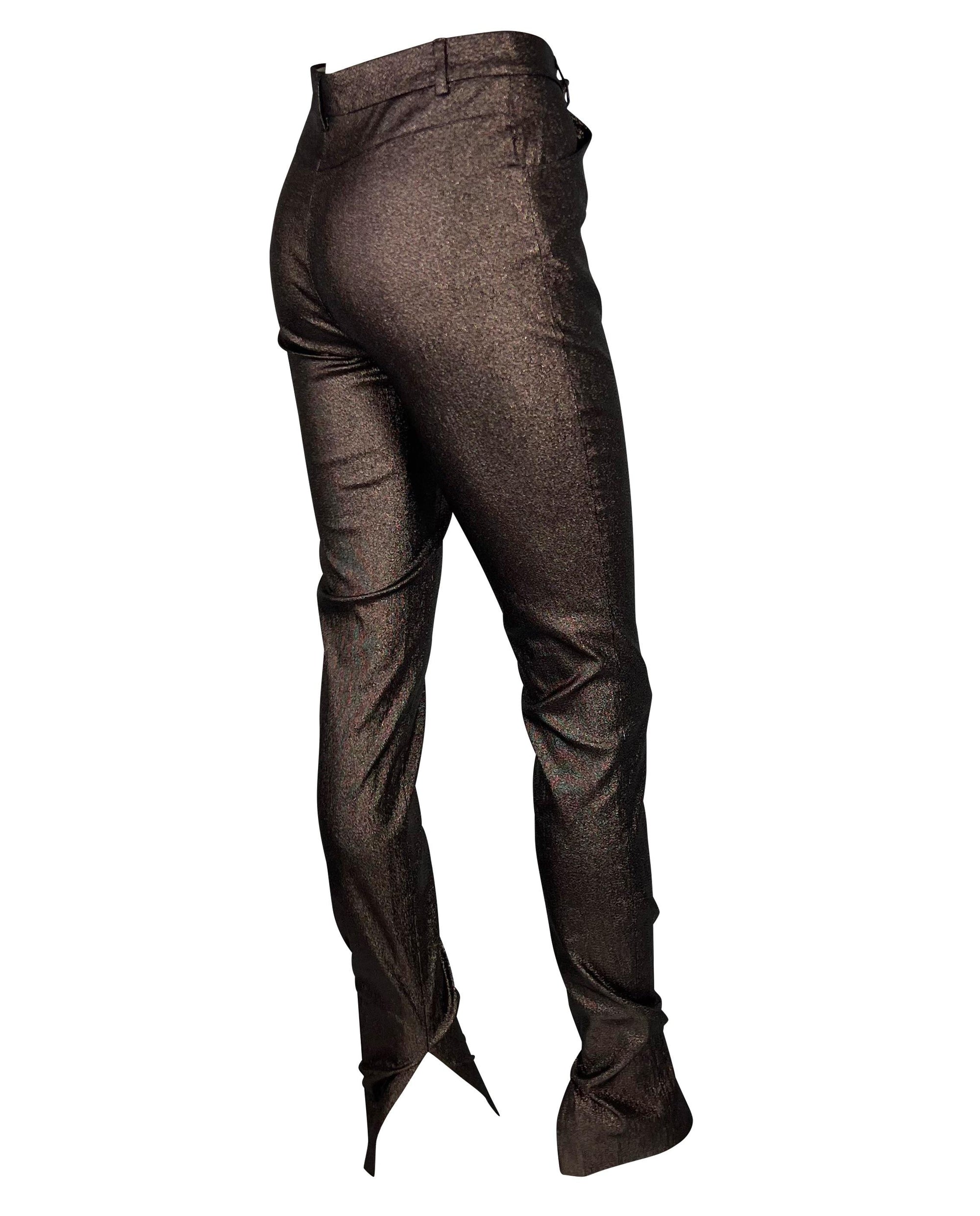 Presenting a glittery pair of dark brown lurex pants designed by Tom Ford for Gucci's Spring/Summer 1997 collection. This pair debuted on the runway on Stella Tennant and was featured in the season's ad campaign on Kiara Kabbukuru, Georgina Grenville, and Jason Fedele, captured by Mario Testino. Slit cuffs give these pants some rock-star flare. Check out our storefront for more rare pieces of Tom Ford Gucci! Available in a smaller size!