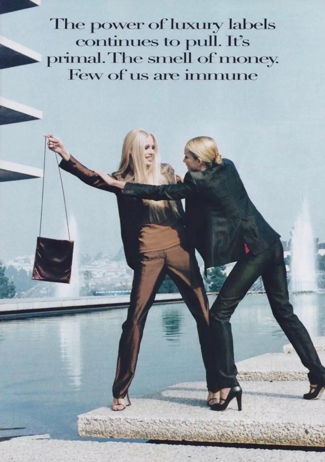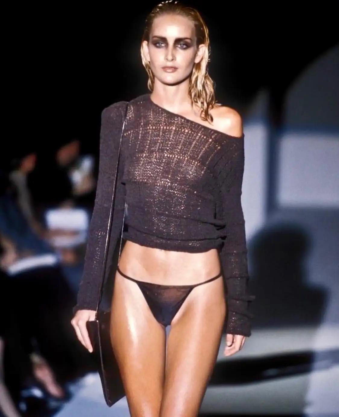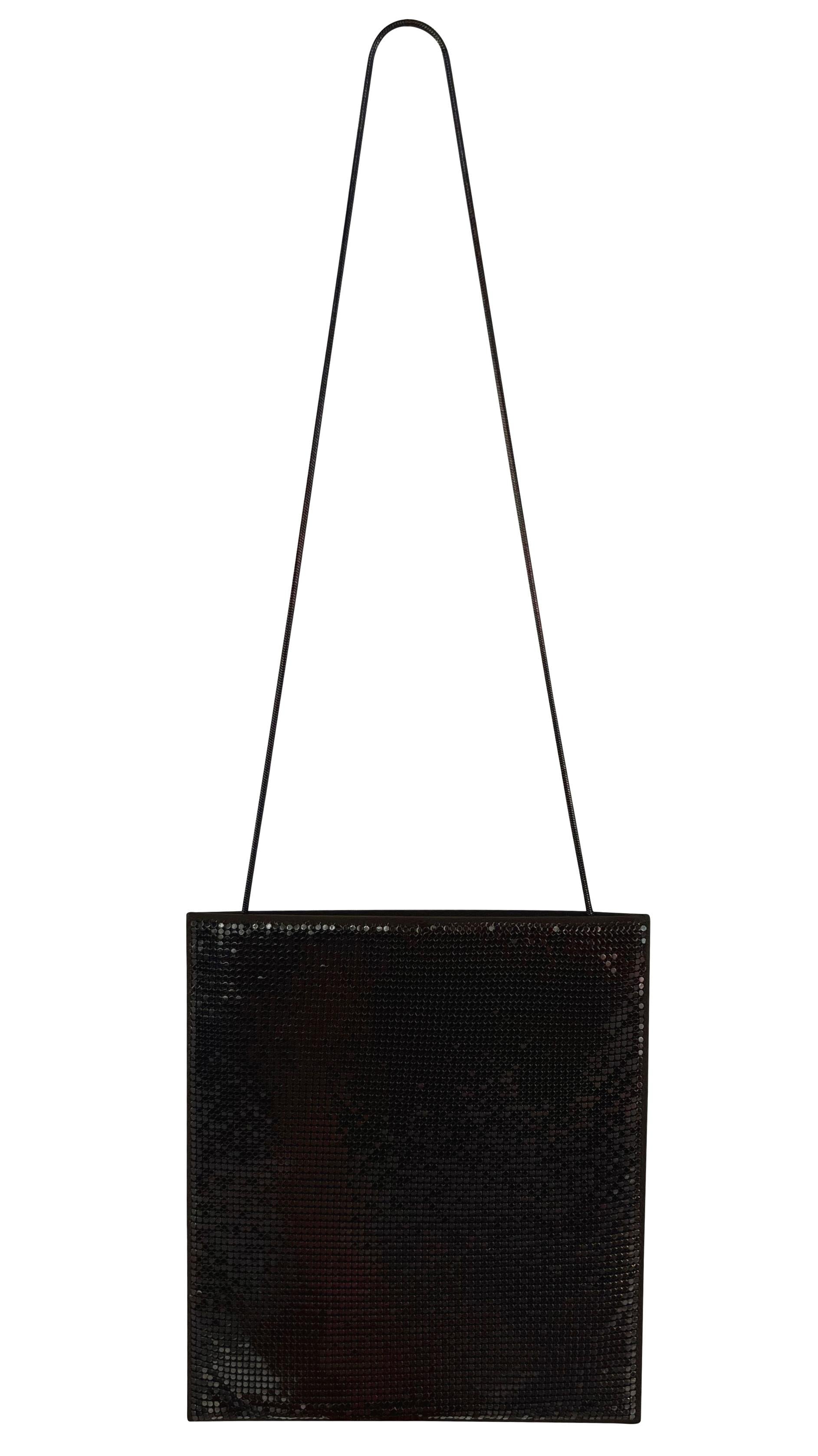 This brown silk and ombré chainmail crossbody was designed by Tom Ford for Gucci's Spring/Summer 1997 runway collection. It made its debut on Georgina Grenville, alongside the collection's iconic GG logo g-string thong. The piece was also featured in the February 1997 issue of Vogue, shot by Ellen von Unwerth. Explore our storefront for more rare runway pieces!
