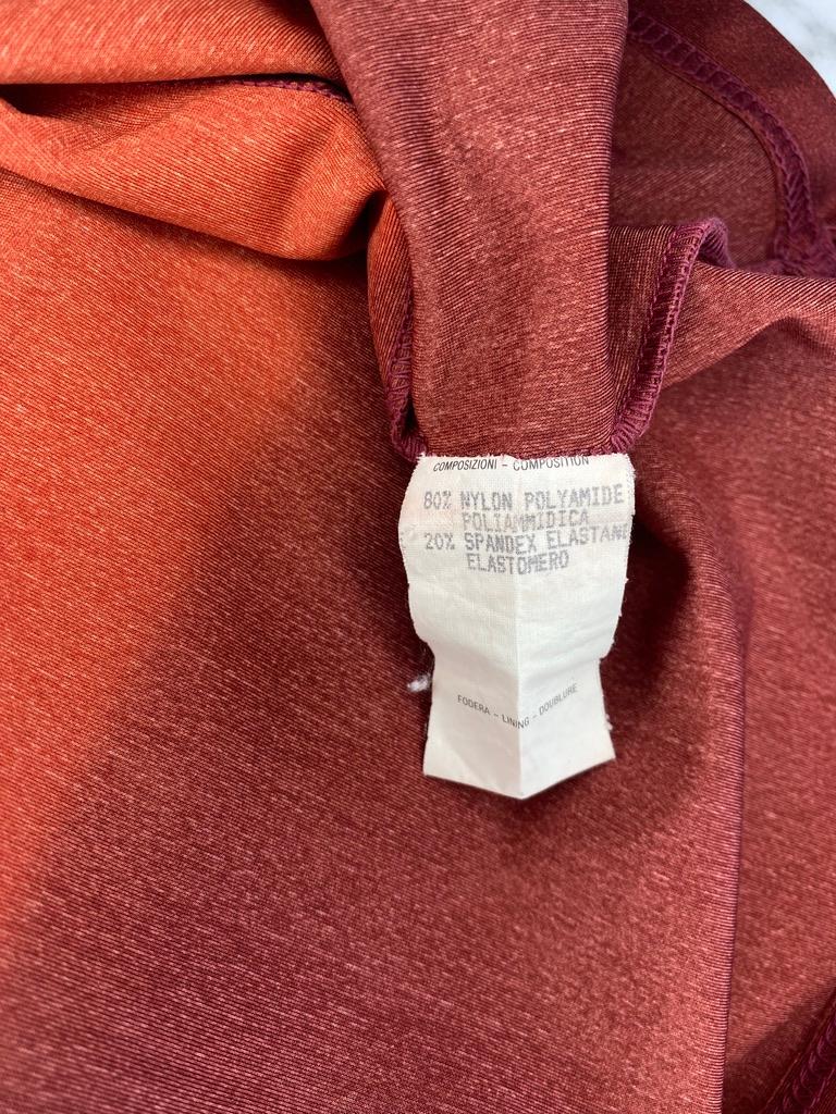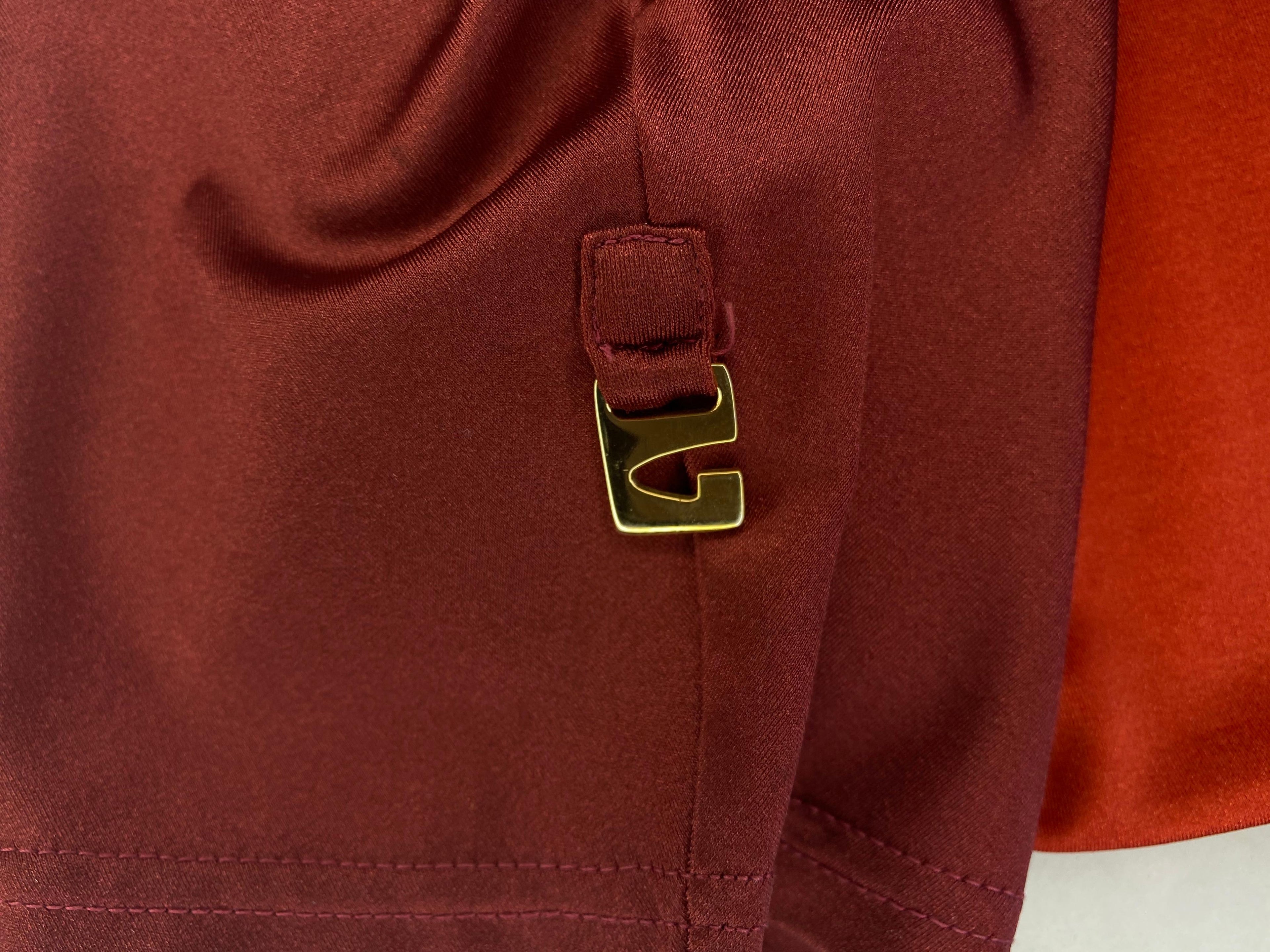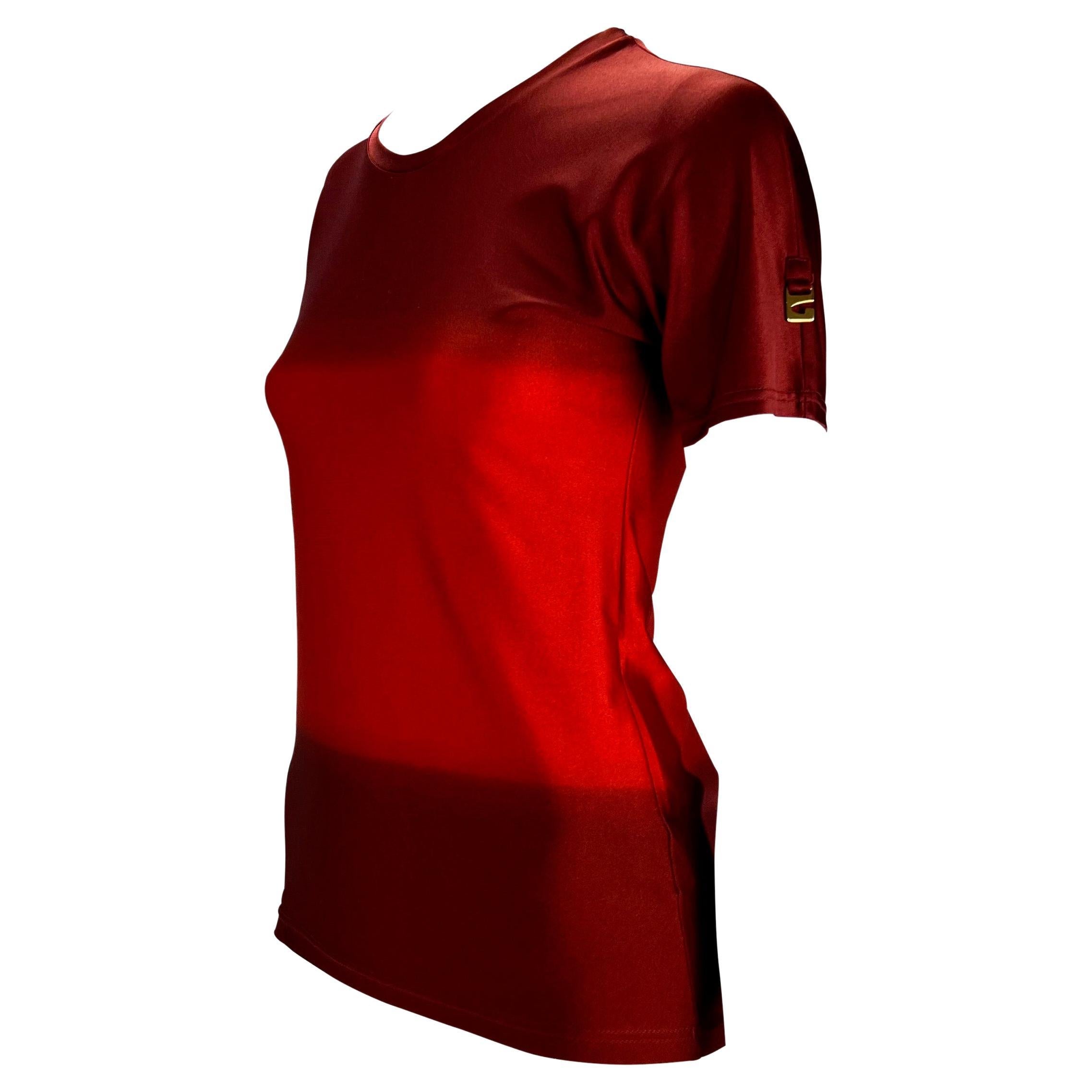 Presenting a red ombré Gucci t-shirt designed by Tom Ford. From the Spring/Summer 1997 collection, this shirt is composed of a spandex blend material that provides stretch to the top and features a burgundy to bright red ombré pattern. This Gucci shirt was featured on the May 1997 cover of U.S. Vogue on Georgina Grenville with matching bathing suit bottoms. The top is complete with a metal gold 'G' on the left shoulder.