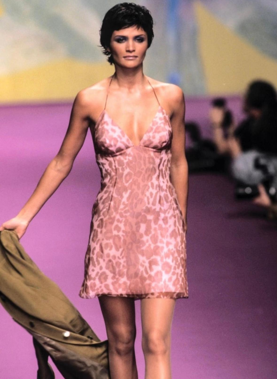 This orange leopard-print mini dress from Jacques Fath’s Spring/Summer 1997 collection captures the effortless glamour of late-’90s French demi-couture. A pink version debuted on the runway as look 1, modeled by Helena Christensen. Expertly hand-crafted, the silk dress features an orange base overlaid with sheer leopard-print chiffon, creating depth and movement. The halter neck ties delicately at the neck, while a flared hem and v-neckline complete the feminine silhouette. A standout example of refined craftsmanship, this piece embodies the timeless allure of a heritage brand.