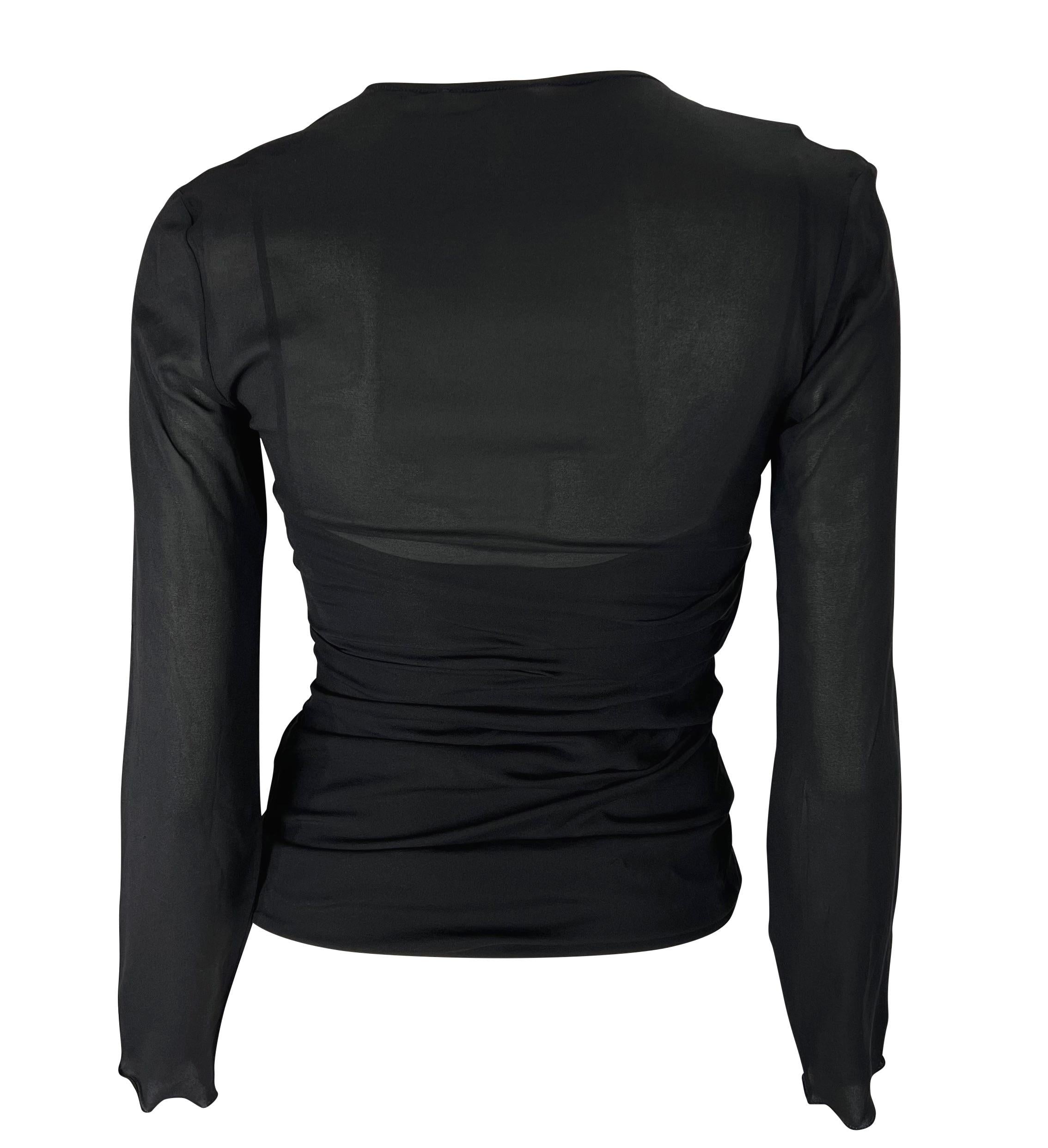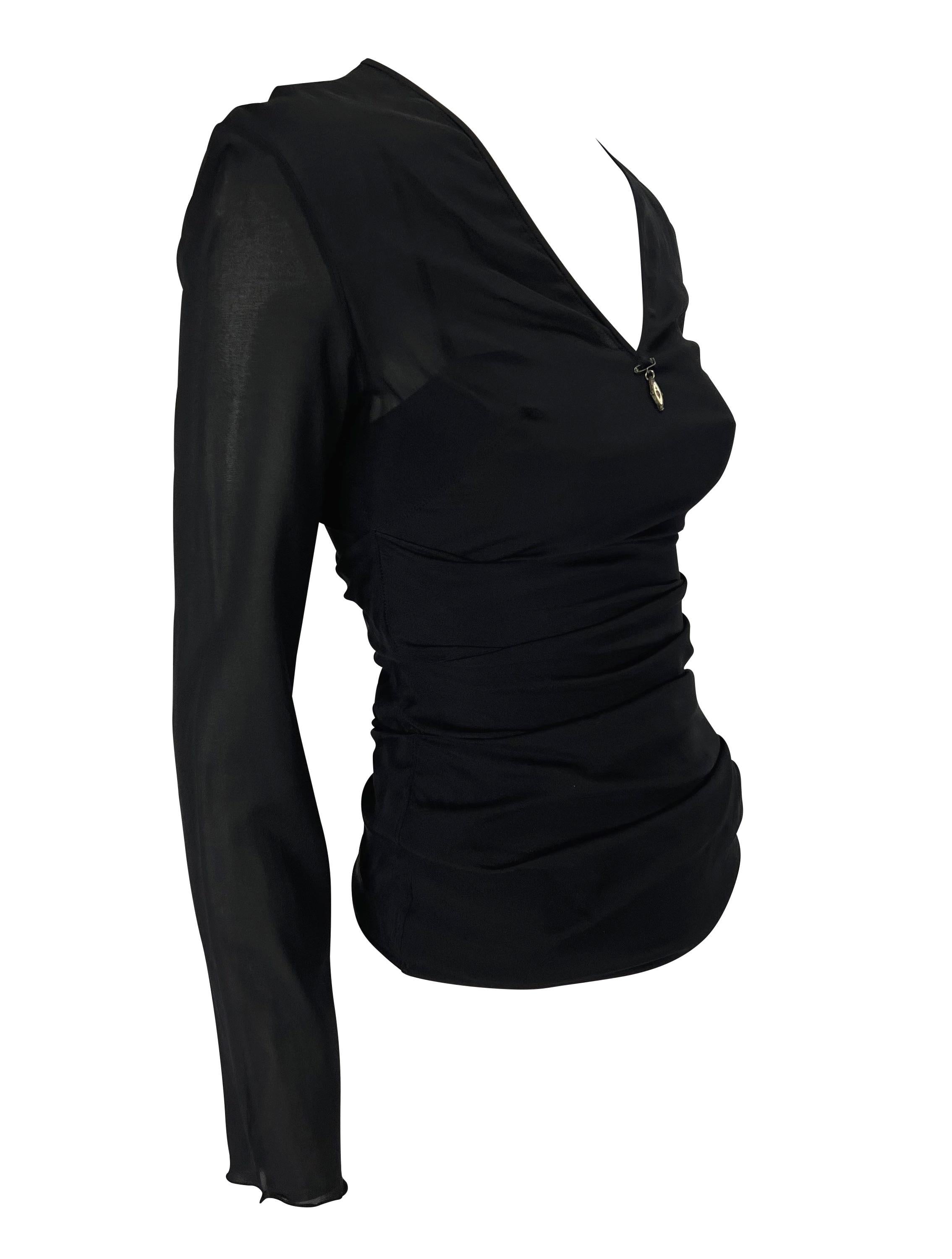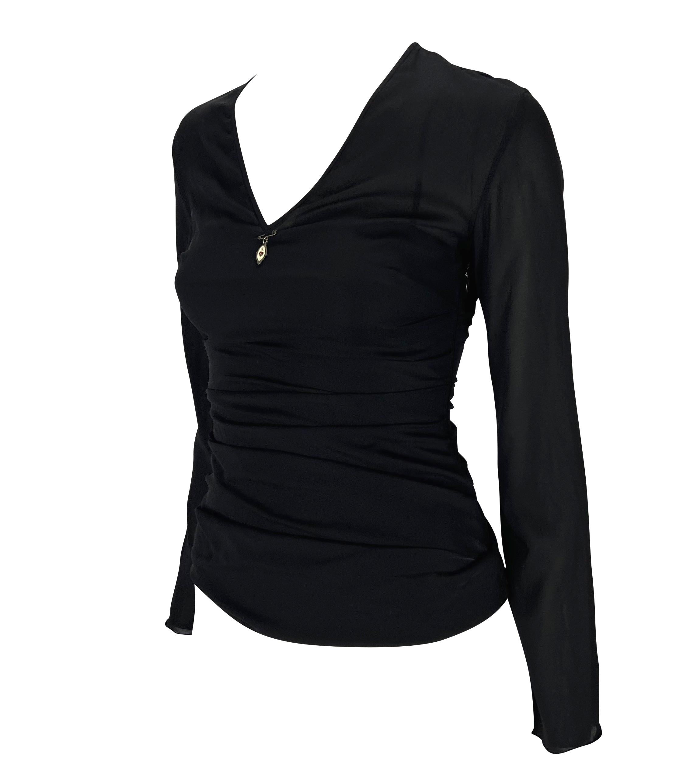 This black semi-sheer long-sleeve top from Dolce & Gabbana’s Spring/Summer 1998 “Stromboli” collection is a rare archival piece. The design features intentional ruching through the body, a plunging V-neckline, and an integrated internal tank. A small pin with a dangling charm accents the base of the neckline, adding a signature Dolce & Gabbana detail. Both sensual and refined, this vintage top reflects the brand’s late-1990s aesthetic.