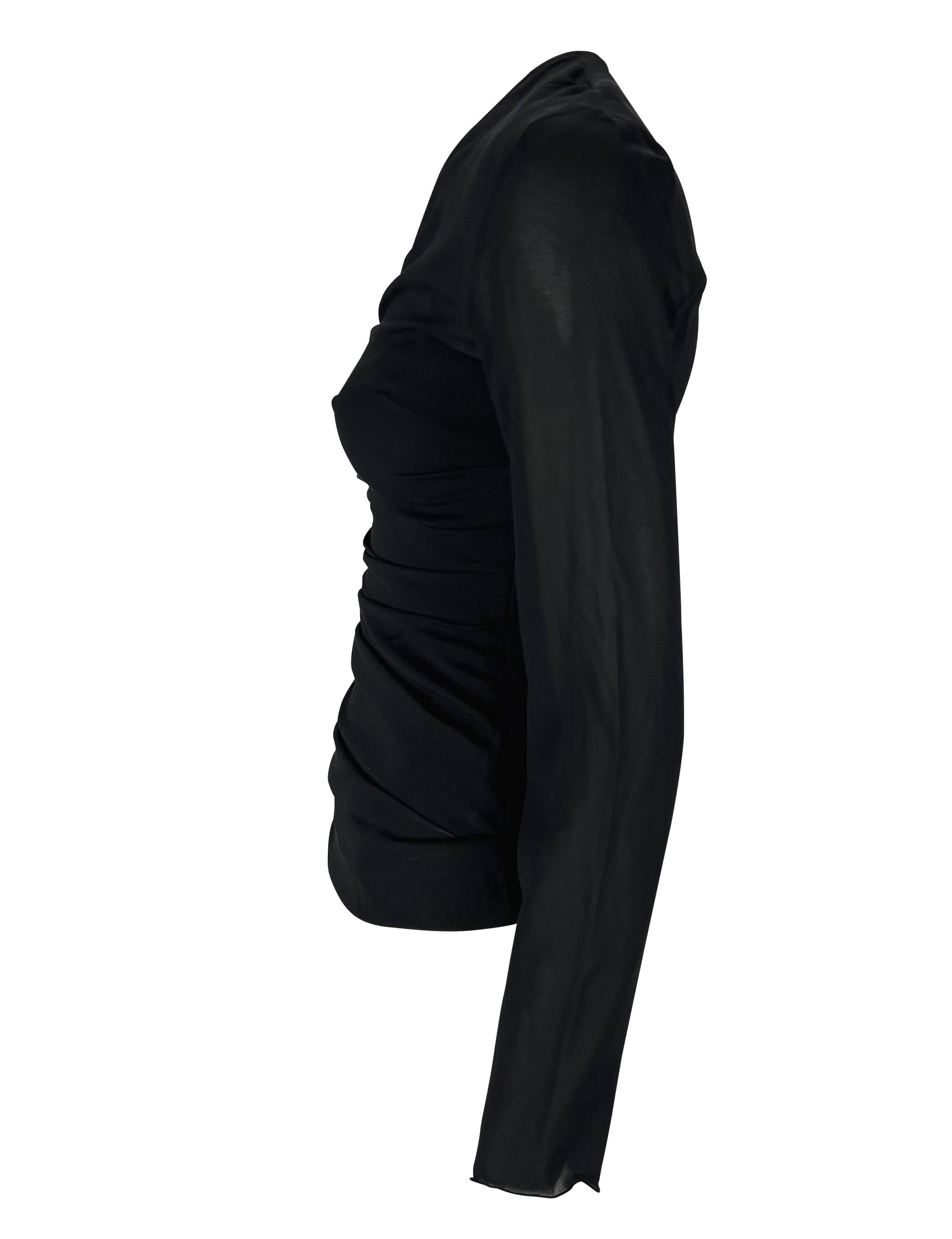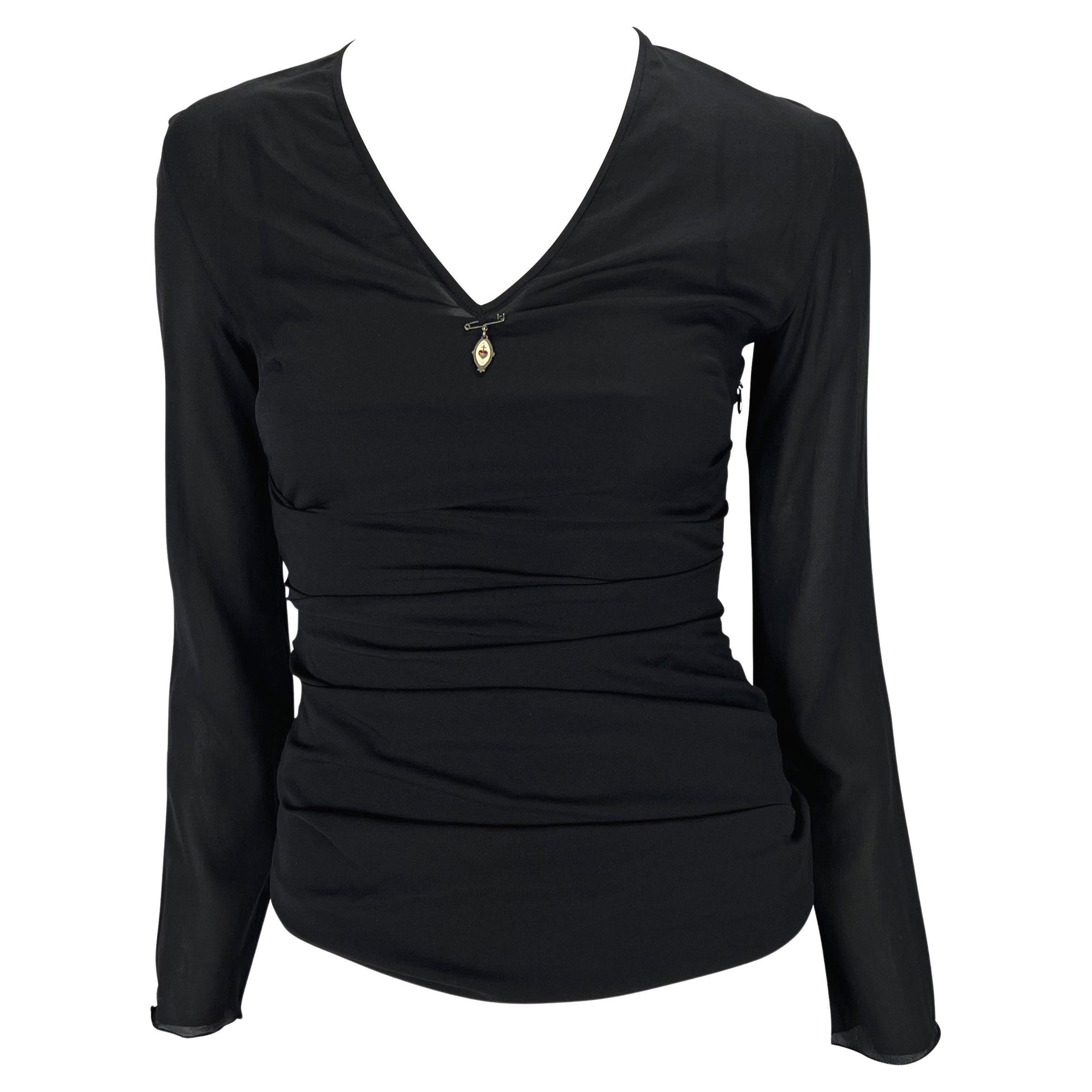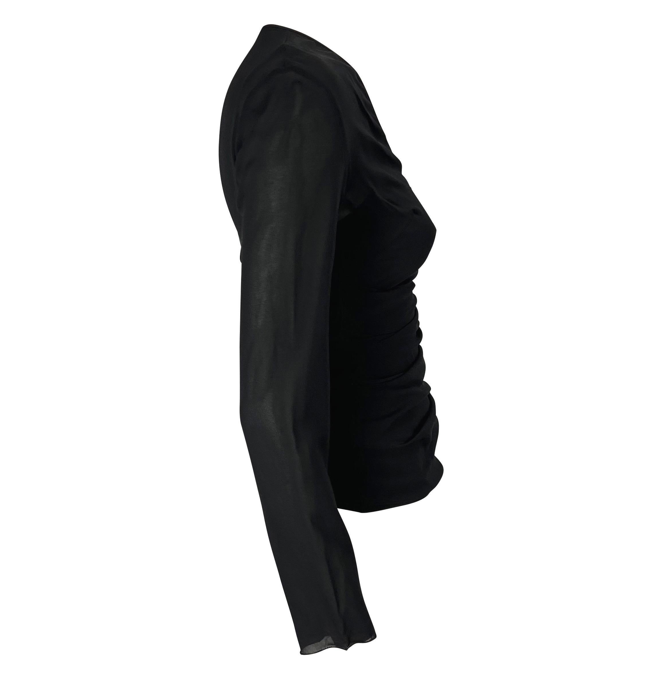 This black semi-sheer long-sleeve top from Dolce & Gabbana’s Spring/Summer 1998 “Stromboli” collection is a rare archival piece. The design features intentional ruching through the body, a plunging V-neckline, and an integrated internal tank. A small pin with a dangling charm accents the base of the neckline, adding a signature Dolce & Gabbana detail. Both sensual and refined, this vintage top reflects the brand’s late-1990s aesthetic.