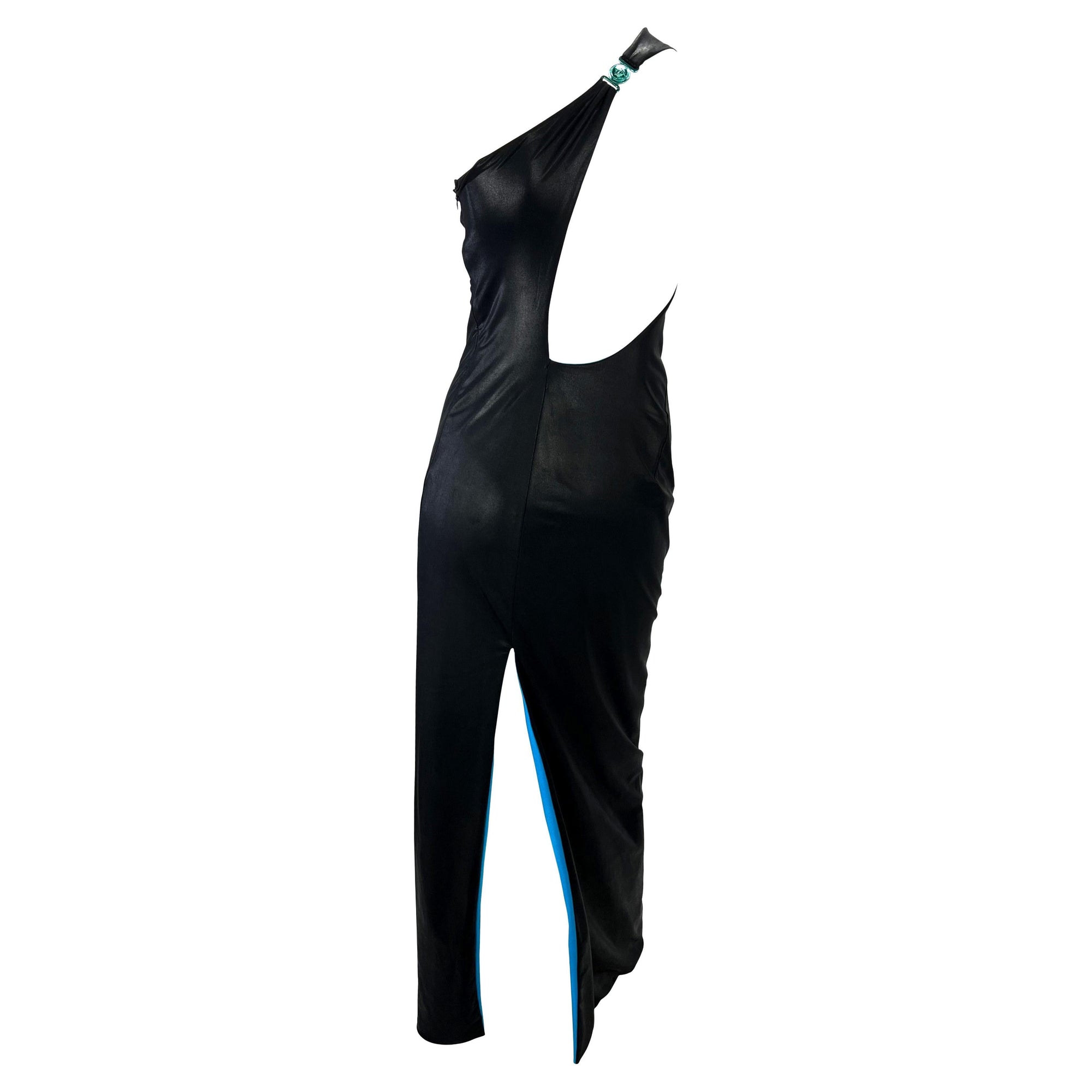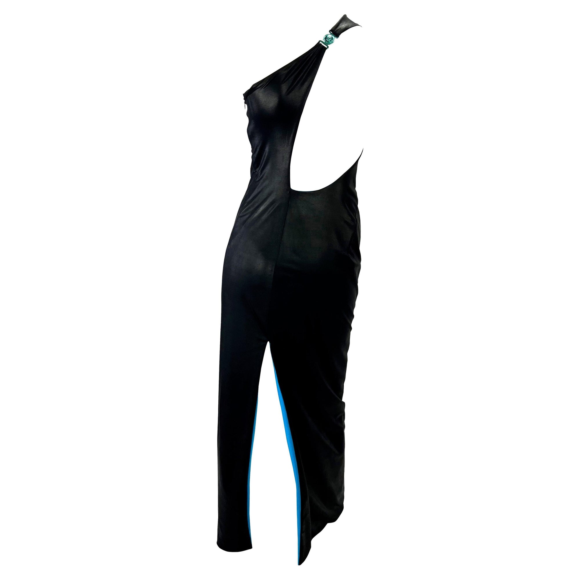 Presenting an incredible black and electric blue Gianni Versace Couture stretch gown, designed by Donatella Versace. From the Spring/Summer 1998 collection, this liquid-looking gown debuted with a pink/red lining on the season's runway and was also featured in the season's ad campaign modeled by Erin O'Connor and photographed by Richard Avedon. This beautiful gown features a single shoulder strap, asymmetric seams, an exposed back, and a high slit at the back. The dress is made complete with a vibrant blue Versace Medusa metal detail at the back. Add this sought-after and rare piece of Versace by Donatella to your wardrobe or collection.