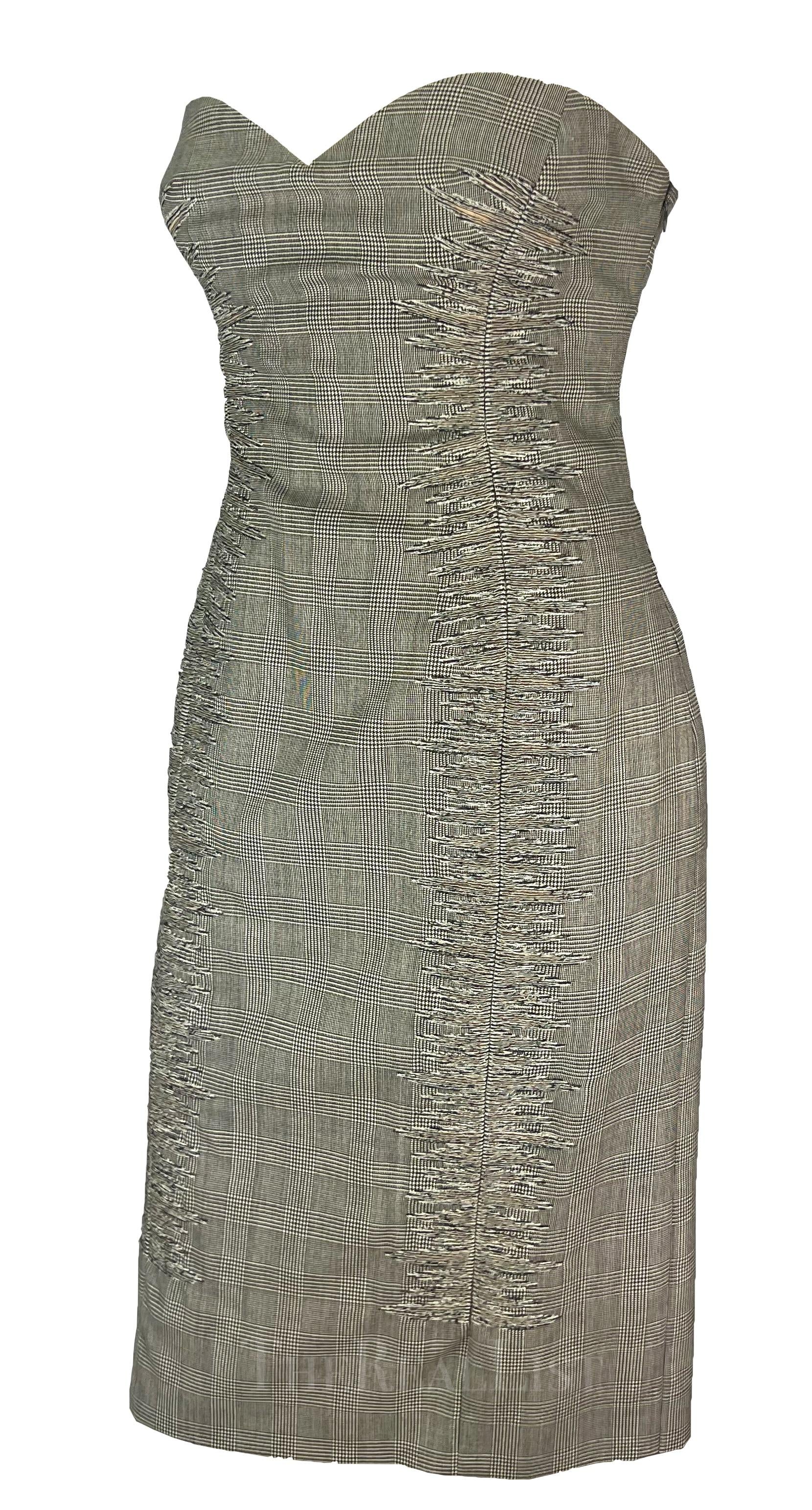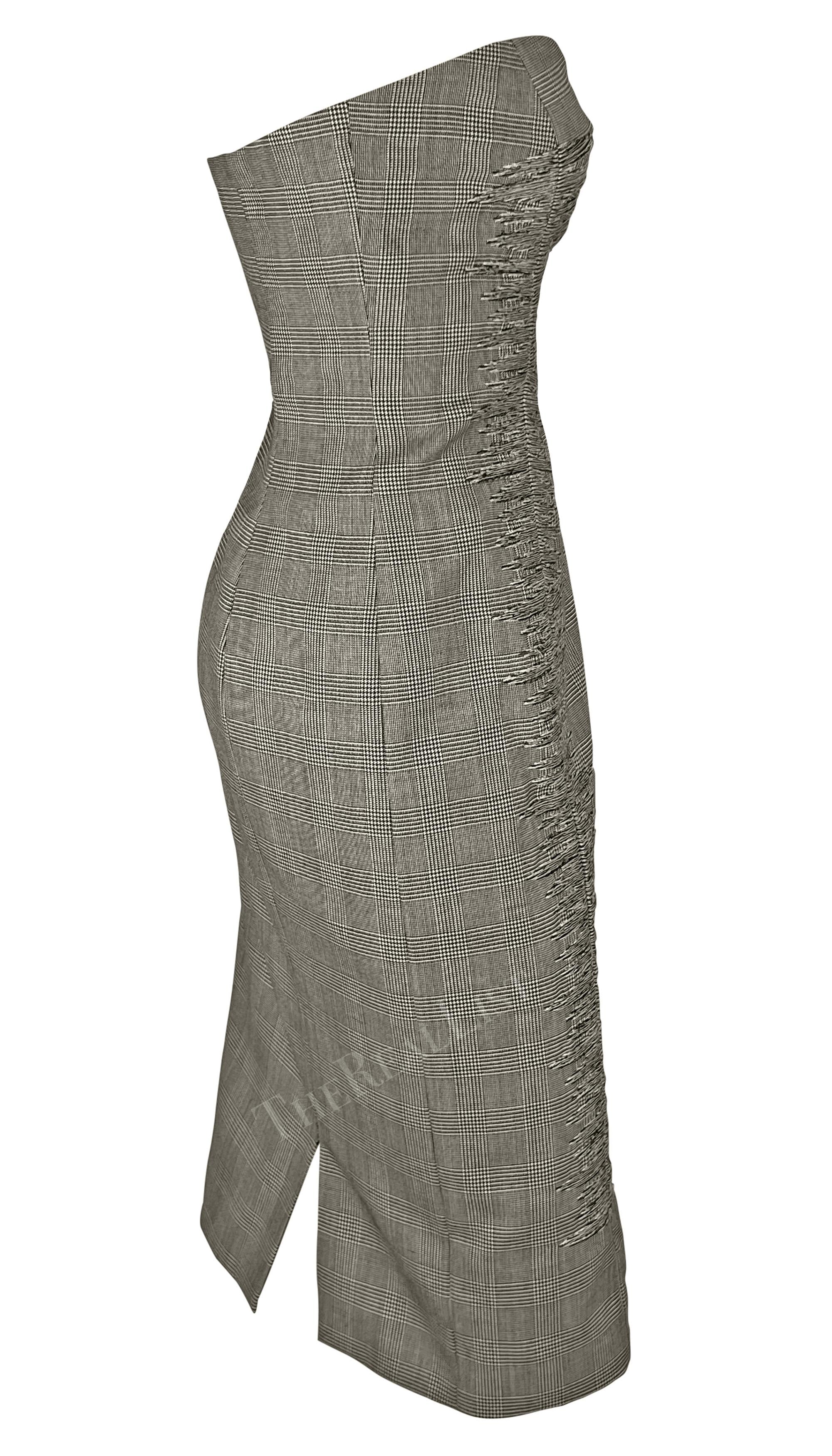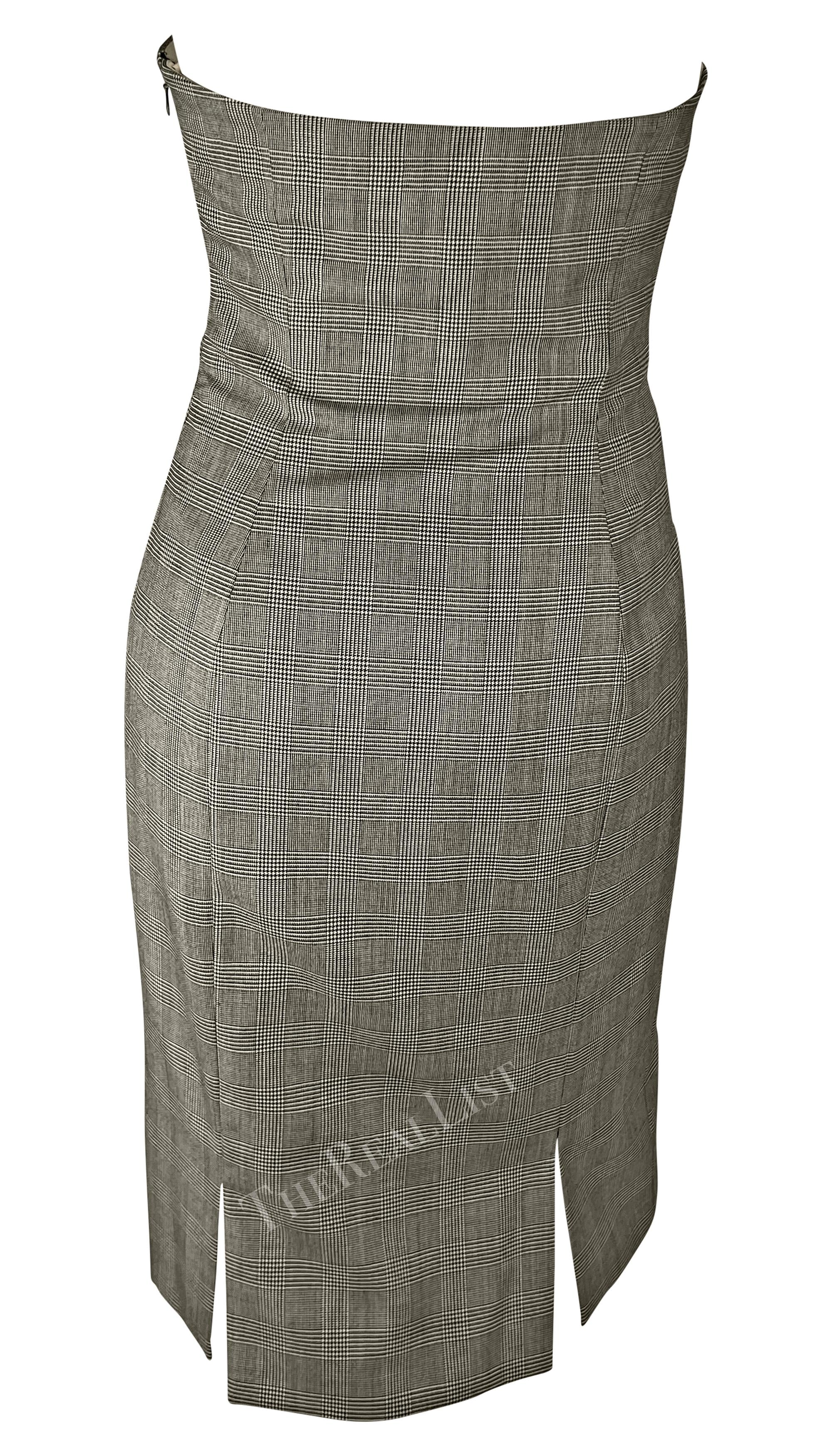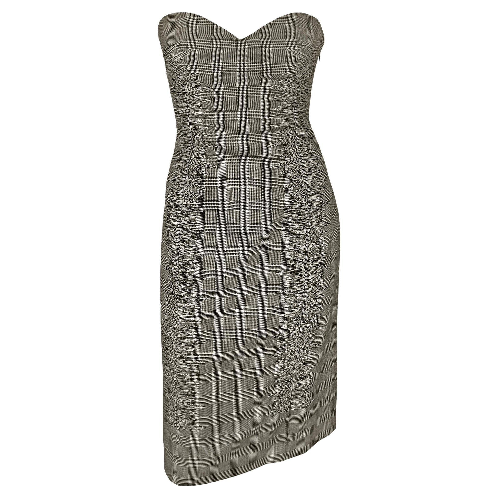 Presenting a chic grey houndstooth Gianni Versace strapless dress, designed by Donatella Versace. From the Spring/Summer 1998 collection, Donatella's first collection. after. Gianni's death, this dress debuted as one of two opening looks on the season's runway, modeled by Kate Moss, and was highlighted in the season's ad campaign, modeled by Erin O'Connor and captured by Richard Avedon. This fabulous strapless dress showcases a classic sweetheart neckline, a notable houndstooth pattern, internal corset and sheer embroidery at the front. The perfect addition to any Versace collector or fashion enthusiast's wardrobe!