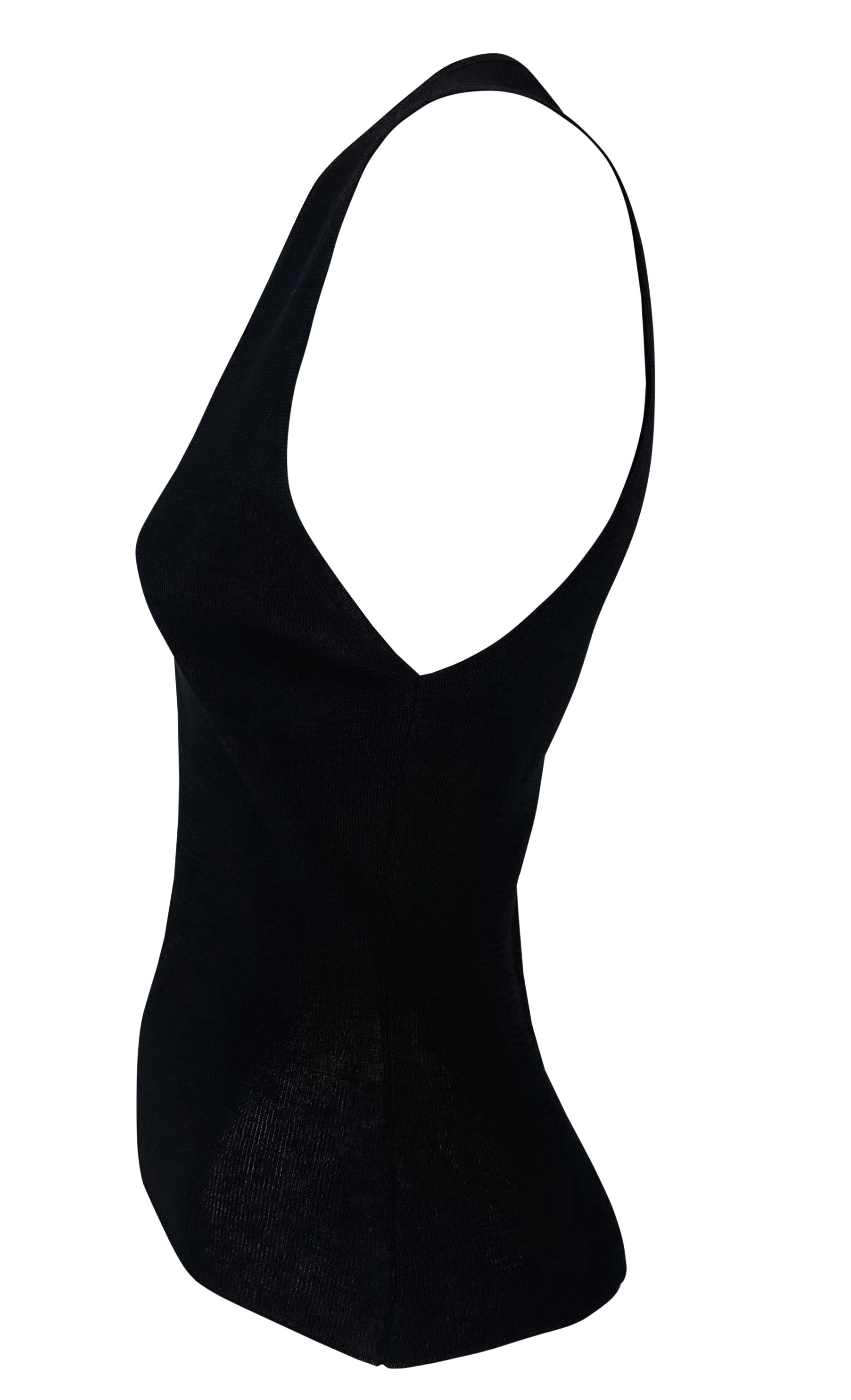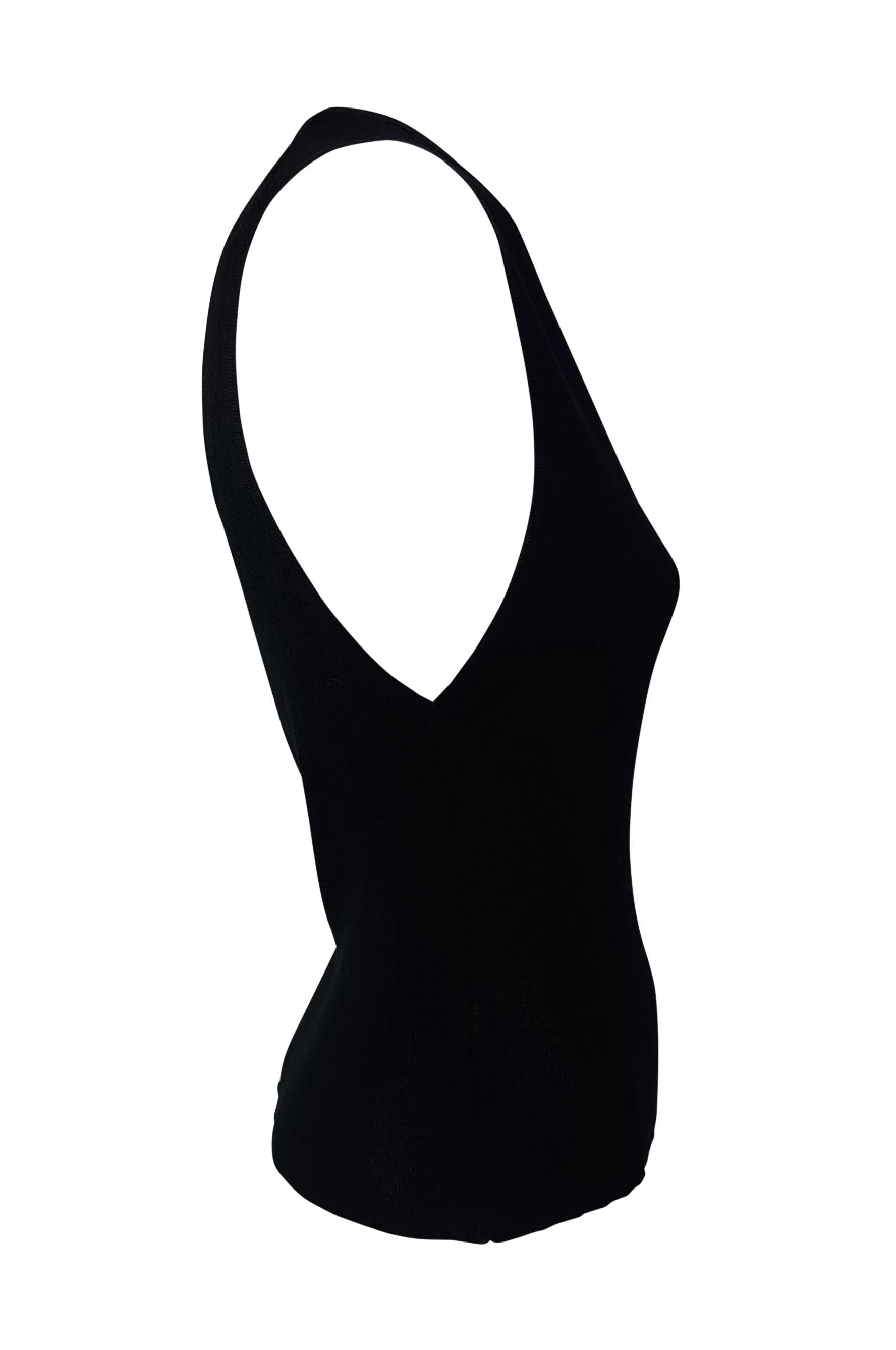 This chic black sleeveless knit top by Gucci, designed by Tom Ford for the Spring/Summer 1998 season, features a deep plunging v-neckline. Simple yet stylish, it's a timeless piece from Ford's era at Gucci.