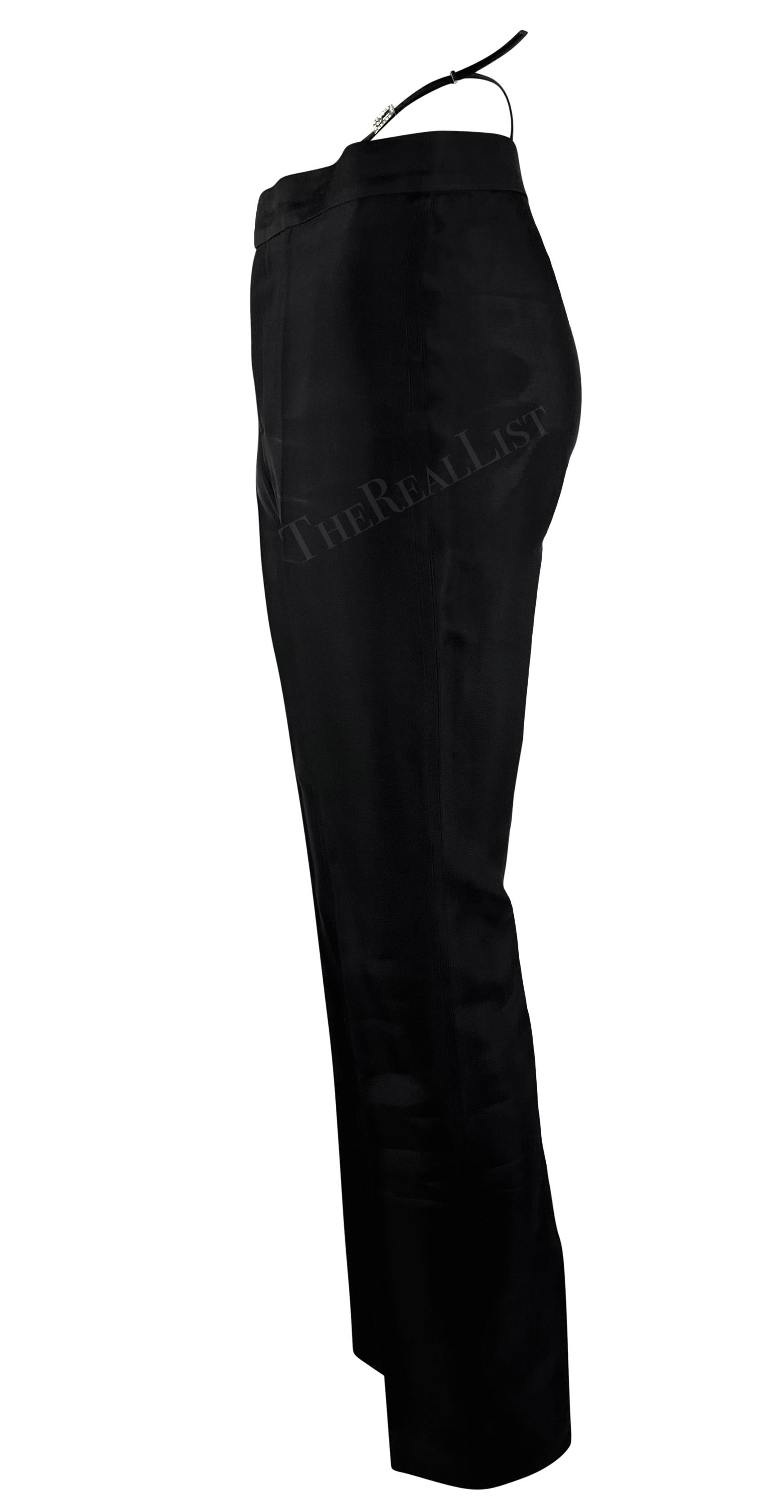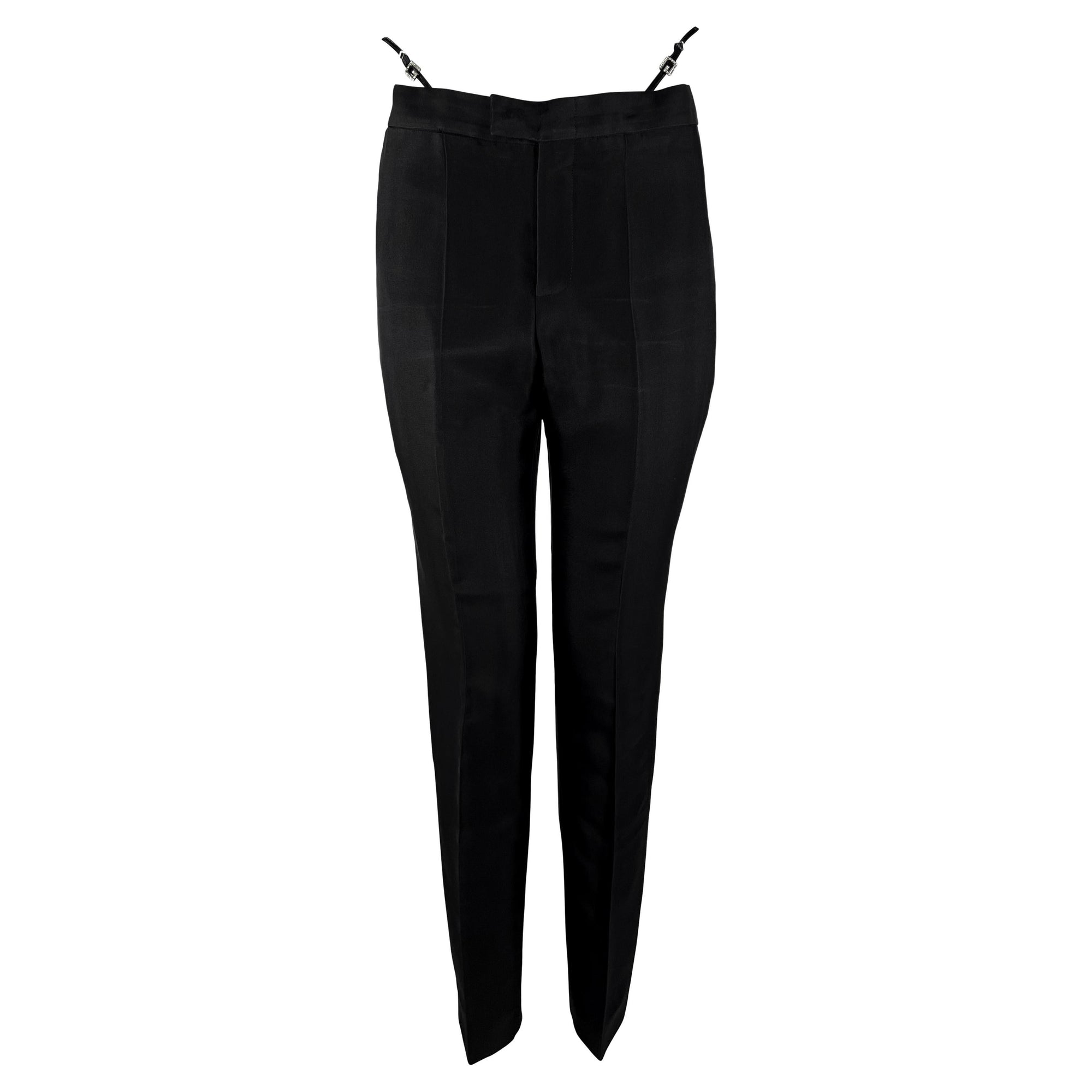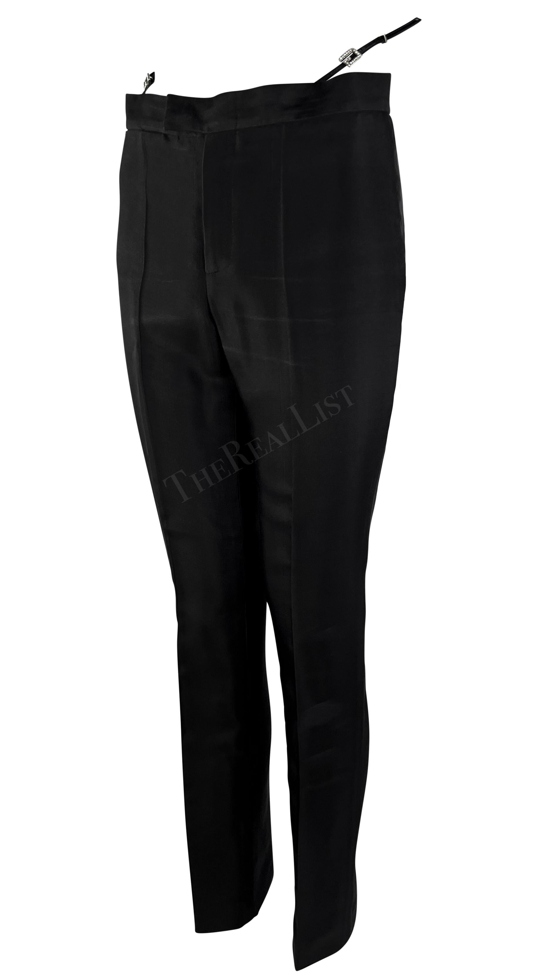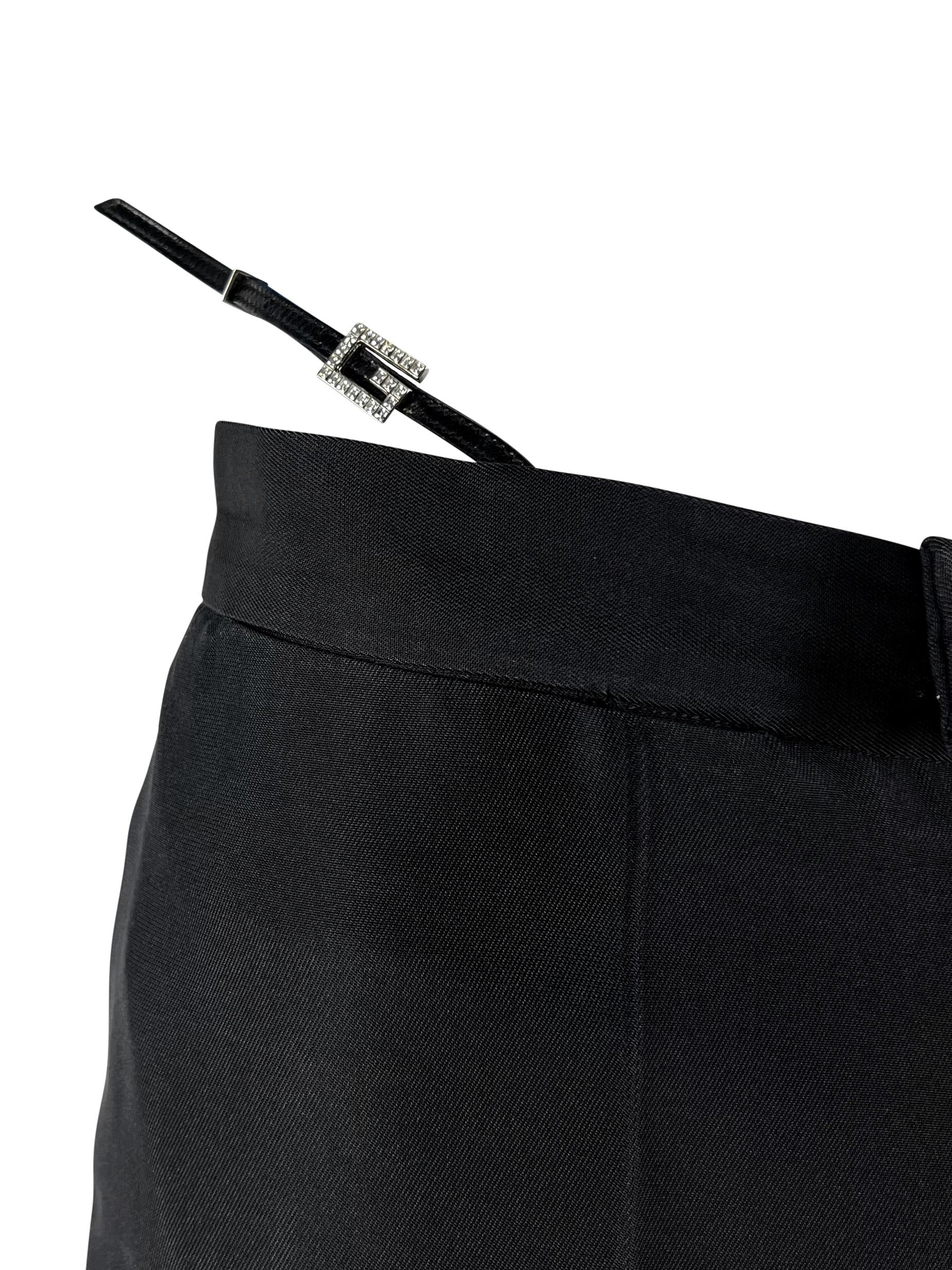 From Gucci’s Spring/Summer 1998 collection by Tom Ford, these black tailored pants feature faux exposed thong straps finished with square rhinestone “G” buckles. The slim-leg silhouette and daring waistband detail made them an iconic statement. These chic pants debuted on the season's runway and were also highlighted on the cover of L'Officiel Paris.