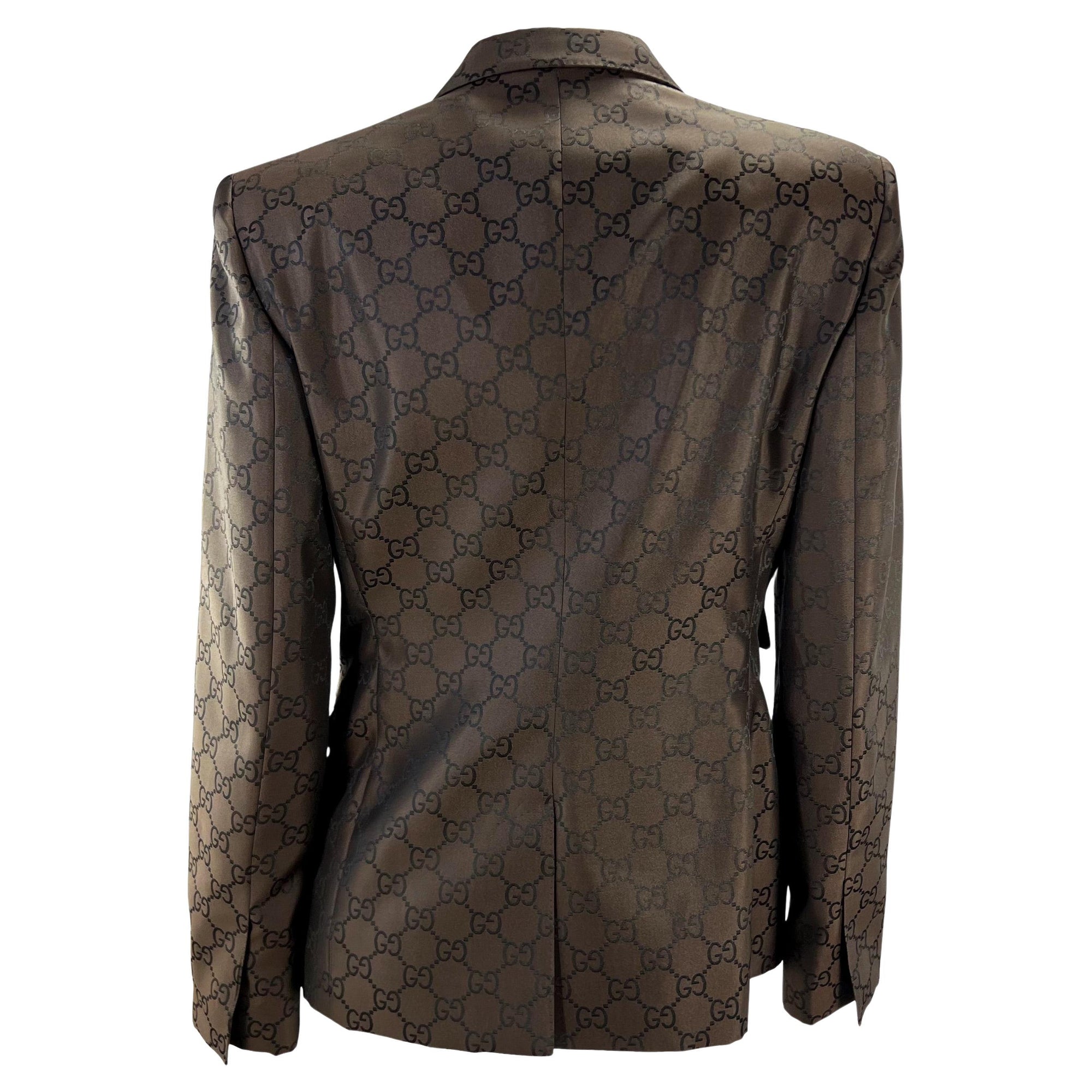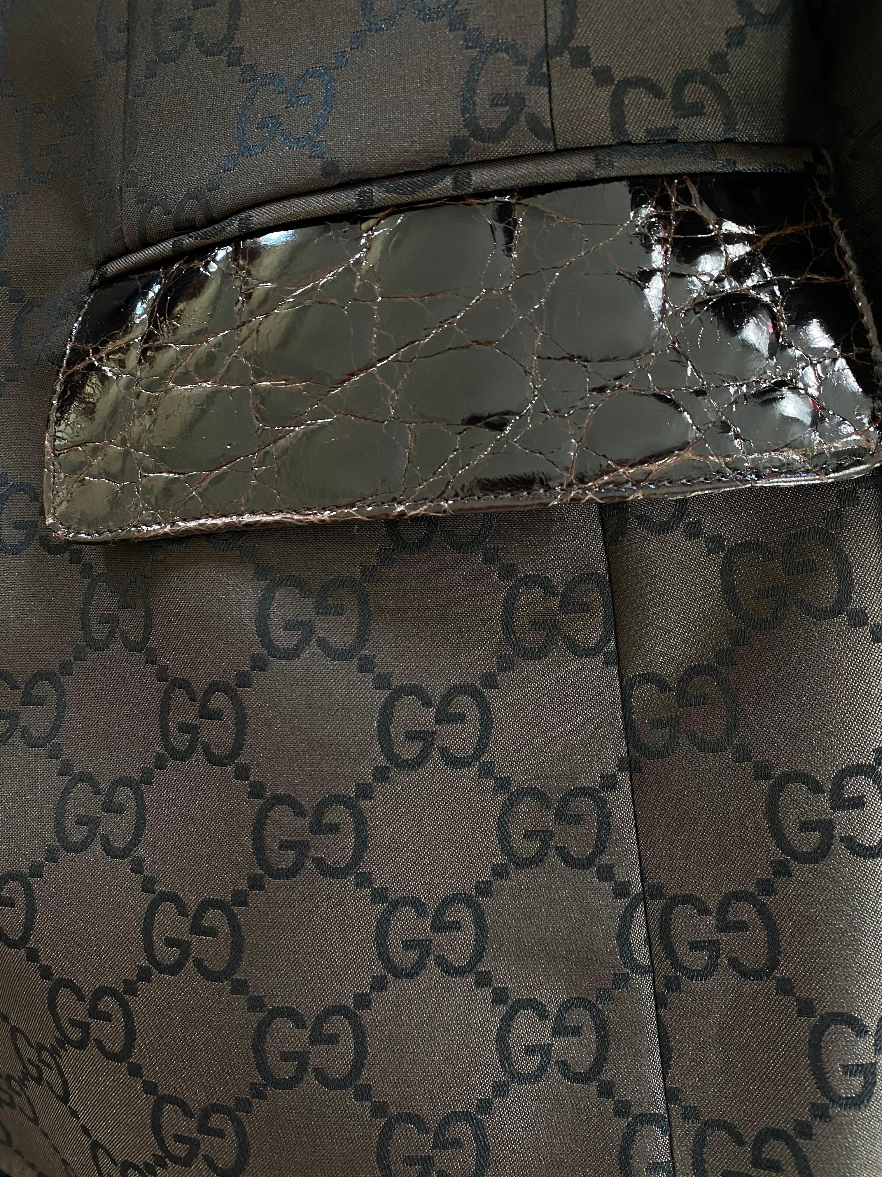 Presenting a Gucci brown GG monogram blazer, designed by Tom Ford. From the Spring/Summer 1998 collection, the black version of this woven GG print was prominently displayed on multiple looks on the season's runway. The blazer features hidden-button closures at the front as well as glossy patent crocodile pocket flaps. This rare blazer is seldom for sale and is almost never seen with the crocodile pocket finishes. This masterfully constructed blazer is from Gucci's heydays with Ford as the designer and perfectly embodies Ford's abilities to pull from the brand's heritage while adding his sexy modern twist. Be sure to take a look at the other iconic pieces we have from this collection. Matching pants available for purchase!