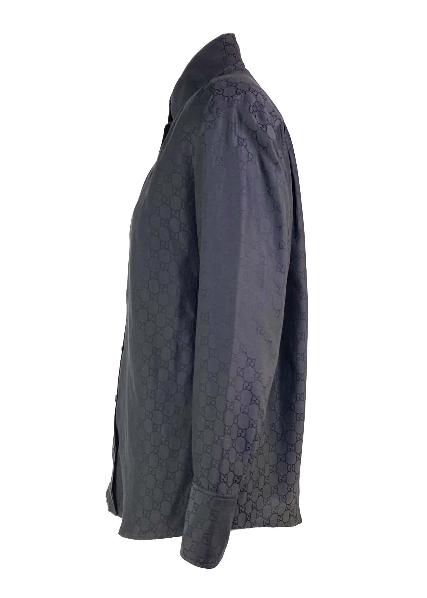 Presenting an iconic Gucci 'GG' monogram button-up shirt designed by Tom Ford. From Ford's Spring/Summer 1998 collection, this shirt is constructed entirely of 'GG' monogram silk and features a collar, a front button closure, and built-in shoulder pads. The season's runway collection featured multiple pieces in the same chic black-on-black monogram pattern. Why buy a re-edition when you can buy an archival original?