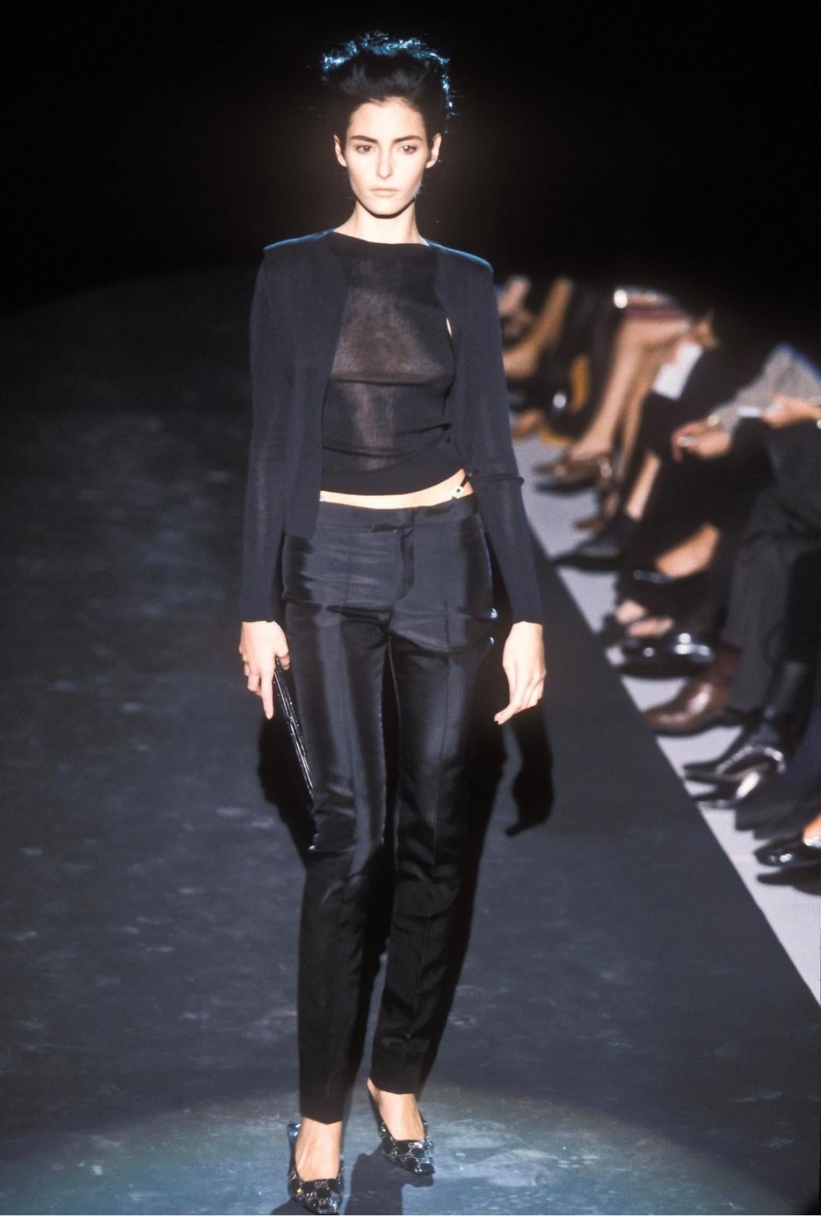 Iconic, these heels were designed by Tom Ford, the creative director of Gucci, for the S/S 1998 collection. The small/kitten heels feature a pointed toe made of satin and adorned with the Gucci "GG" pattern in black and grey. A clear crystal "G" is also placed on the back of the right heel. Finished with a leather insole, the shoe is complete with a simple satin strap. As seen on Eva Strus, captured by Steven Meisel in his "Modernist Style" shoot for Vogue Italia in 1998. Alessandro Michele brought back this design for the Fall 2021 collection, solidifying its position as a highlight in Gucci's history.