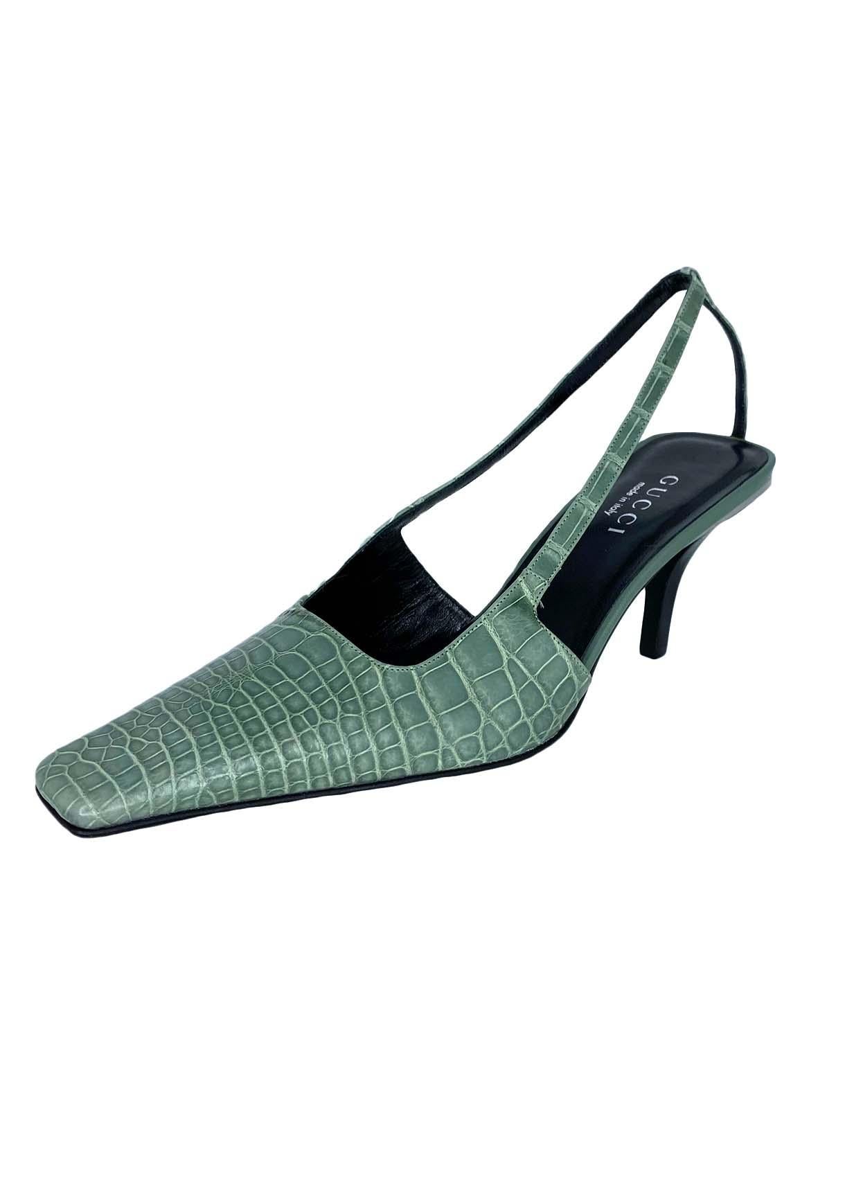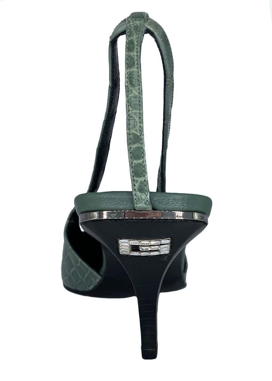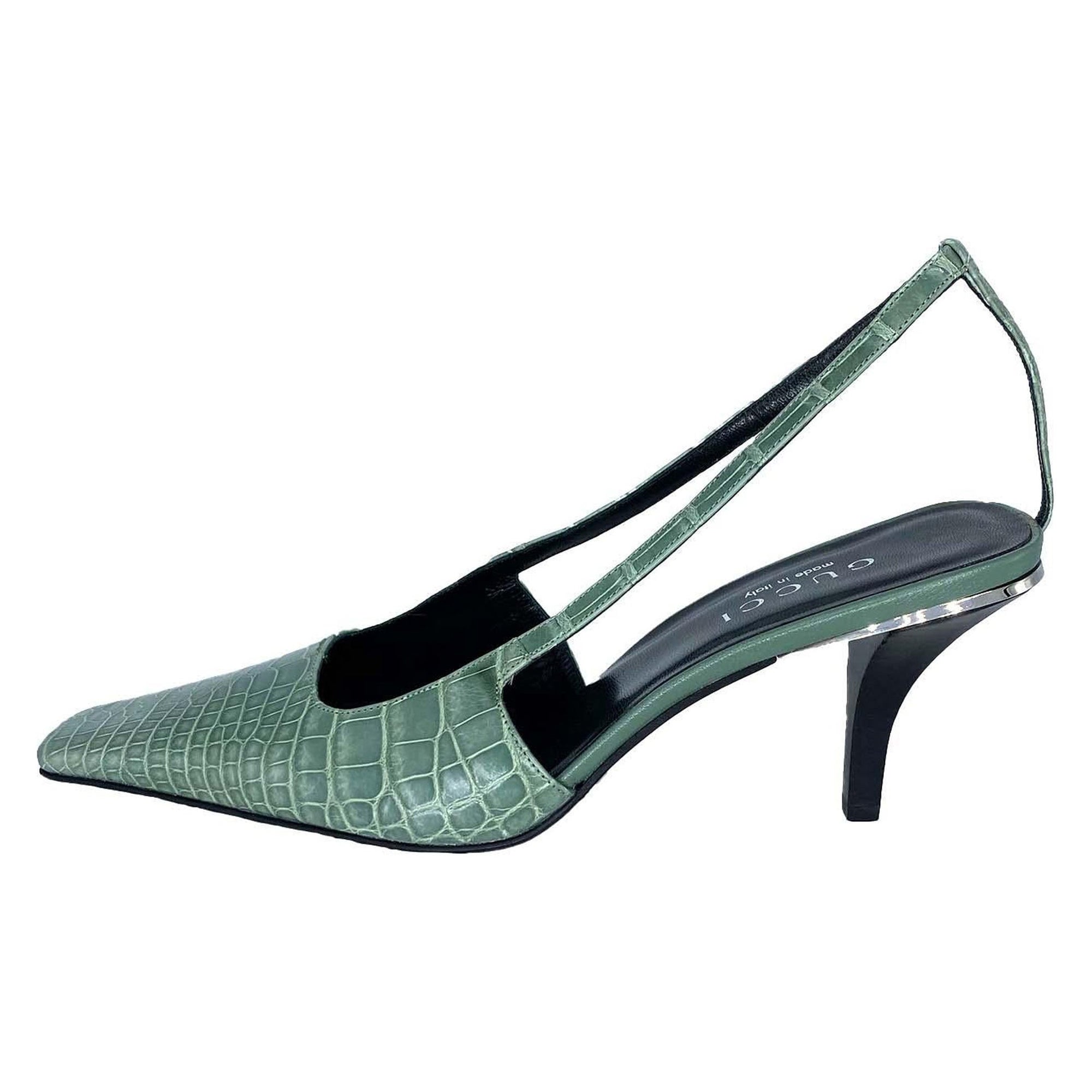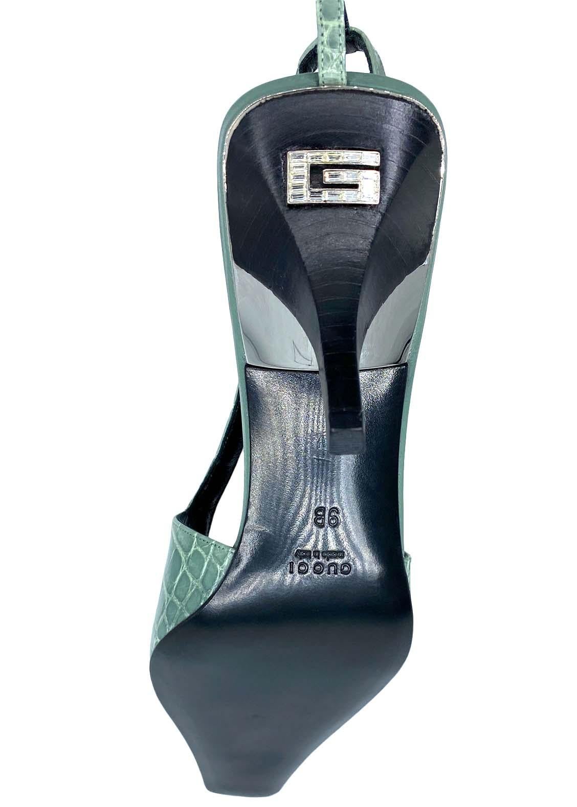 Presenting a pair of green alligator kitten heels designed by Tom Ford for Gucci’s Spring/Summer 1998 collection. These pointed-toe heels are crafted in exotic alligator and finished with a slim strap, leather insole, and a crystal “G” detail set into the back of the right heel. Alessandro Michele later revived this design for Gucci’s Fall 2021 collection, underscoring its place as one of the house’s iconic footwear statements.