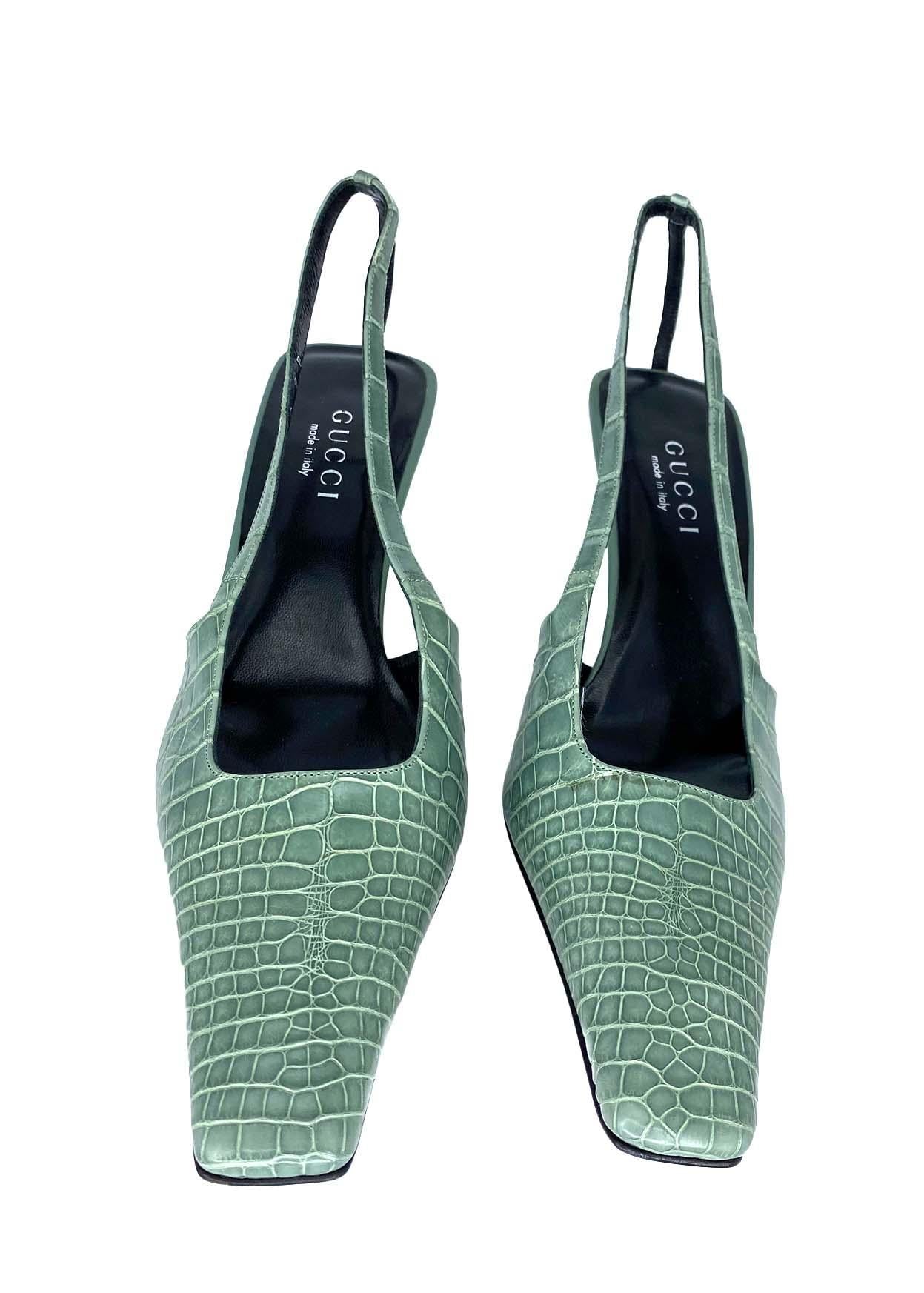 NWT S/S 1998 Gucci by Tom Ford Green Alligator Crystal G Square Toe Kitten Heels