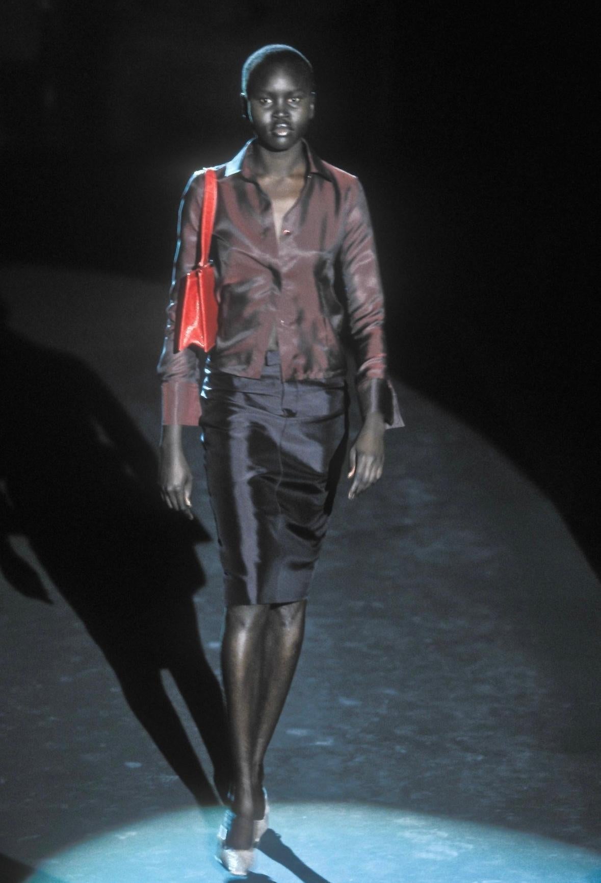 Iconic, these heels were designed by Tom Ford, the creative director of Gucci, for the S/S 1998 collection. The small/kitten heels feature a pointed toe made of green crocodile/alligator. A clear crystal "G" is also placed on the back of the right heel. These crocodile heels are finished with a leather insole, and the shoe has a simple strap. Alessandro Michele brought back a variation of this design for the Fall 2021 collection, solidifying its position as a highlight in Gucci's history.