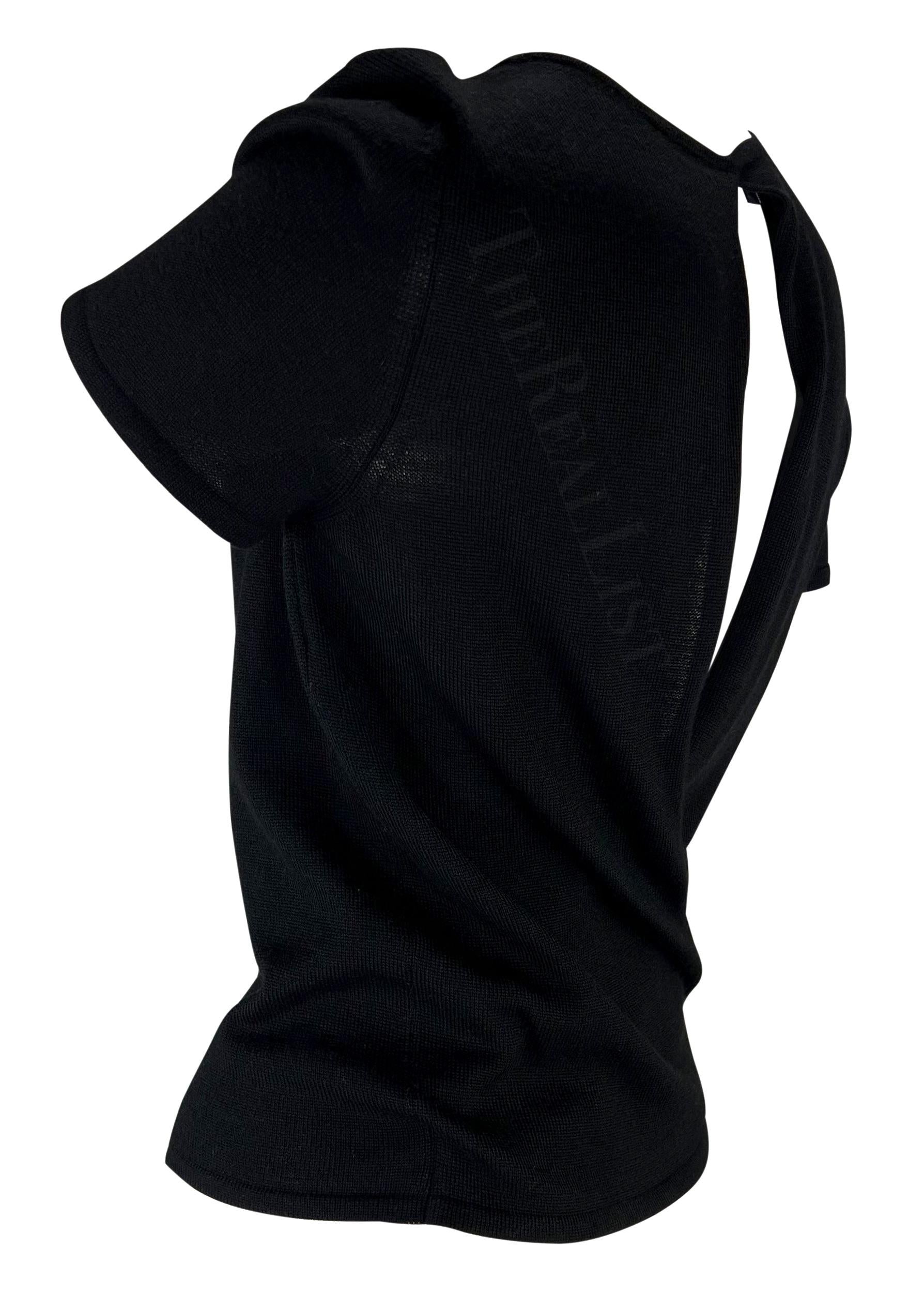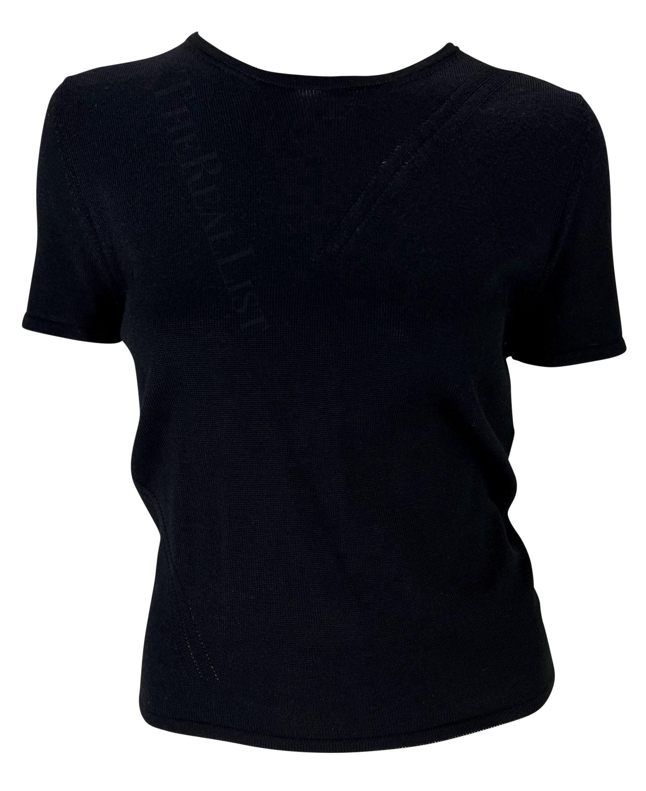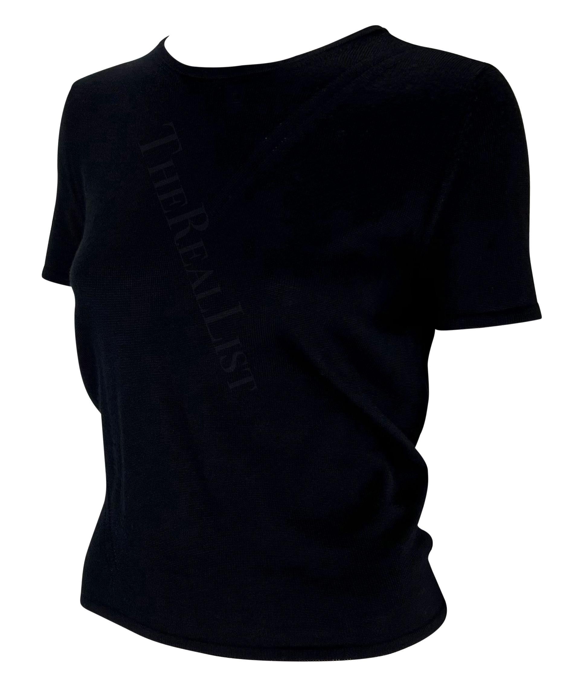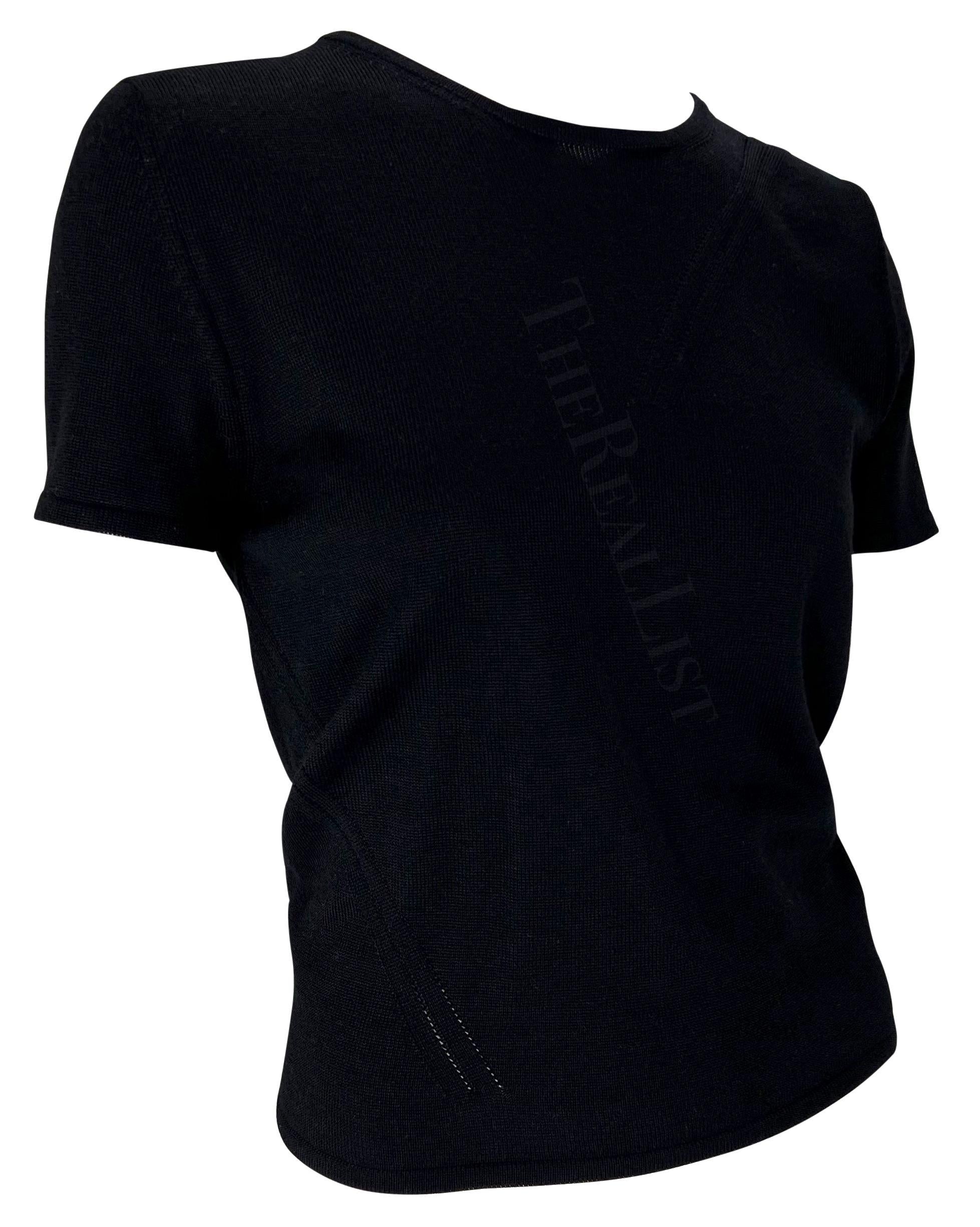 Presenting a black knit Gucci t-shirt, designed by Tom Ford. From the Spring/Summer 1998 collection, this top features perforated details and wraps at the back creating an eyelet that exposes the back. The perfectly elevated closet staple, this Gucci by Tom Ford top is a must-have addition to any wardrobe!