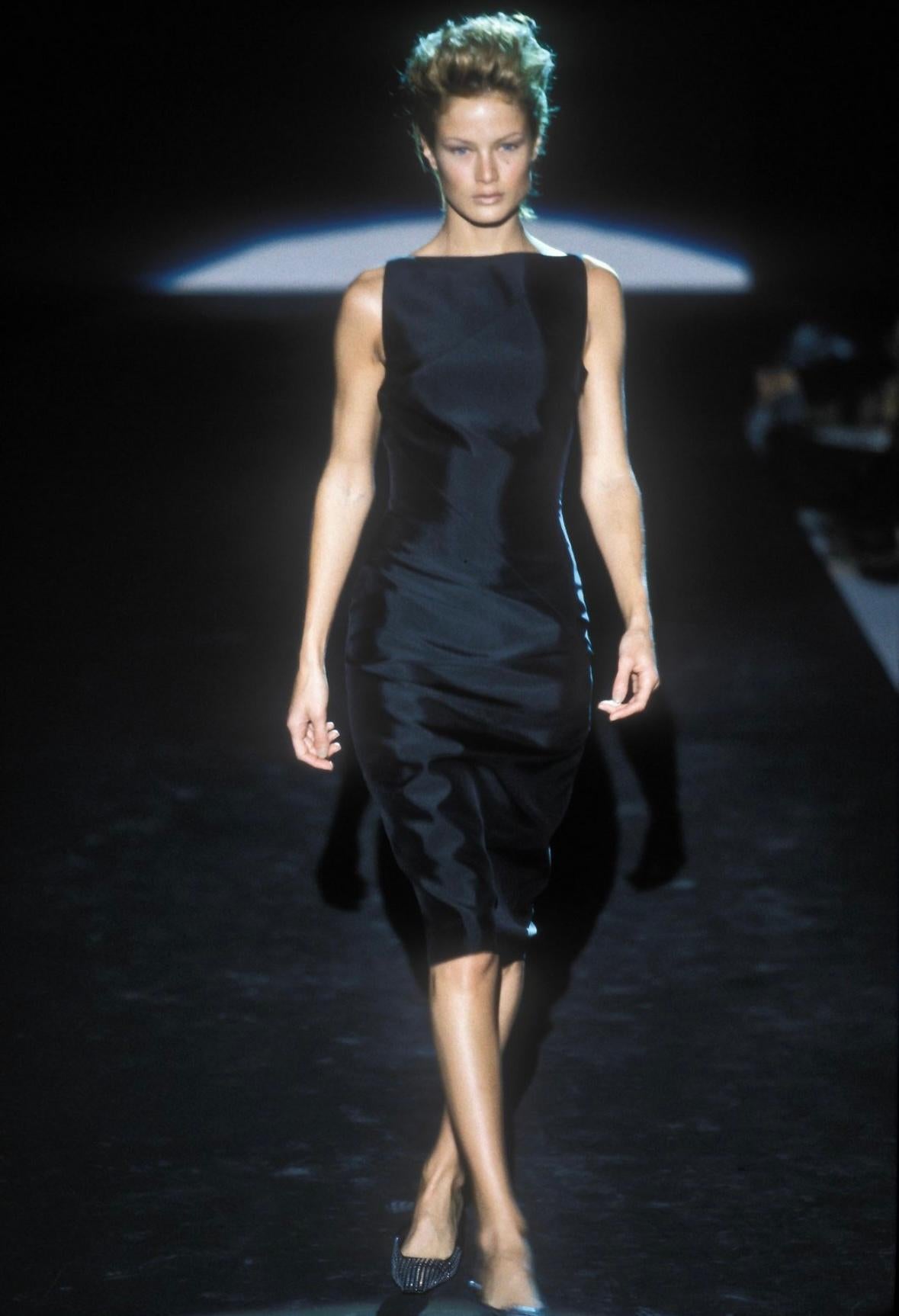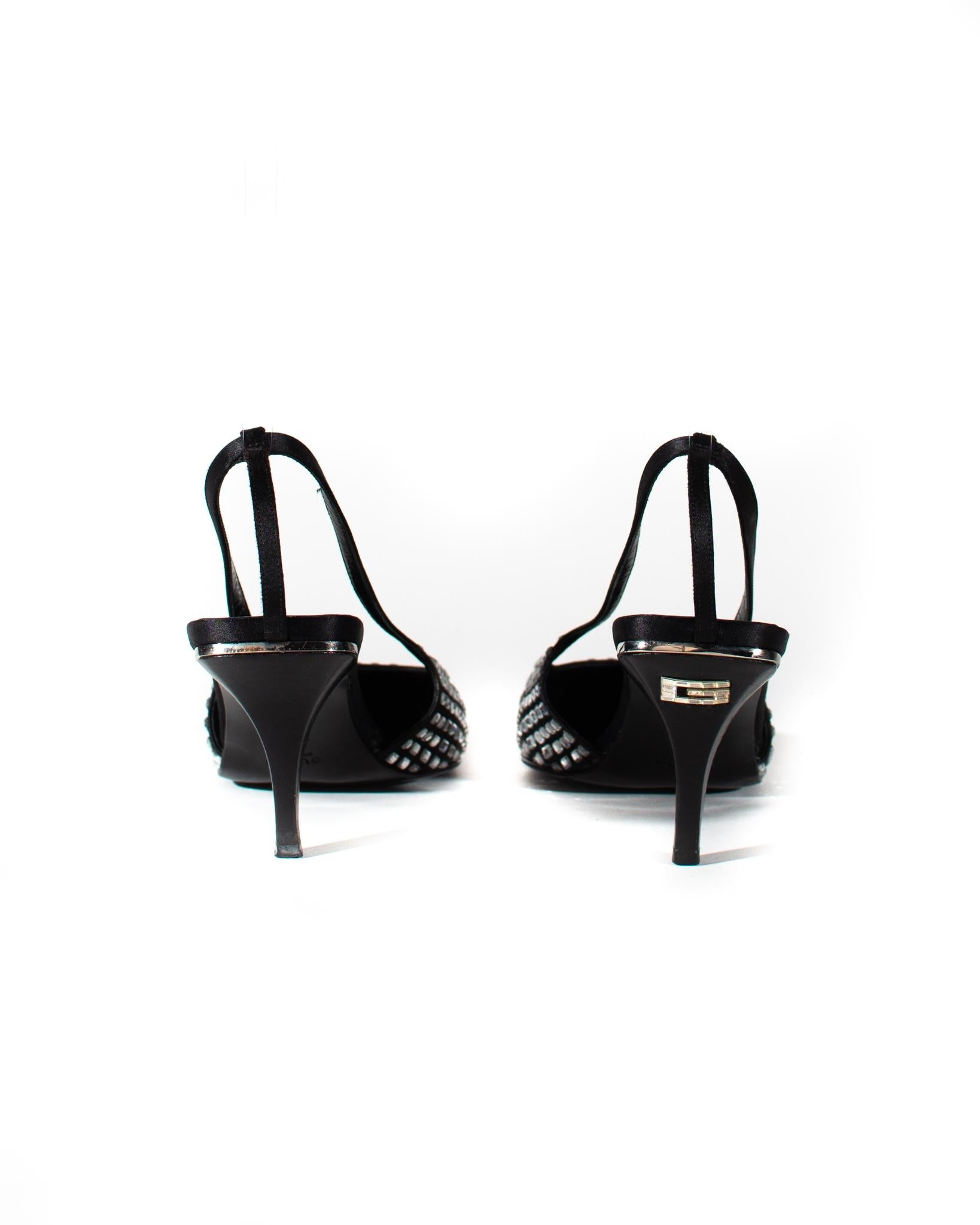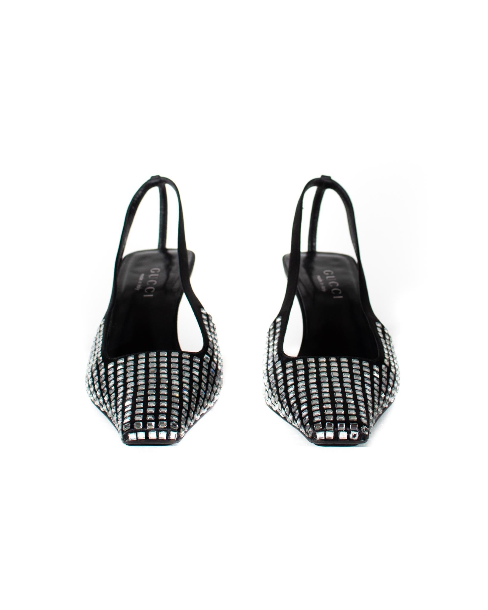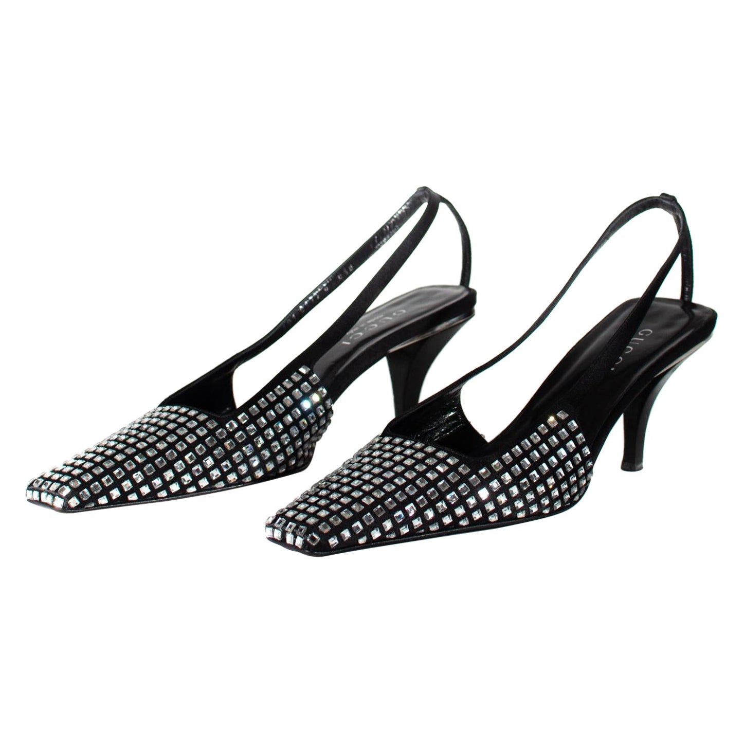 Presenting these iconic heels Tom Ford designed during his time as the creative director of Gucci's Spring/Summer 1998 collection. The small/kitten heels feature a pointed toe made of satin and adorned with the Gucci "GG" pattern in black and grey. A clear crystal "G" is also placed on the back of the right heel. Finished with a leather insole, the shoe is complete with a simple satin strap. Alessandro Michele brought back this design for the Fall 2021 collection, solidifying its position as a highlight in Gucci's history.