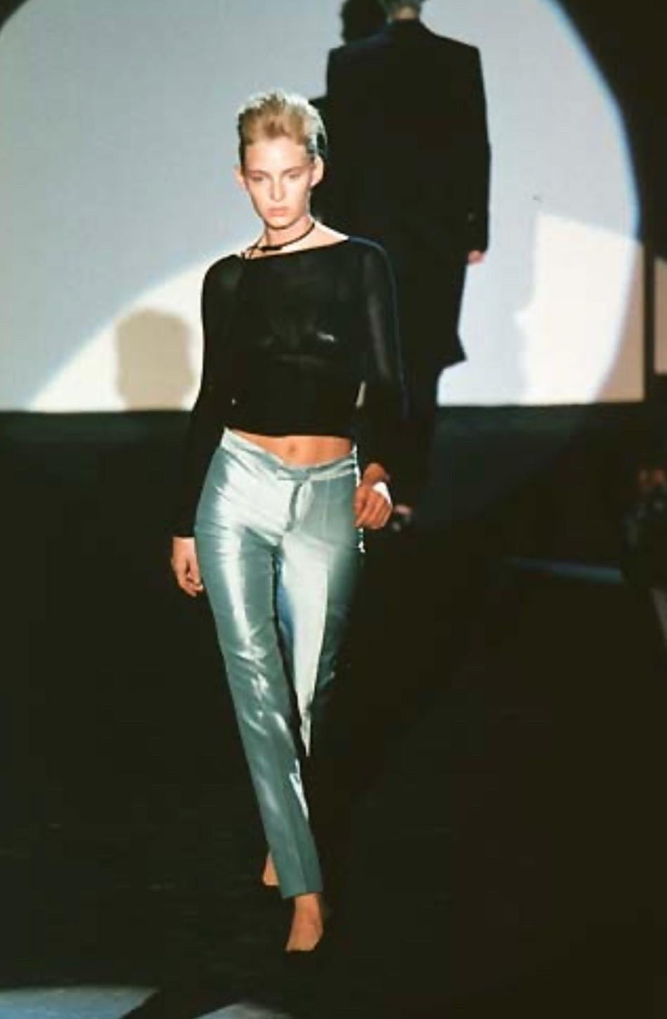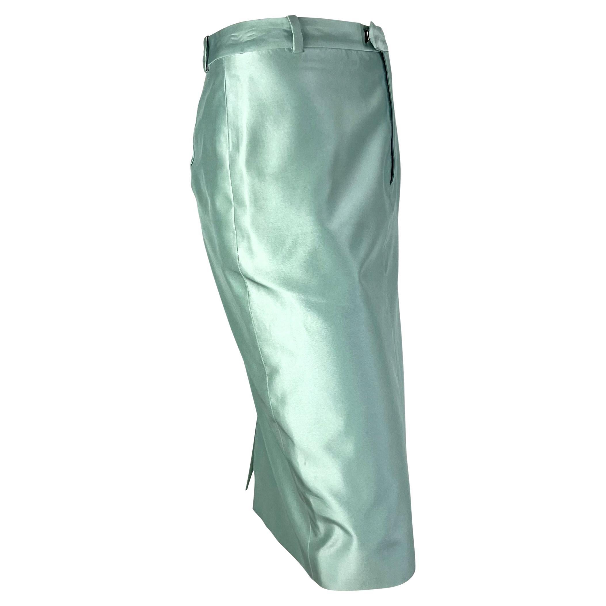Presenting a stunning baby blue satin Gucci skirt, designed by Tom Ford. From the Spring/Summer 1998 collection, the same baby blue satin appeared on the runway on a jacket and trousers. Constructed entirely of satin, this skirt perfectly shines and catches the light with each movement. The pencil-style skirt features a fly-front zipper, belt loops, and a slit at the back. This skirt is a must-have for any Tom Ford Gucci lover!