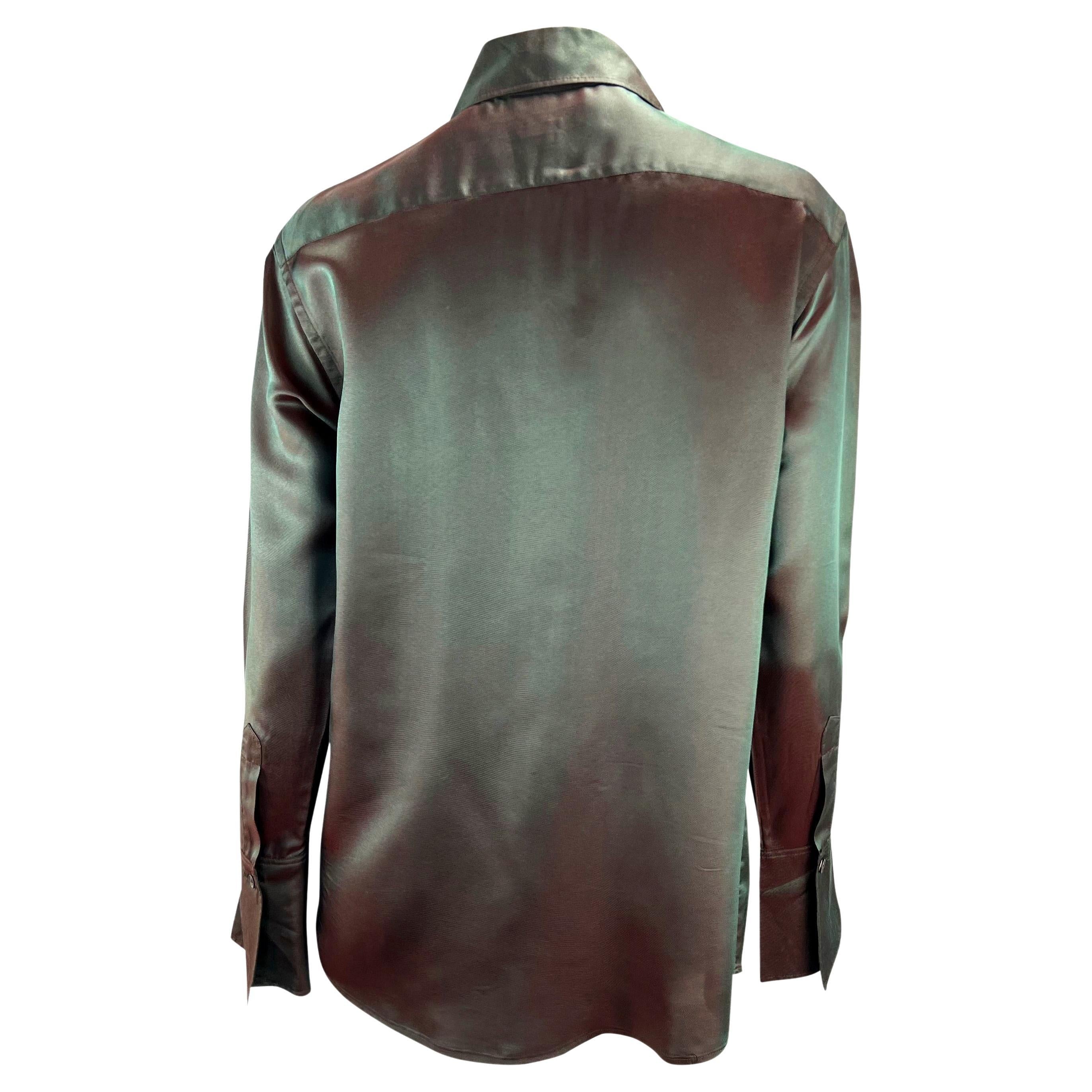This exquisite button-up blouse, designed by Tom Ford for Gucci's Spring/Summer 1998 collection, boasts a mesmerizing iridescent quality. Featuring deep red undertones that subtly shimmer through the dark grey fabric with every movement, its allure is difficult to capture in photos. This sleek shirt epitomizes Ford's signature chic minimalism during his tenure at the house of Gucci.