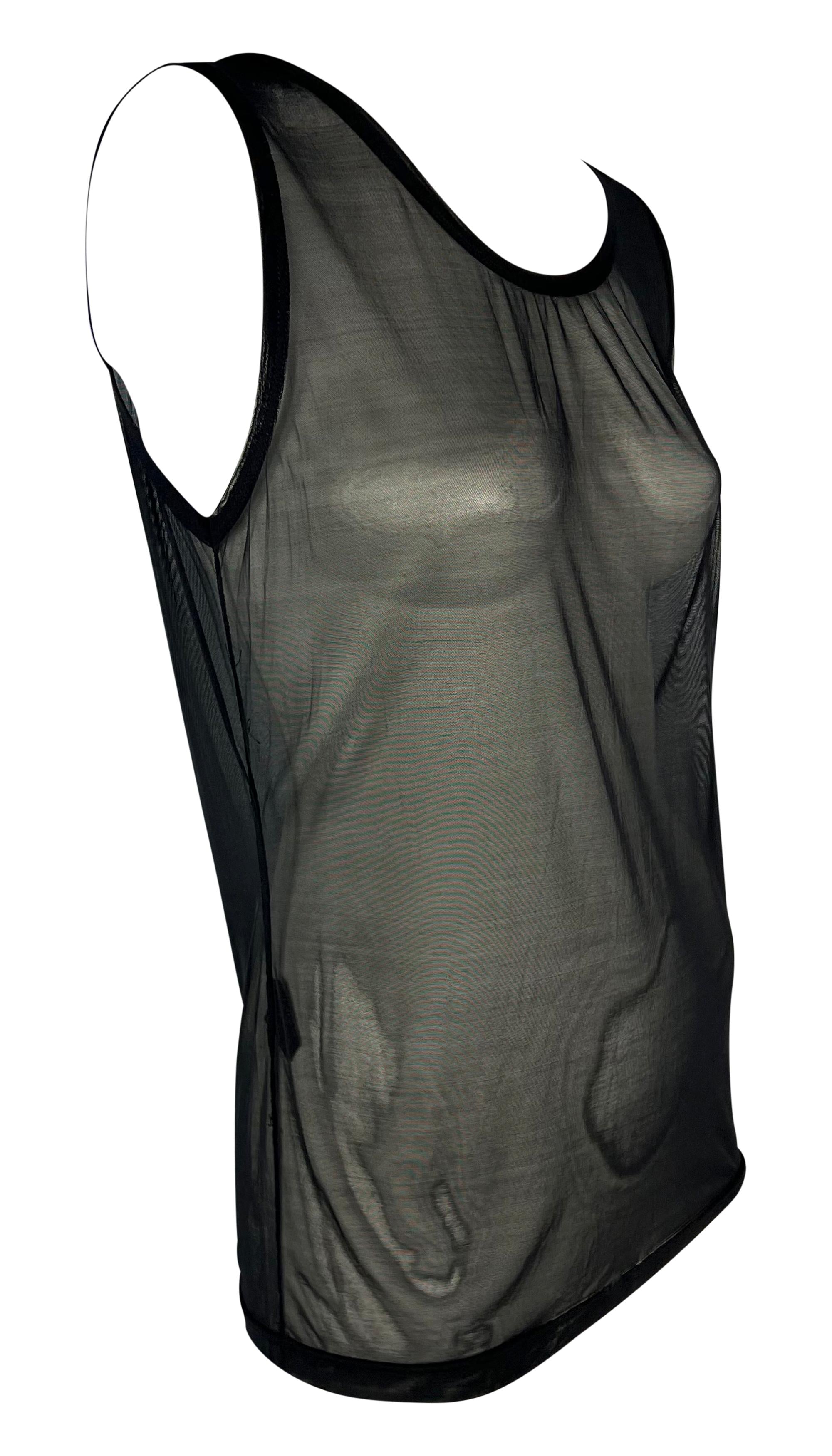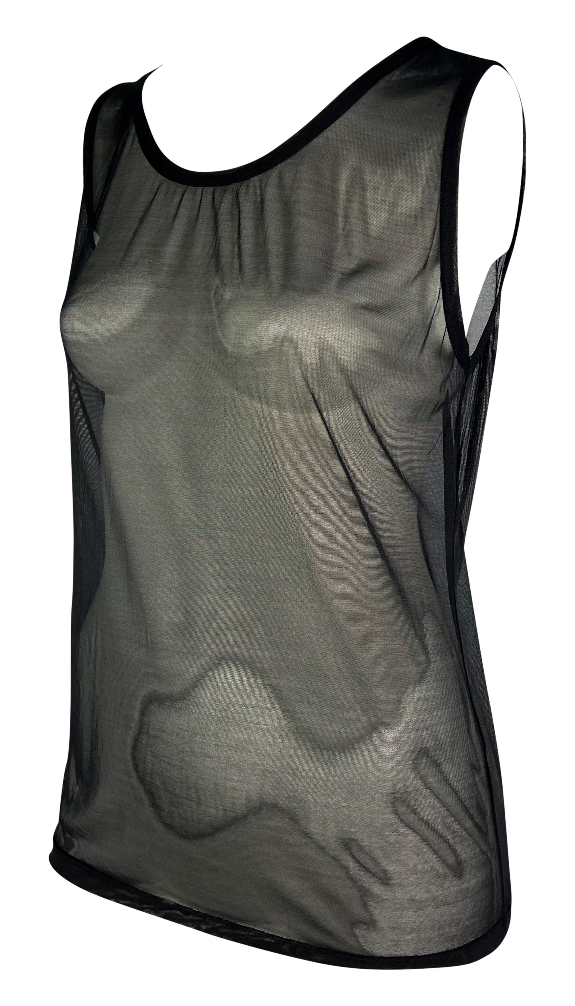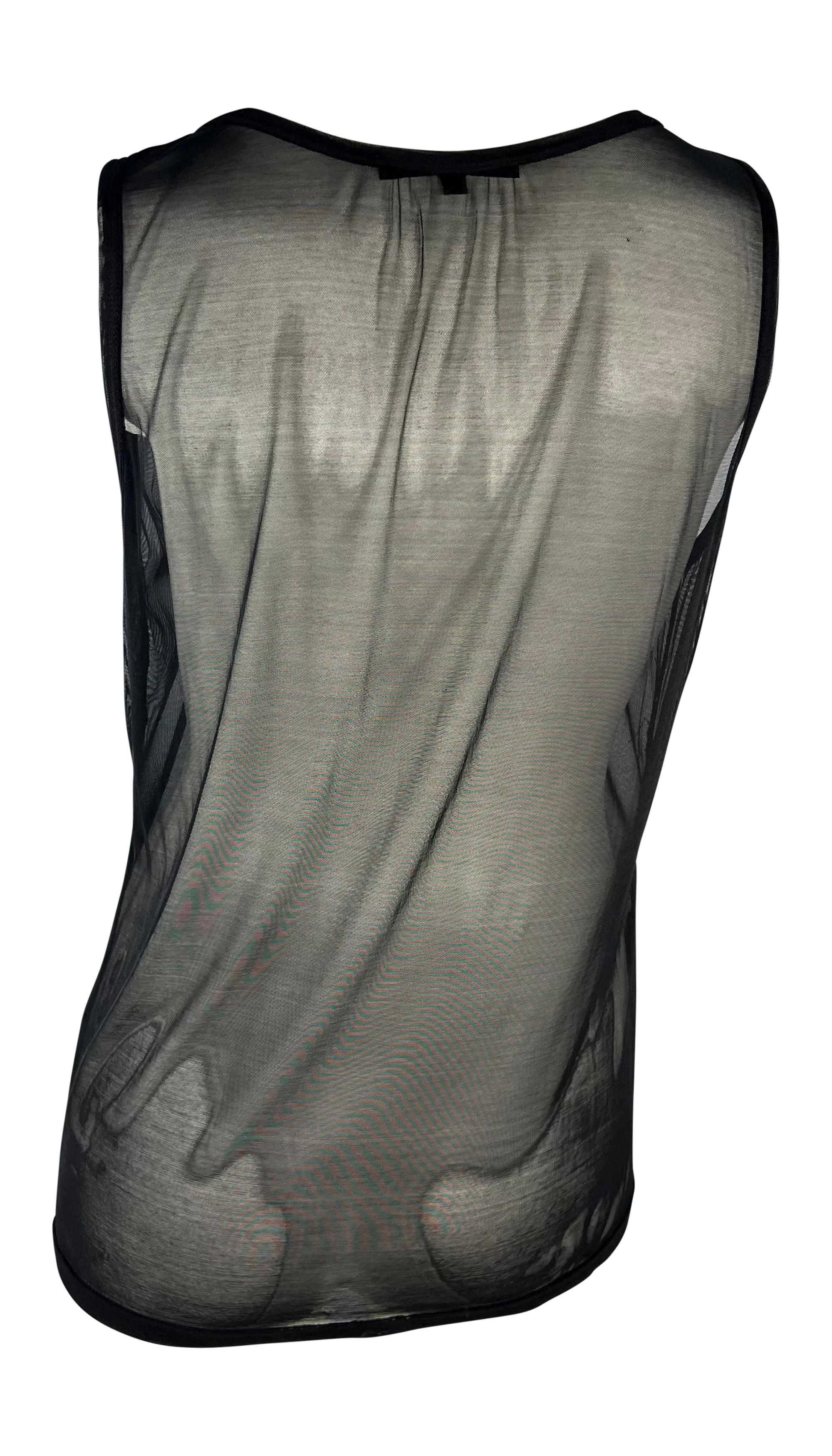 From Gucci’s Spring/Summer 1998 collection under Tom Ford, this sheer black mesh tank top features a minimalist scoop neckline and body-hugging silhouette. Designed to reveal and contour, the piece debuted on the runway as part of Ford’s provocative, skin-baring vision for the season.