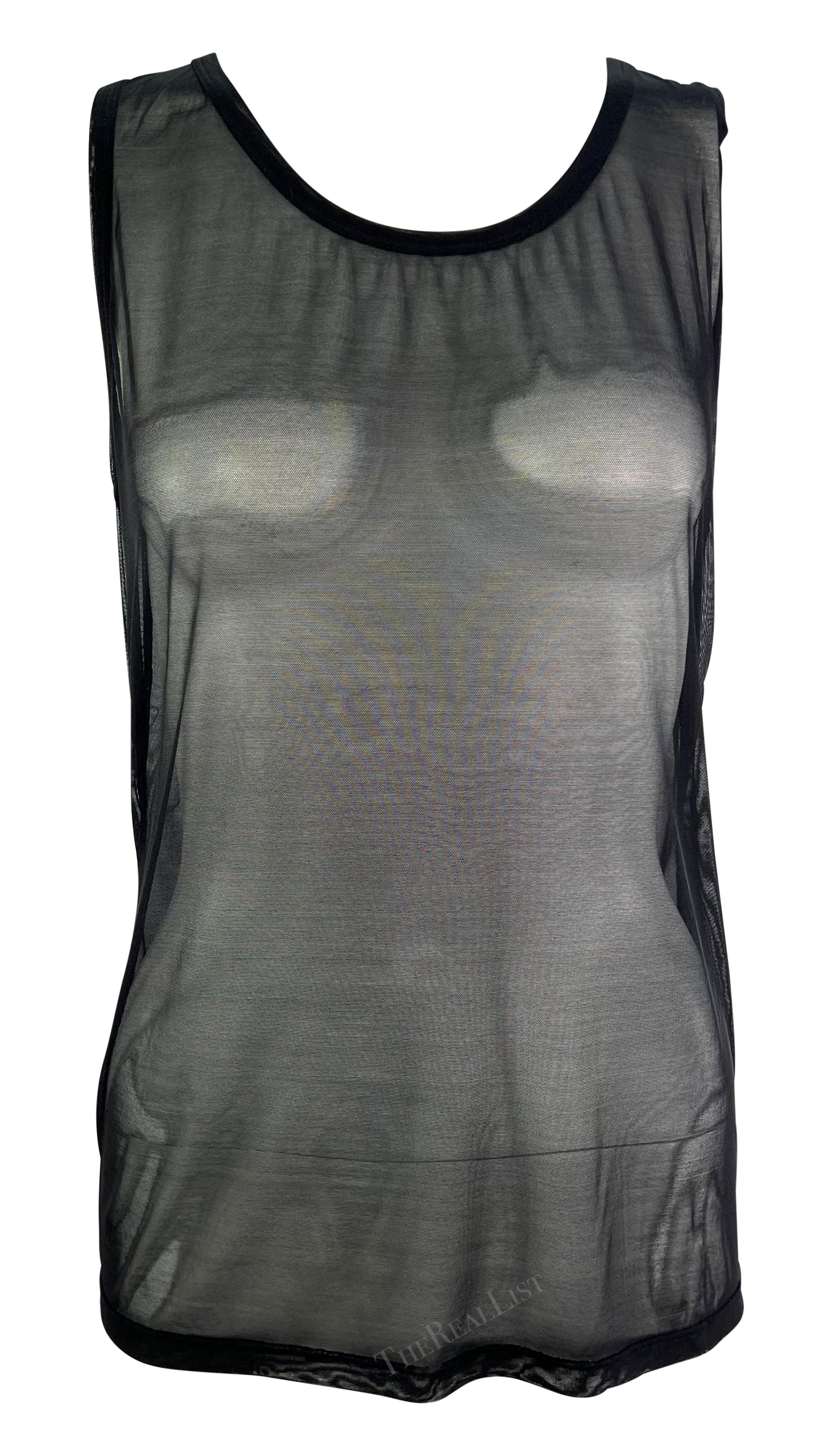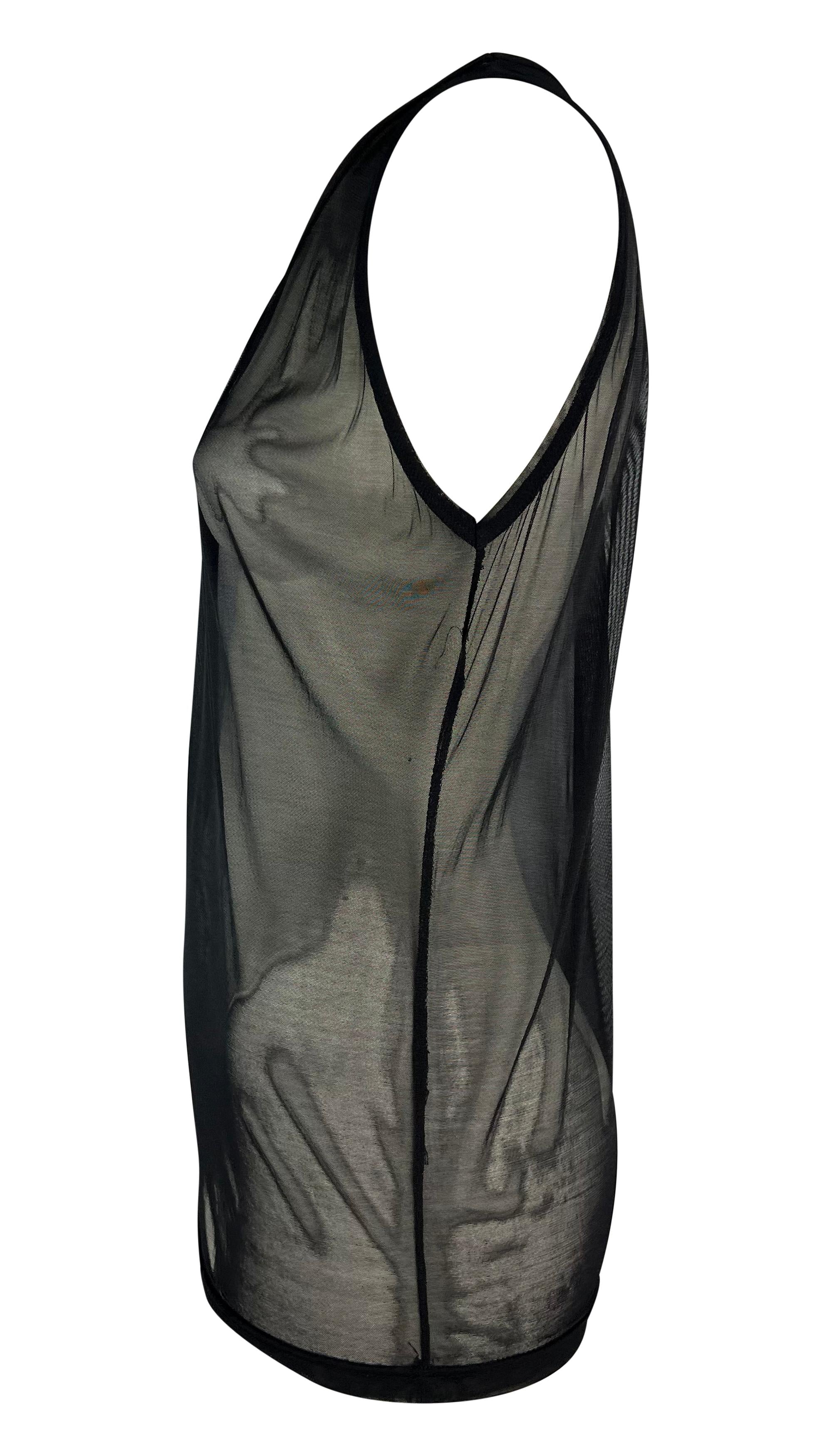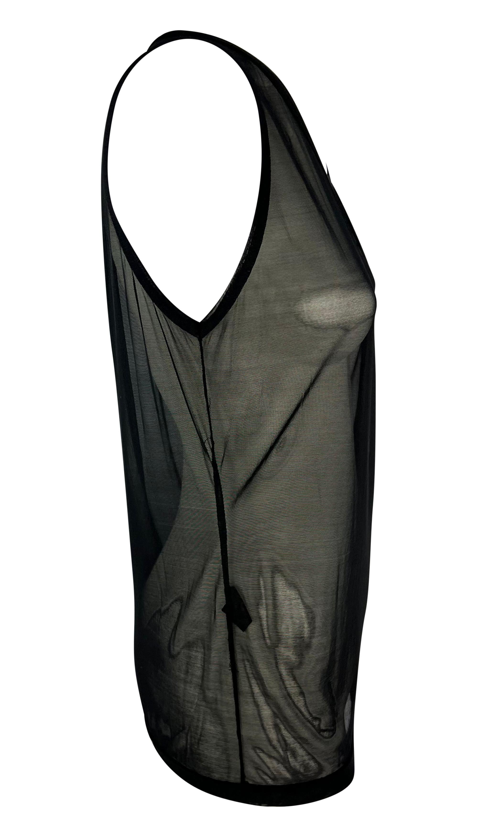From Gucci’s Spring/Summer 1998 collection under Tom Ford, this sheer black mesh tank top features a minimalist scoop neckline and body-hugging silhouette. Designed to reveal and contour, the piece debuted on the runway as part of Ford’s provocative, skin-baring vision for the season.
