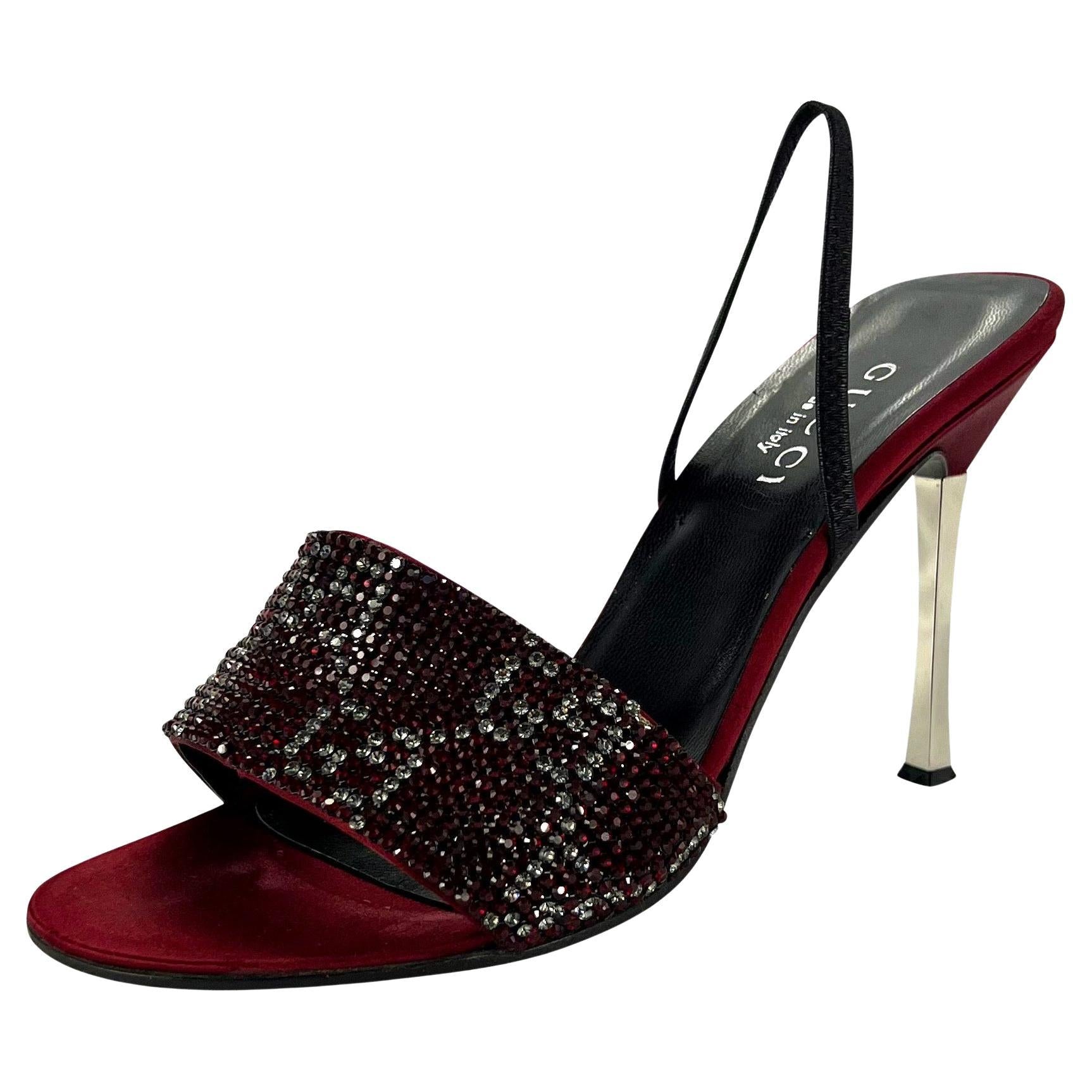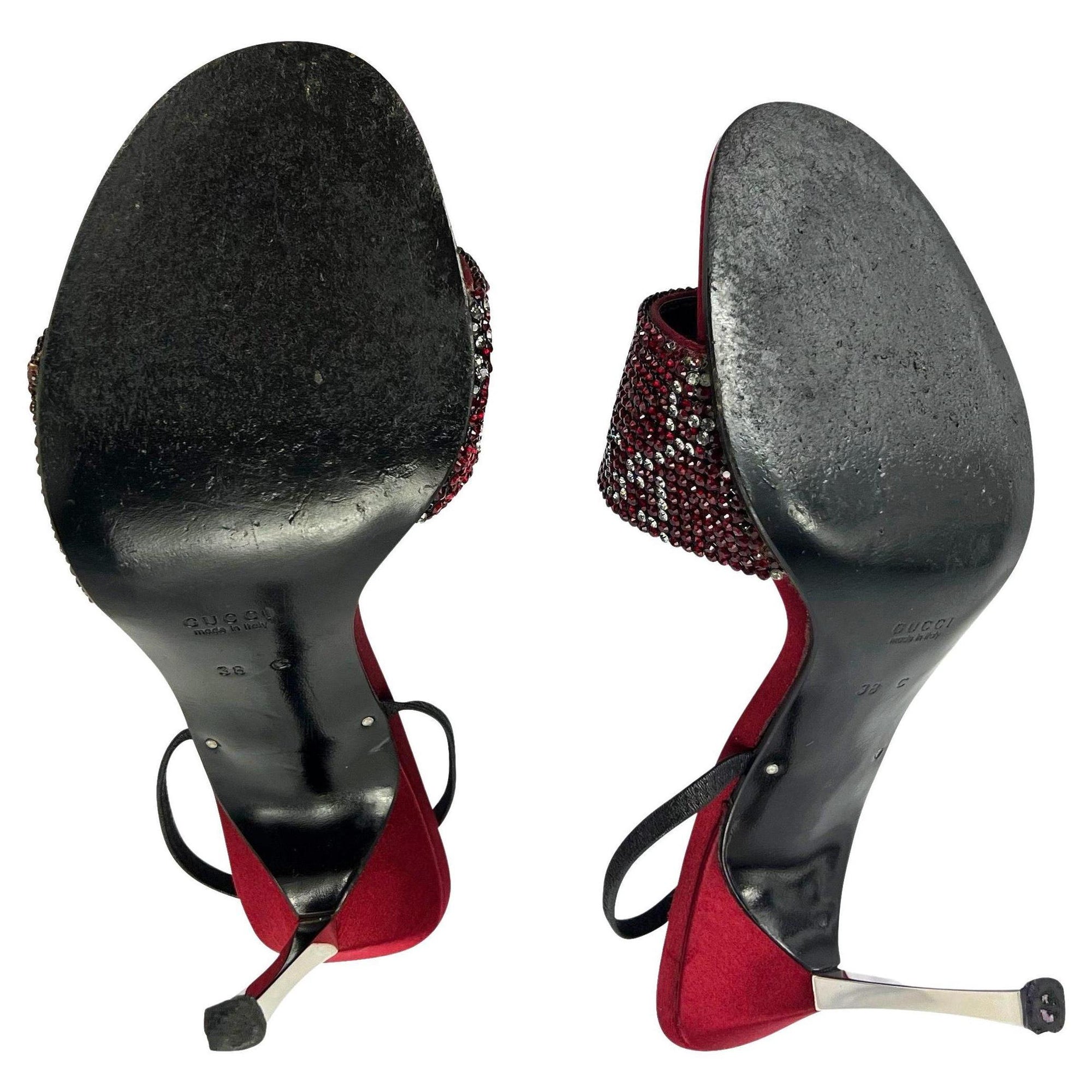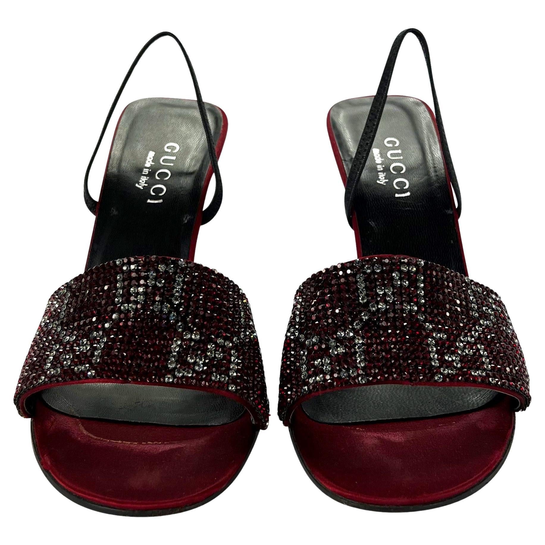 Presenting a pair of rich red crystal 'GG' Gucci slingback heels designed by Tom Ford. From the Spring/Summer 1998 collection, these rare heels feature red satin at the base with a clear and red crystal 'GG' strap at the toe. These iconic heels are made complete with Ford's silver heel peg. These spectacular heels were seen on iconic celebs, including Foxy Brown, Mariah Carey, Lil Kim, and Kim Kardashian.