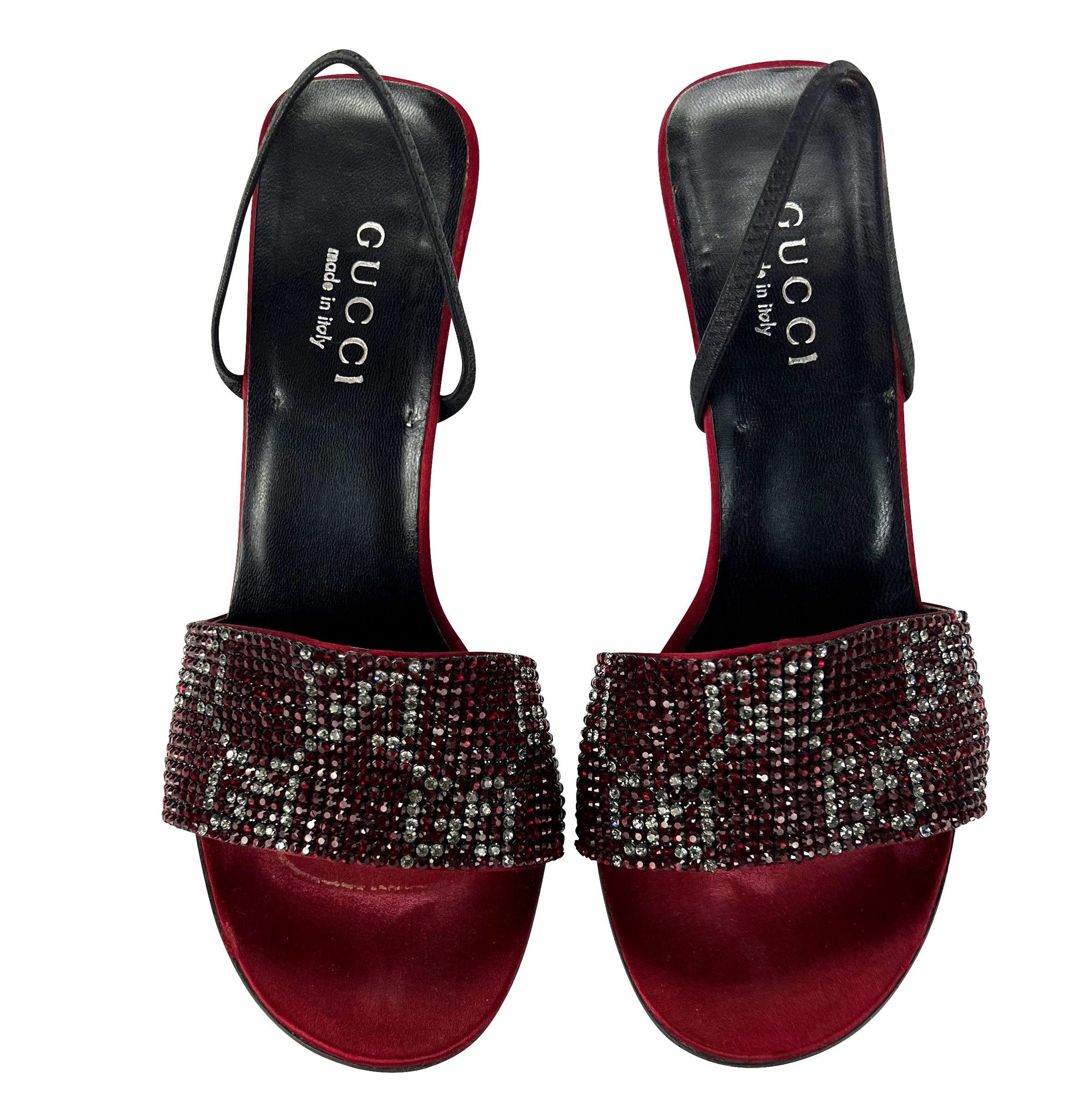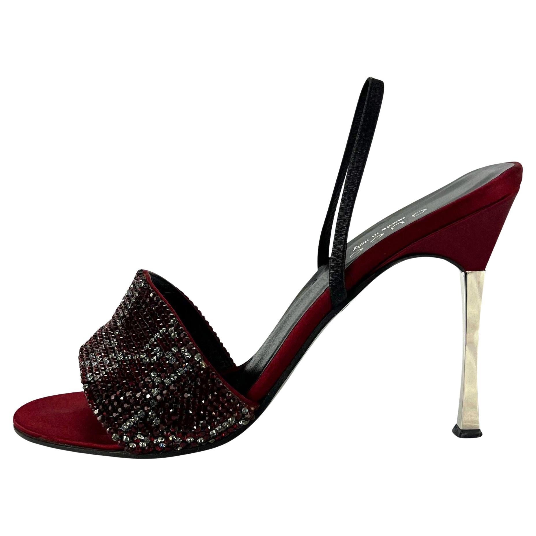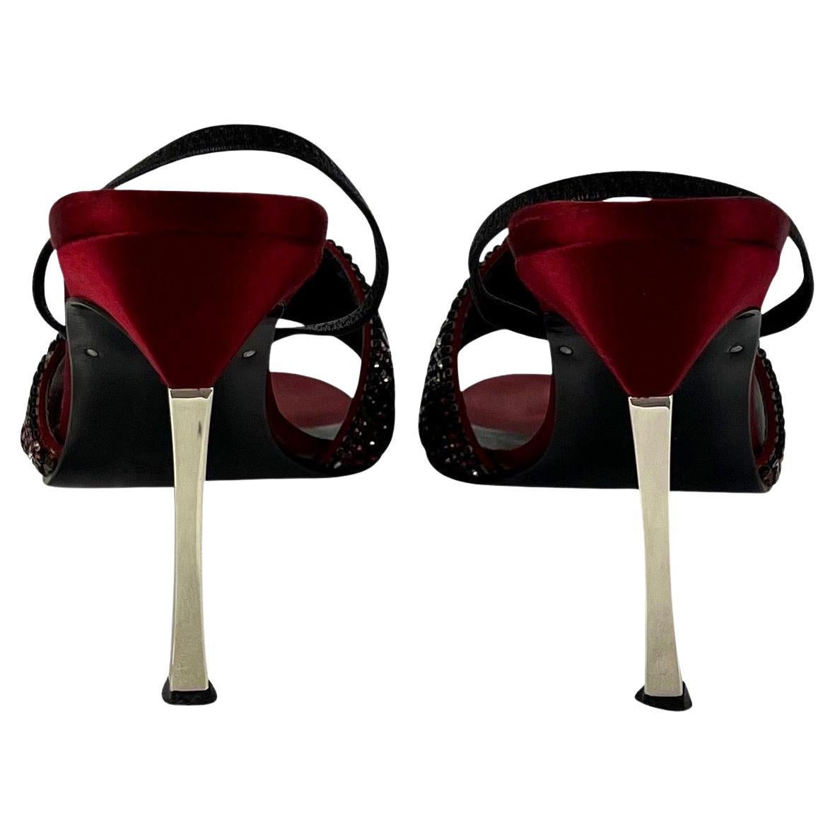 Presenting a pair of rich red crystal 'GG' Gucci slingback heels designed by Tom Ford. From the Spring/Summer 1998 collection, these rare heels feature red satin at the base with a clear and red crystal 'GG' strap at the toe. These iconic heels are made complete with Ford's silver heel peg. These spectacular heels were seen on iconic celebs, including Foxy Brown, Mariah Carey, Lil Kim, and Kim Kardashian.