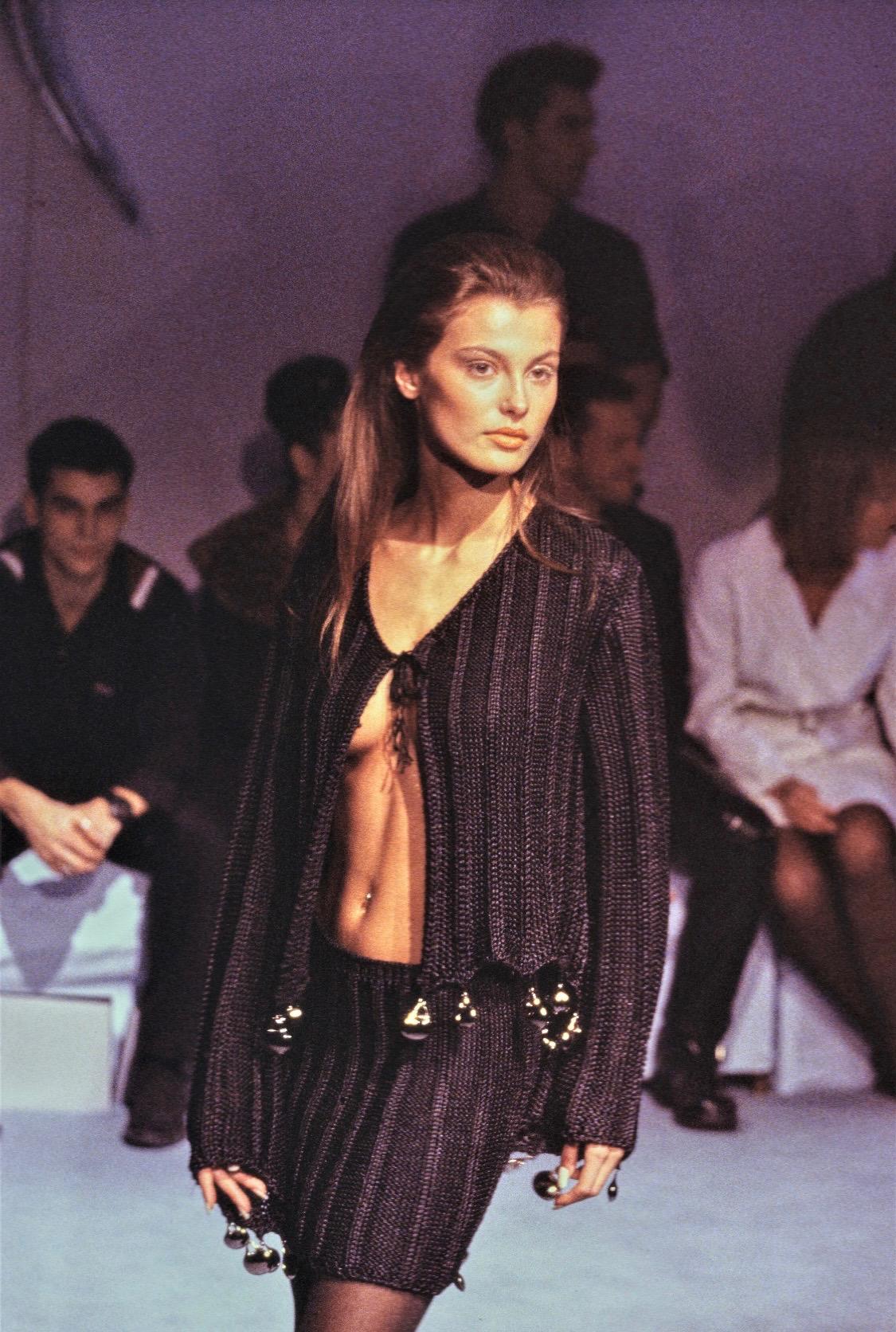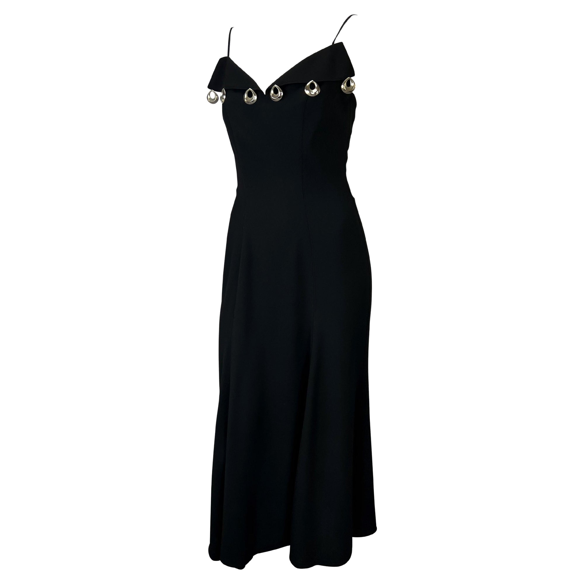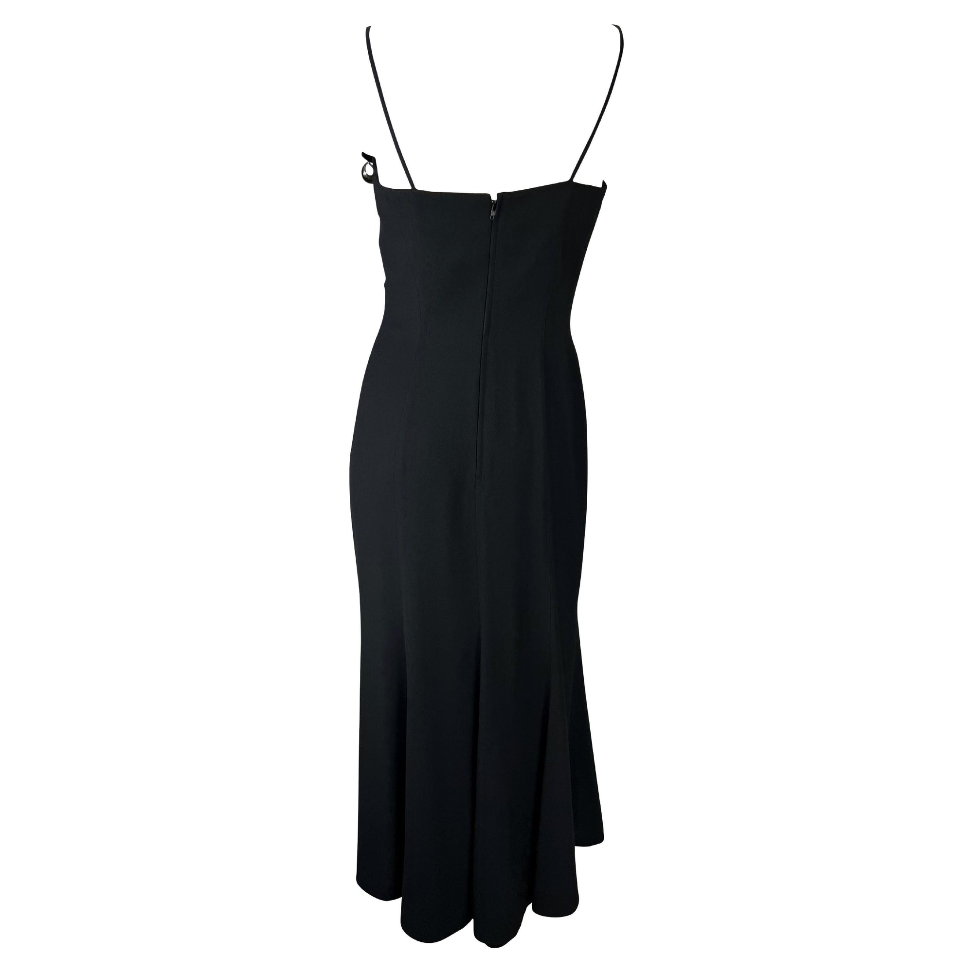 Presenting a beautiful black Thierry Mugler dress designed by Manfred Mugler. From the Spring/Summer 1998 collection, this dress features a sweetheart neckline, spaghetti straps, a mermaid-like skirt, and silver accents at the bust. The season's haute couture runway featured many designs with similar pendant adornments. This little black dress is stunning, and it shows Mugler's ability to turn a classic black dress into an elevated masterpiece. This dress is undeniably a classic Mugler design with abstract adornments and a sculptural bust.