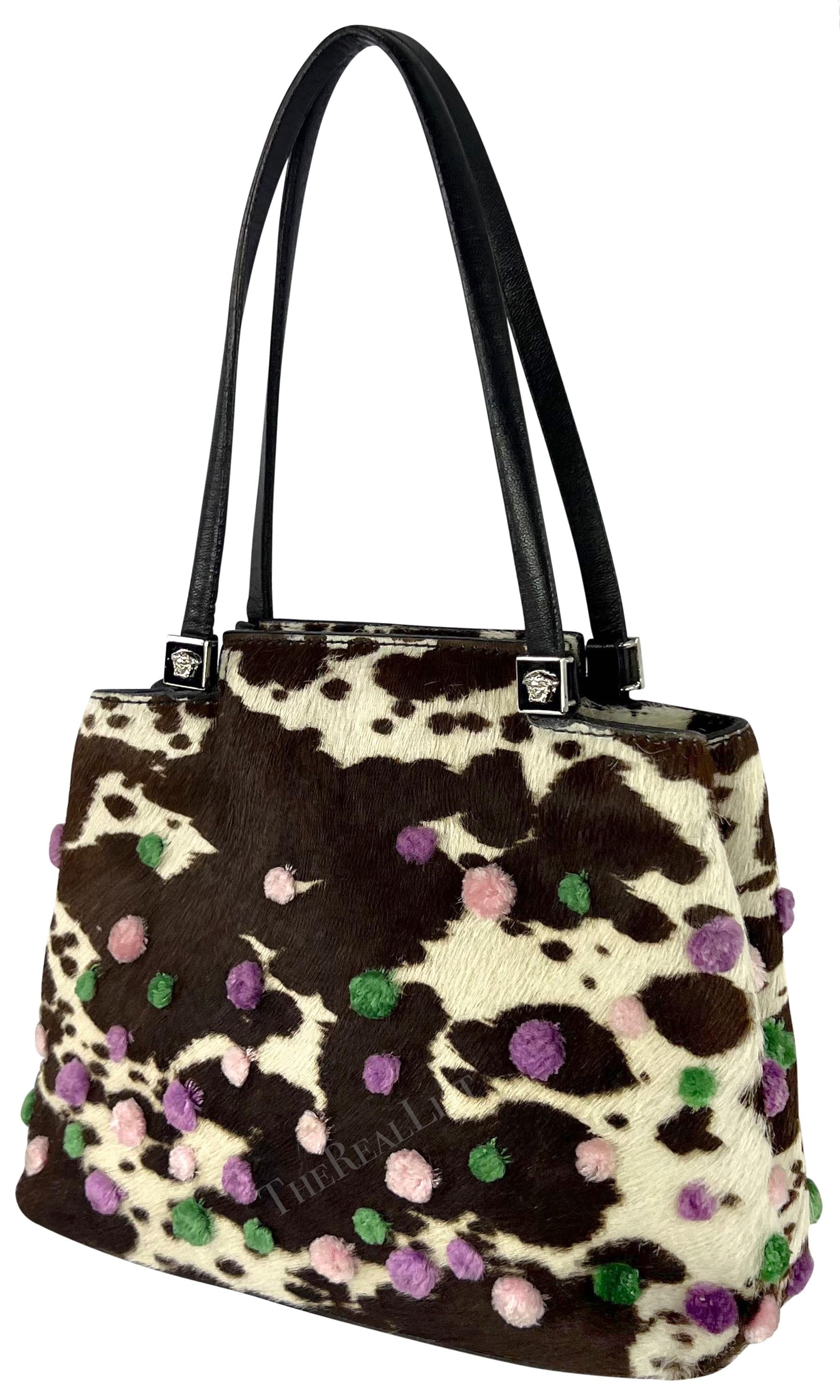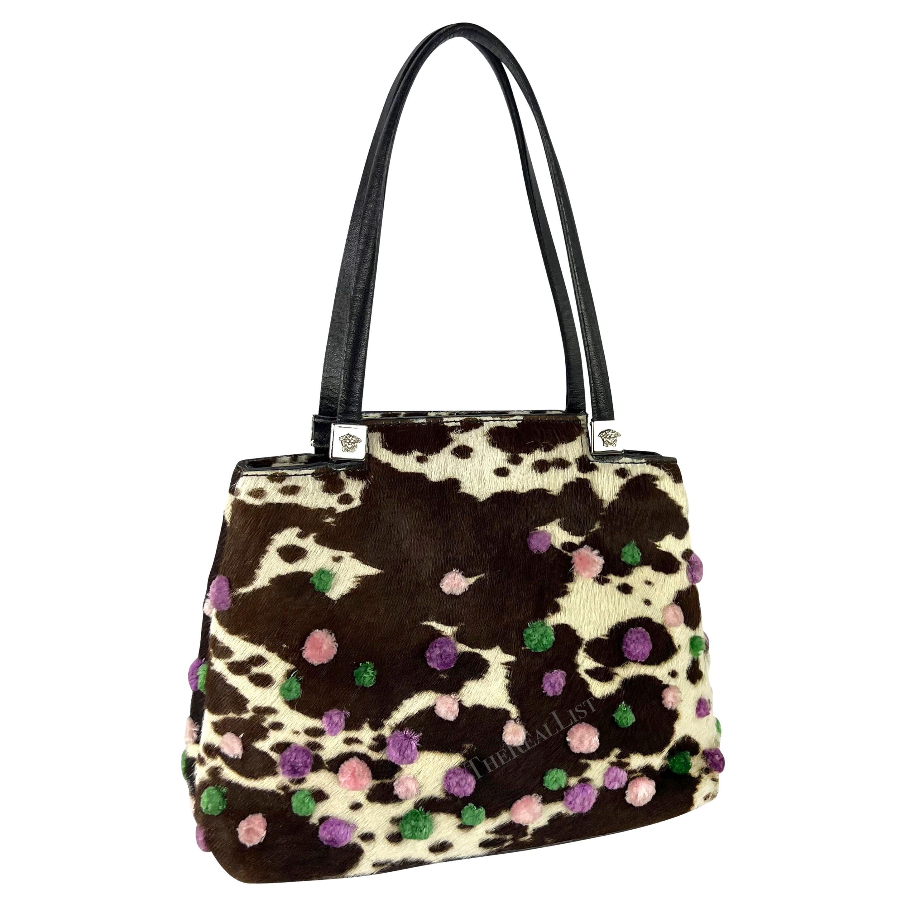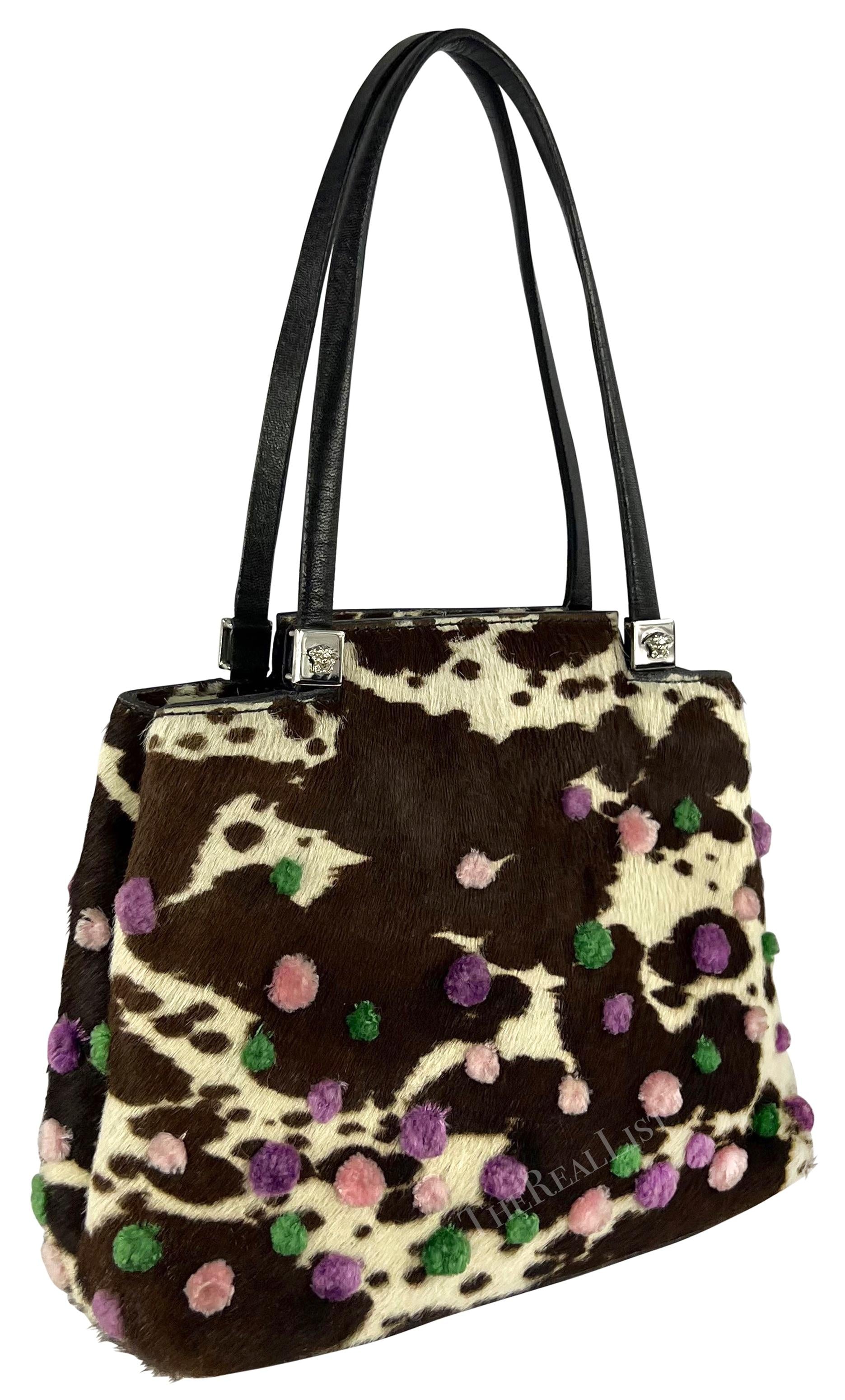 A chic brown cow pony hair Gianni Versace mini bag from the Spring/Summer 1999 collection, designed by Donatella Versace. This petite bag is crafted from brown cow-spotted pony hair, complemented by brown leather straps. Collected at the bottom of this bag are pink, purple, and green pom poms. This adorable bag is made complete with silver-tone Versace Medusa accents at the base of the handles. Check out our storefront for the matching pony hair sunglasses!