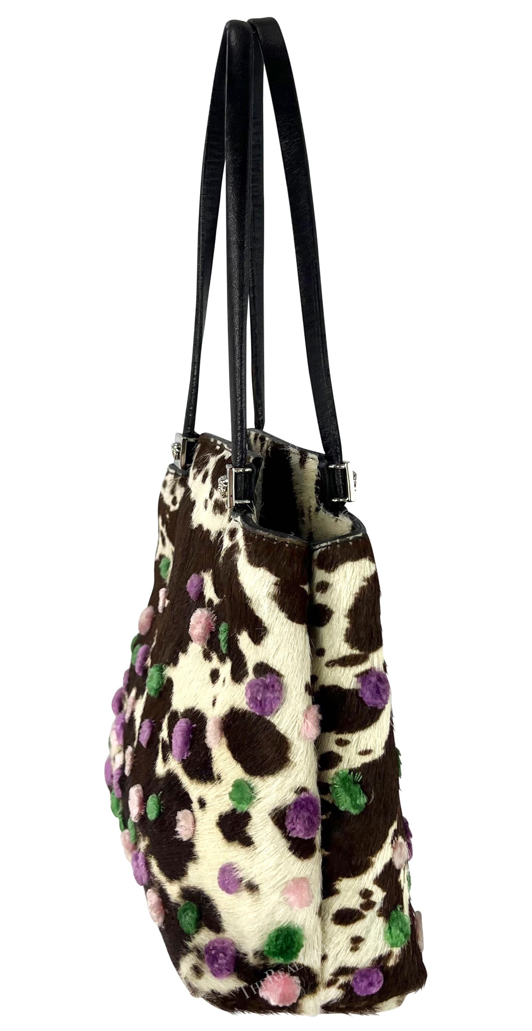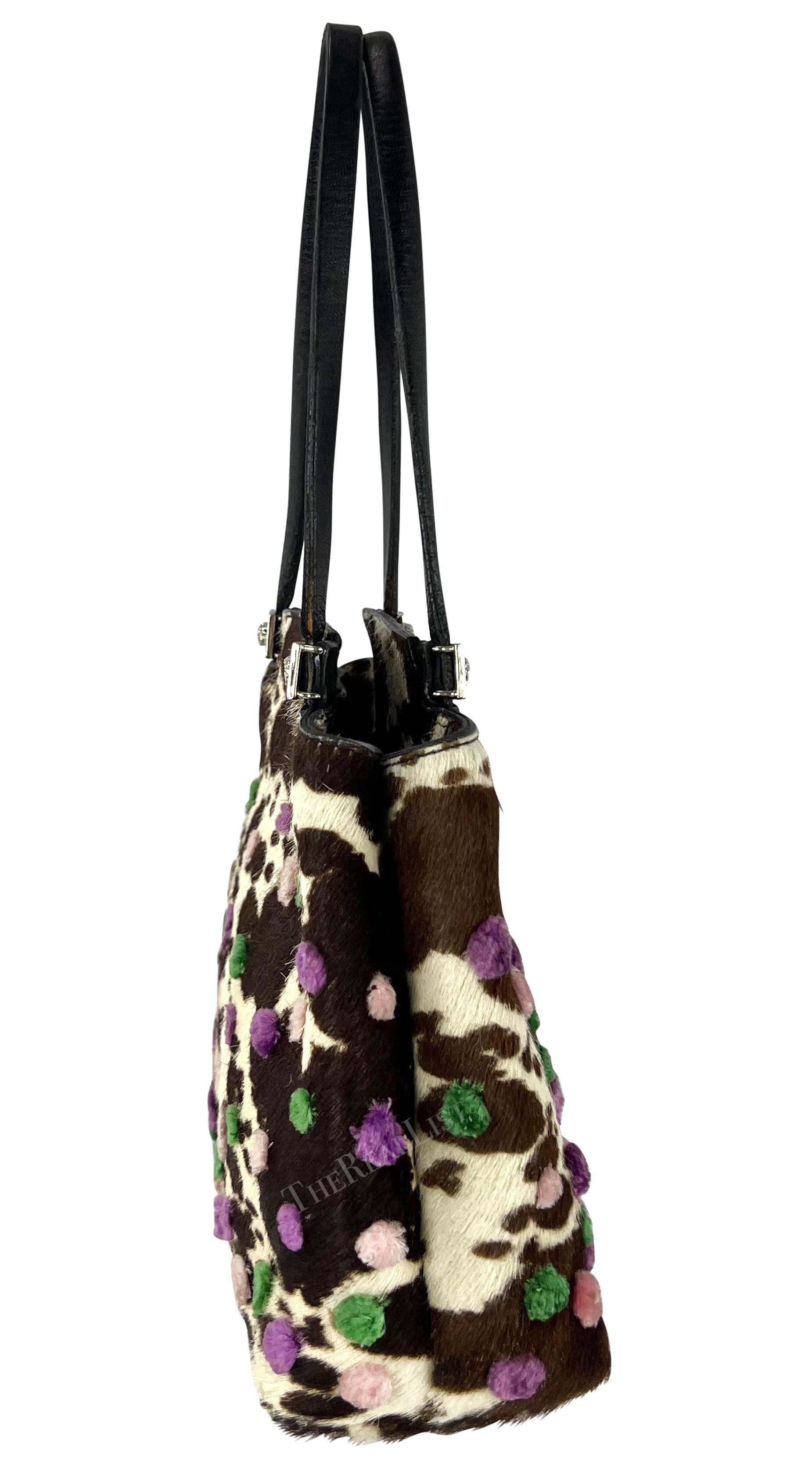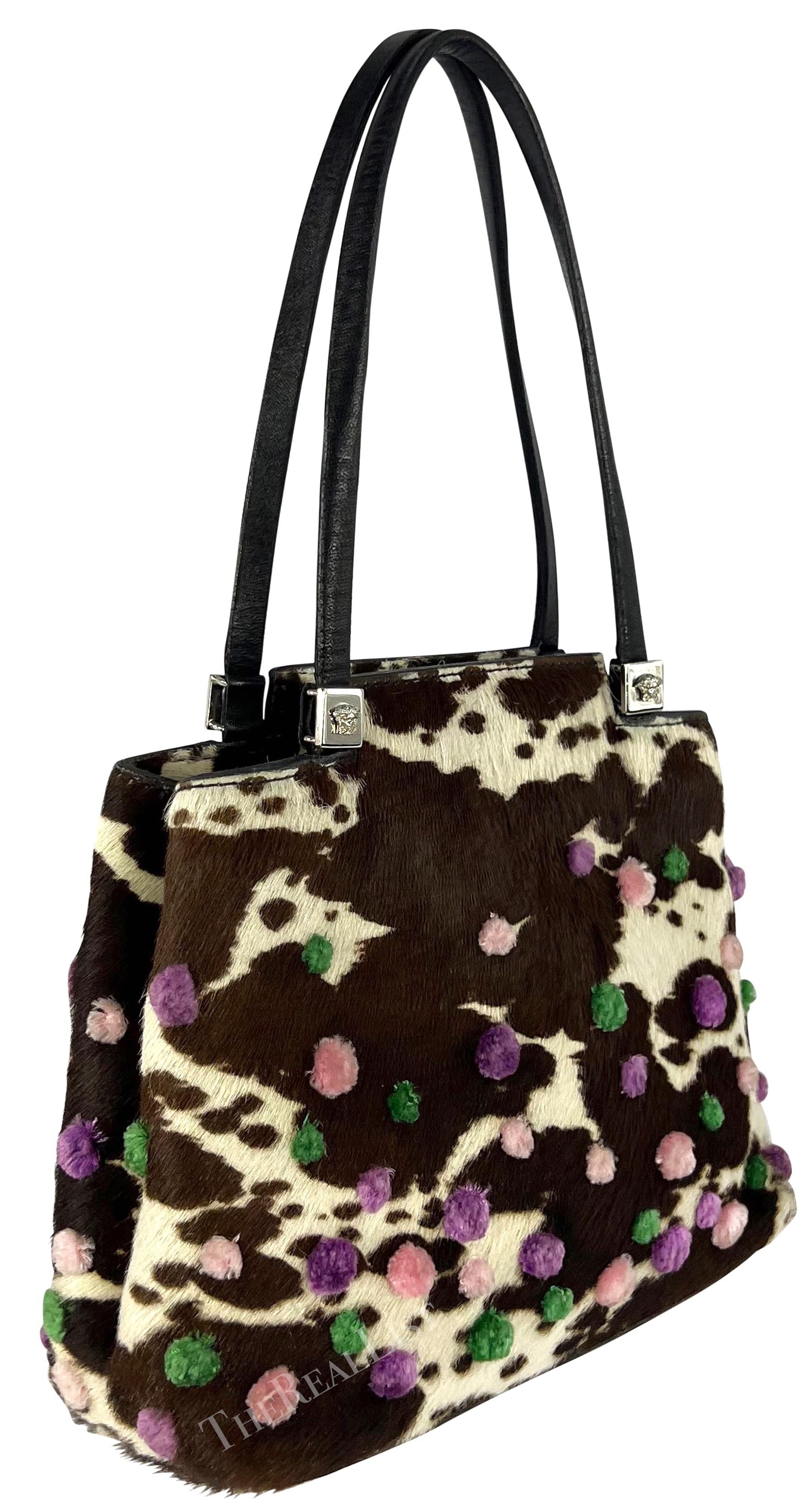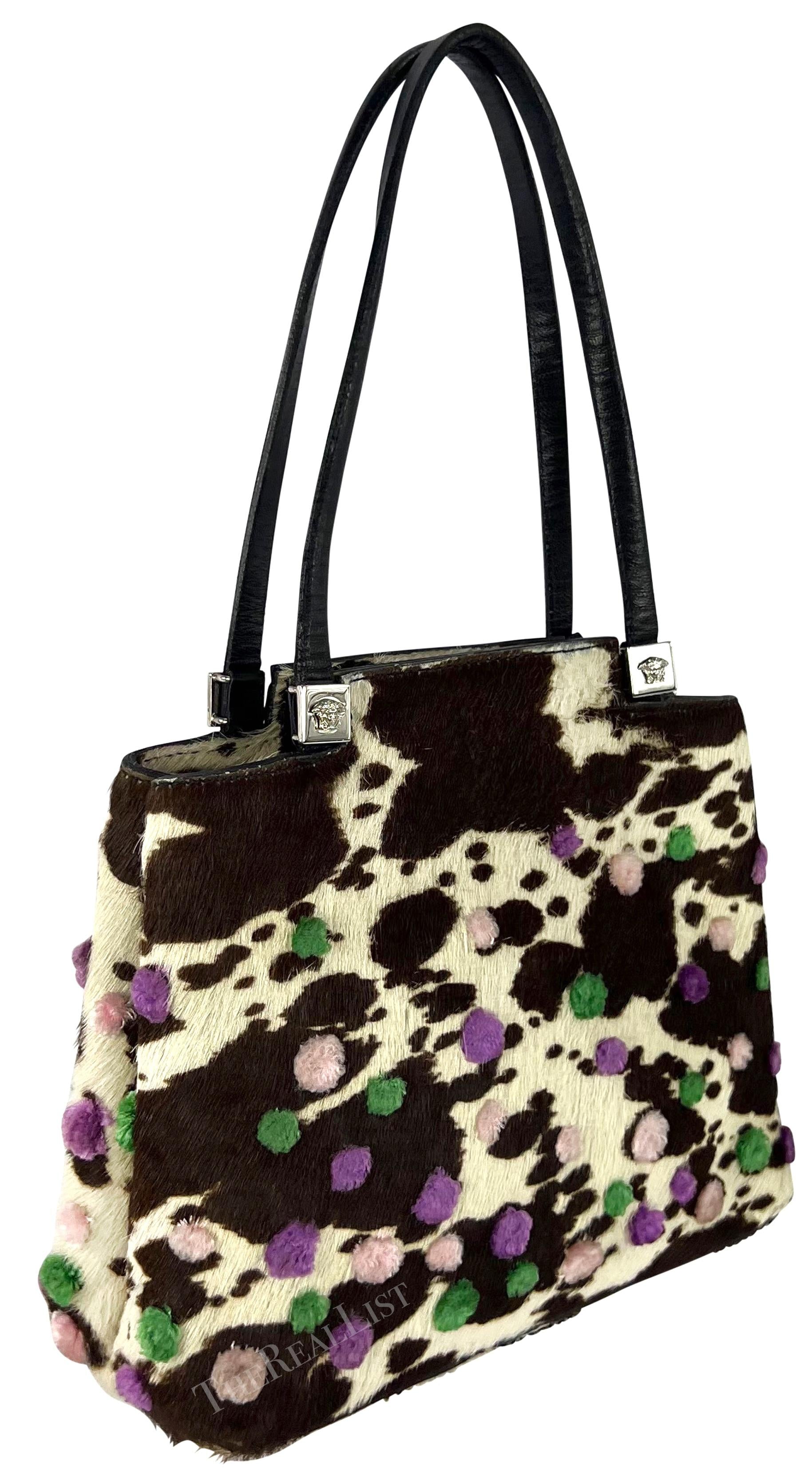 A chic brown cow pony hair Gianni Versace mini bag from the Spring/Summer 1999 collection, designed by Donatella Versace. This petite bag is crafted from brown cow-spotted pony hair, complemented by brown leather straps. Collected at the bottom of this bag are pink, purple, and green pom poms. This adorable bag is made complete with silver-tone Versace Medusa accents at the base of the handles. Check out our storefront for the matching pony hair sunglasses!