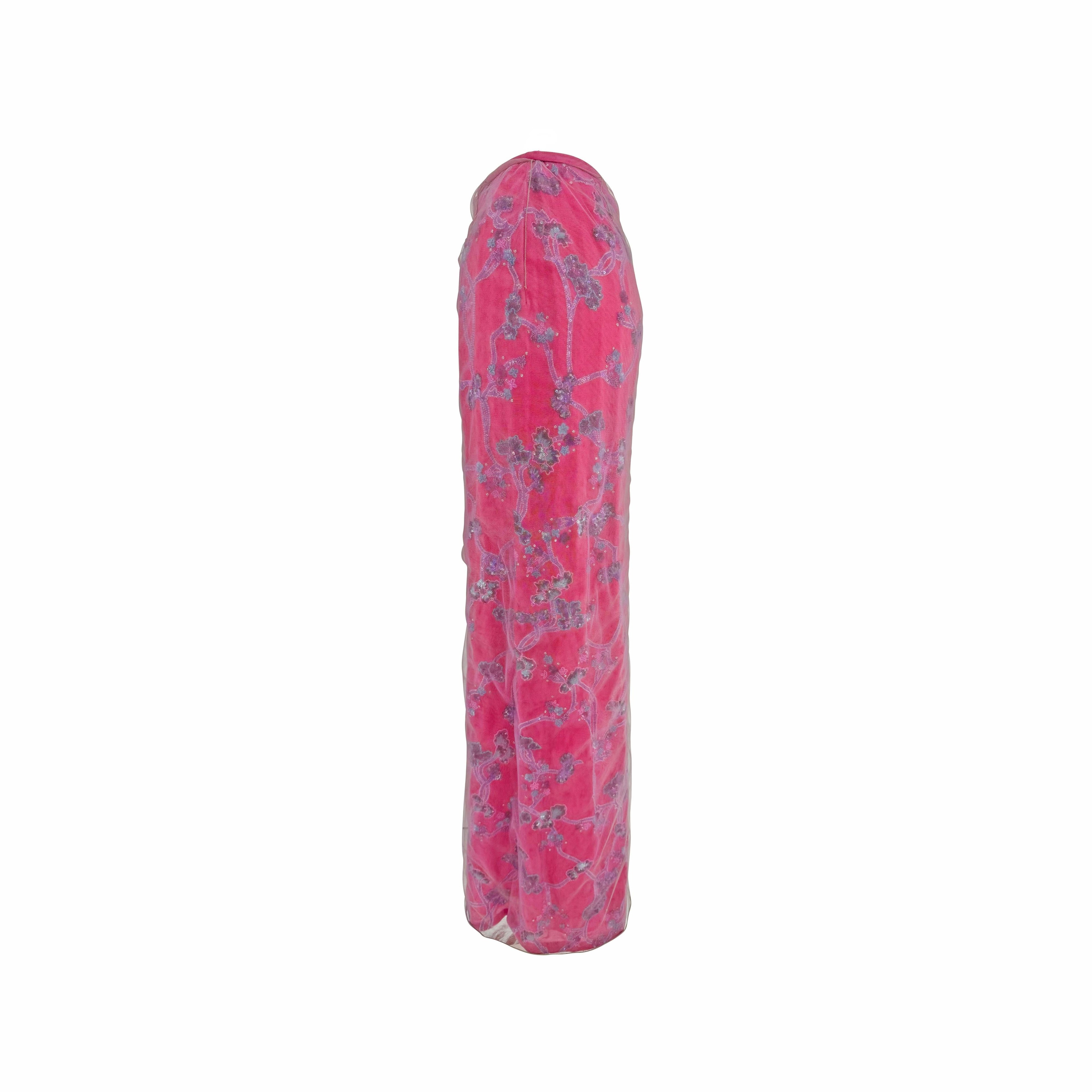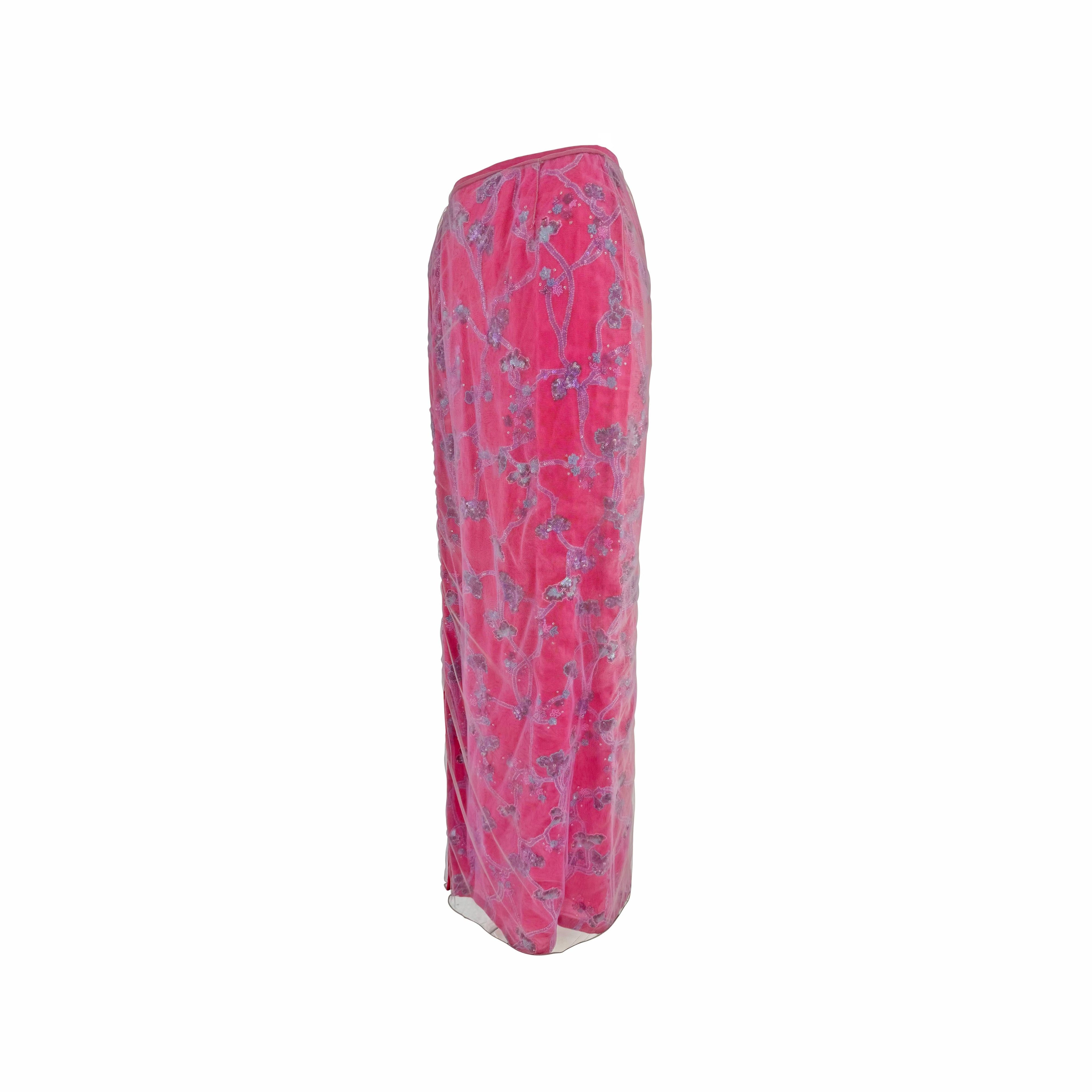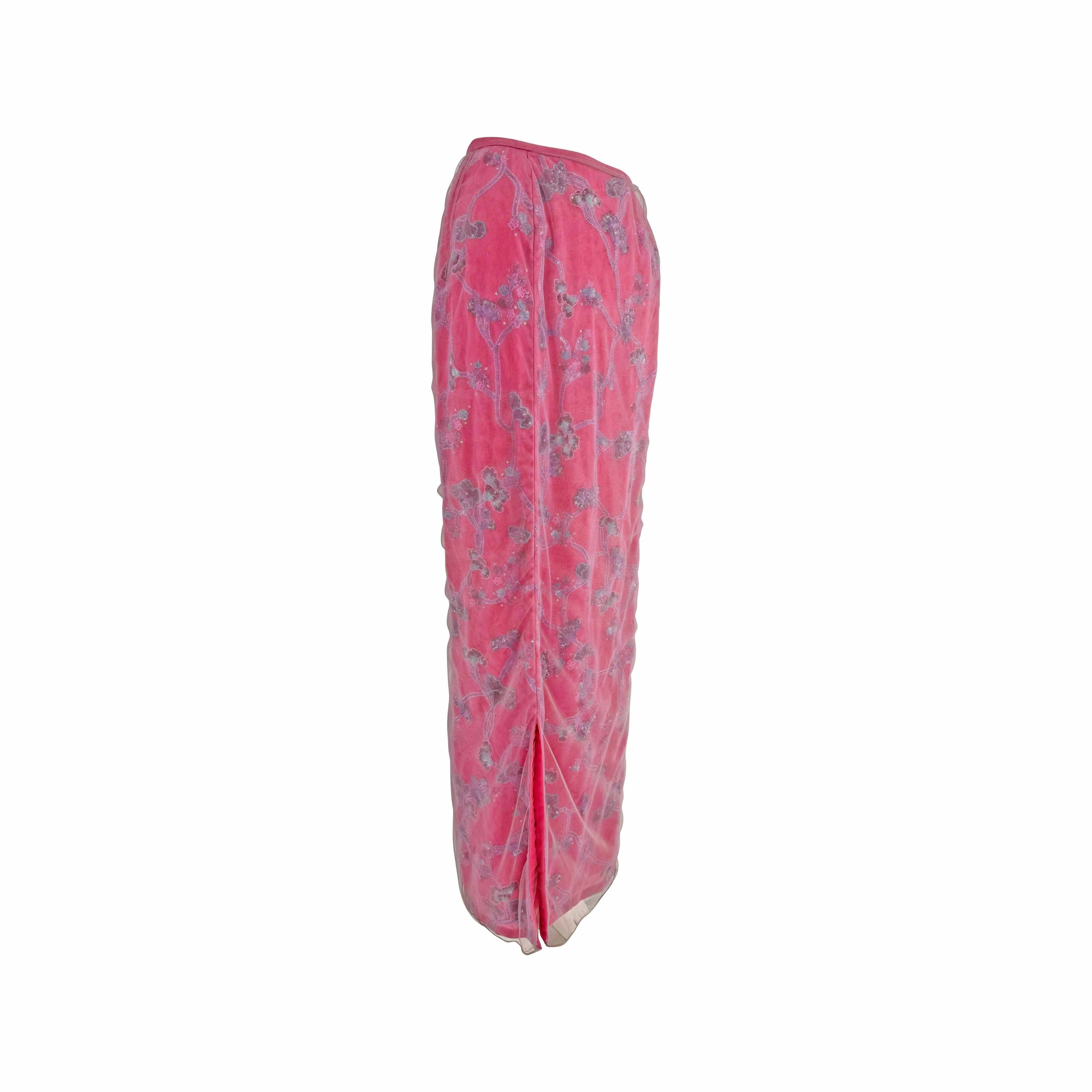 S/S 1999 Giorgio Armani Runway Pink Floral Beaded Tulle Overlay Maxi Skirt