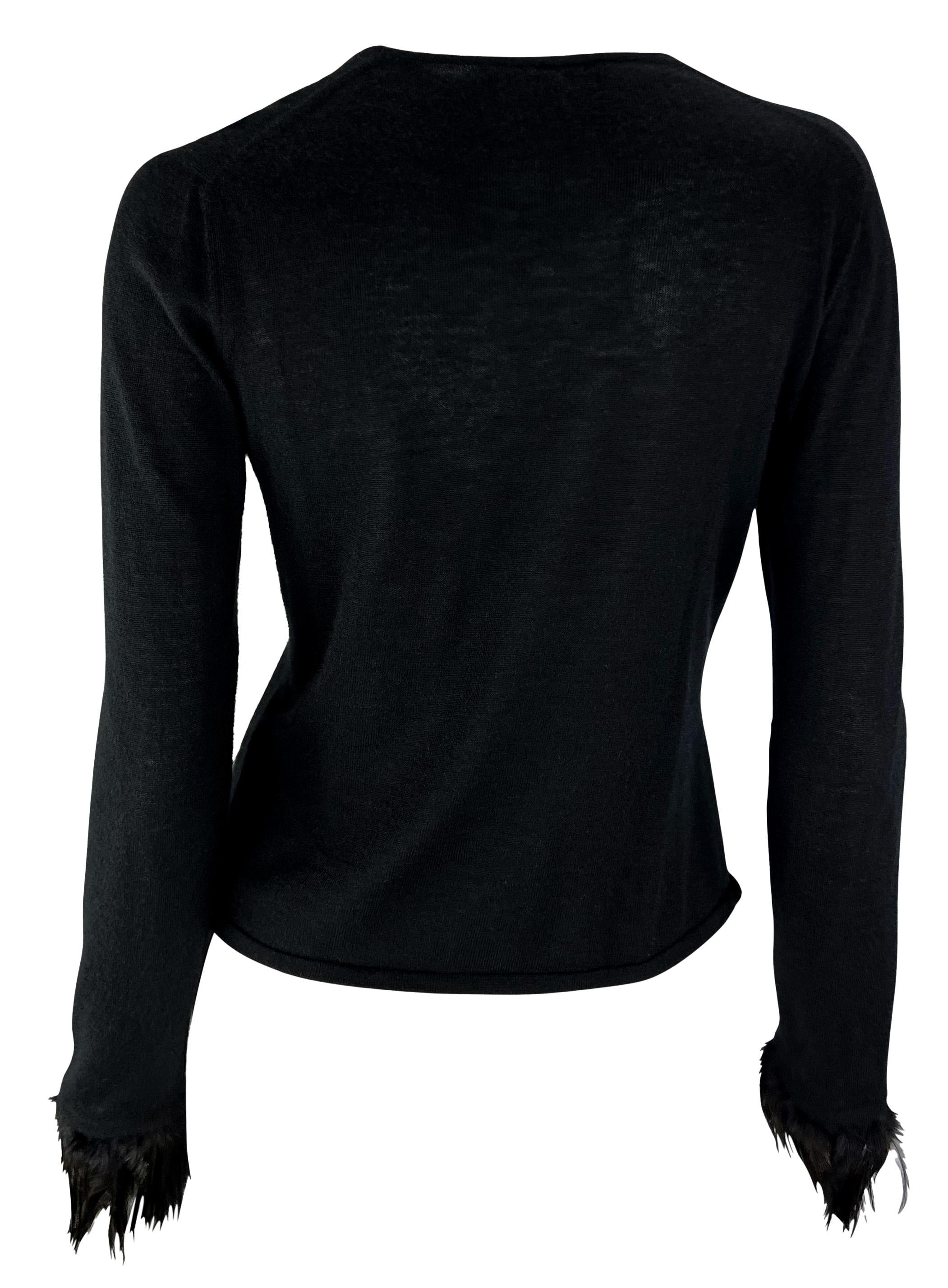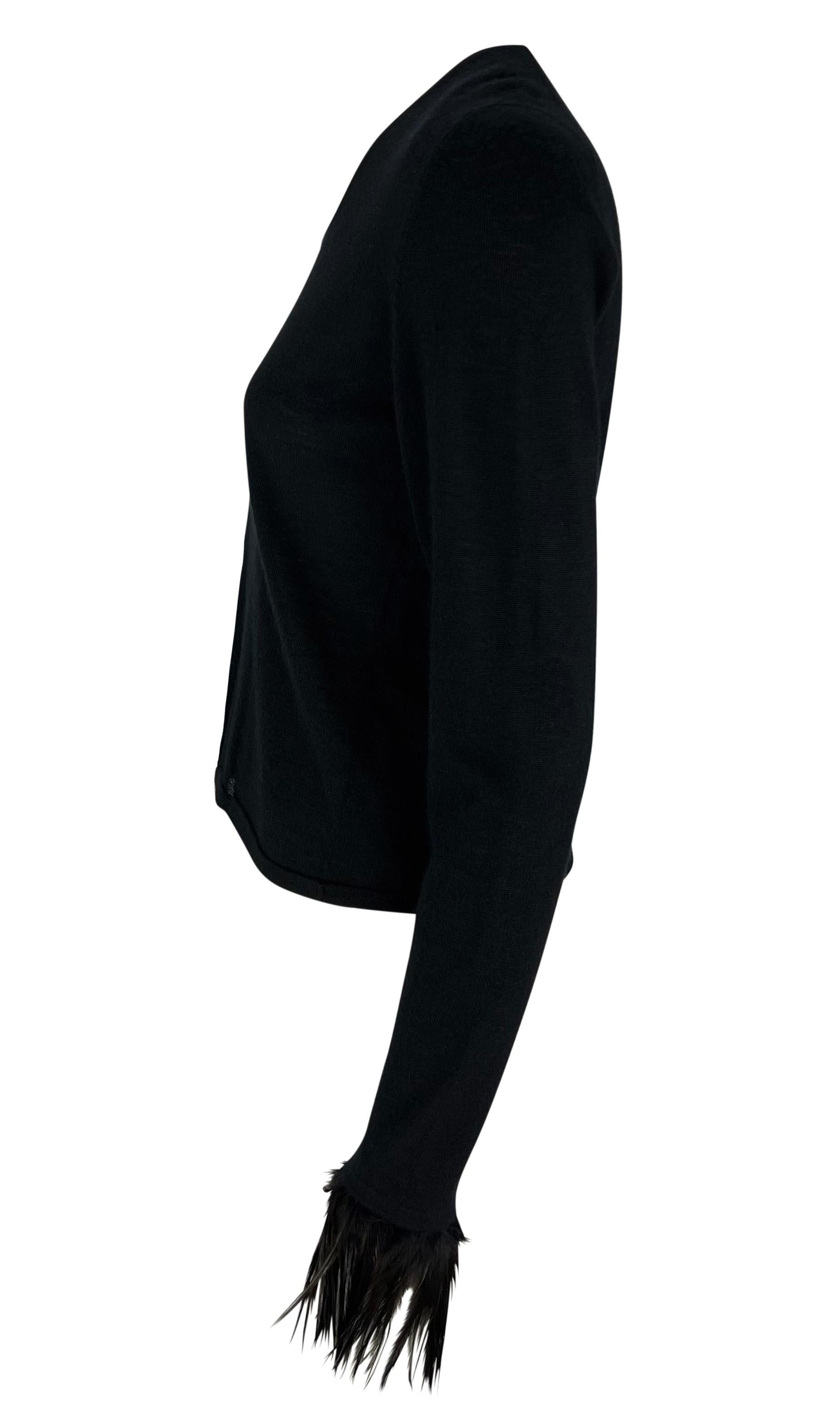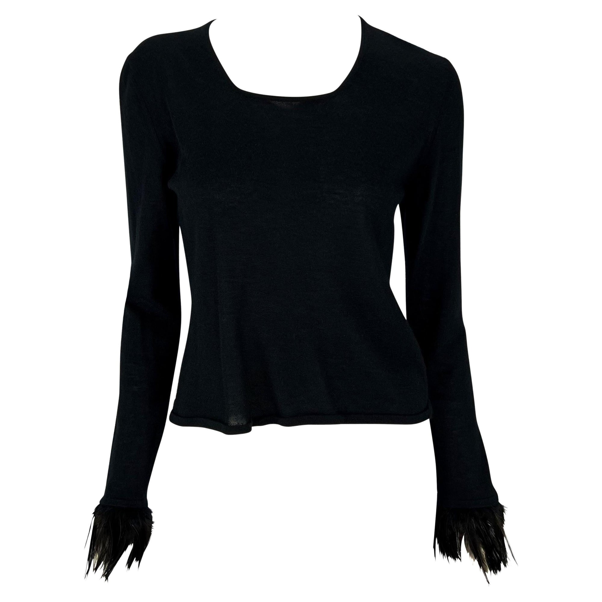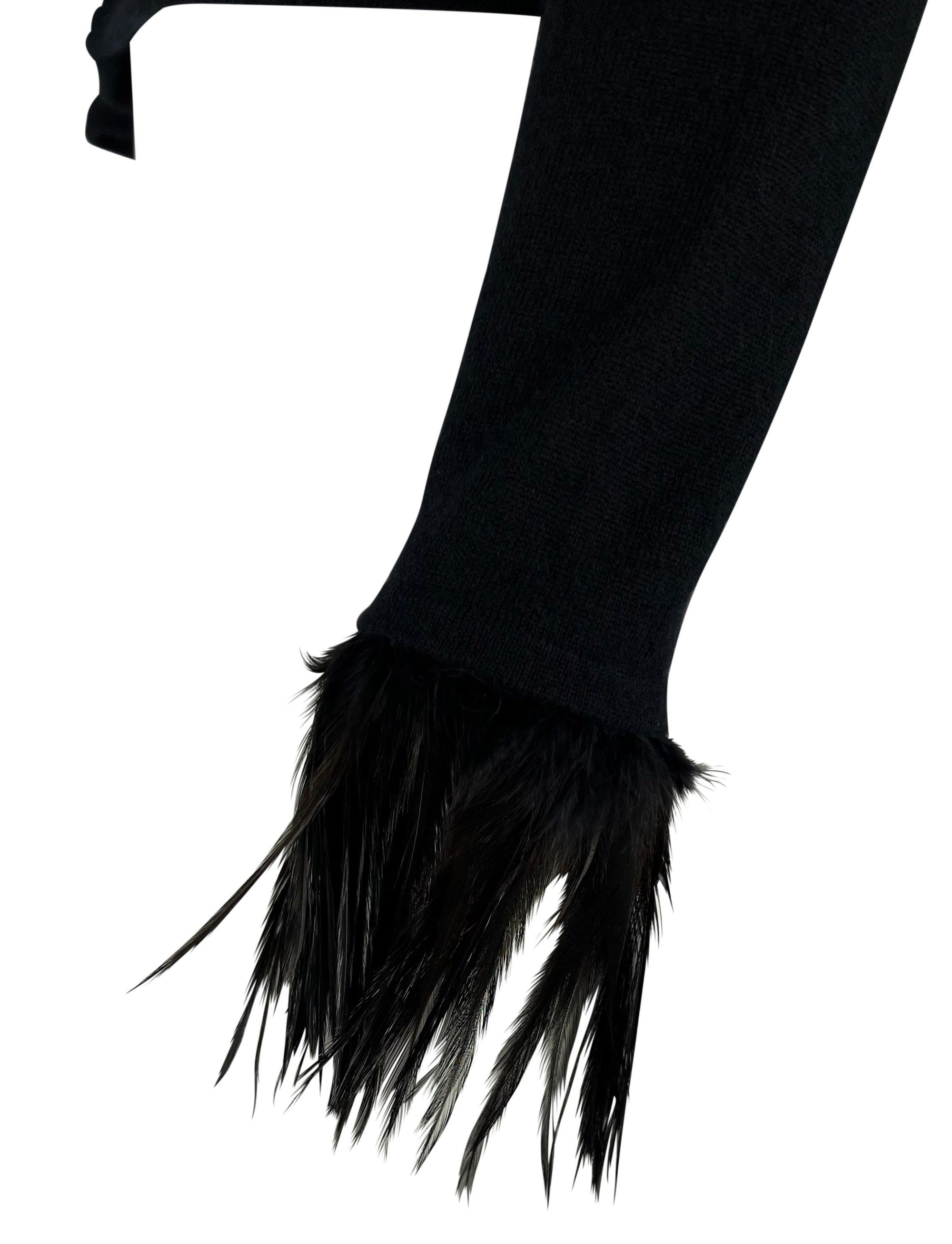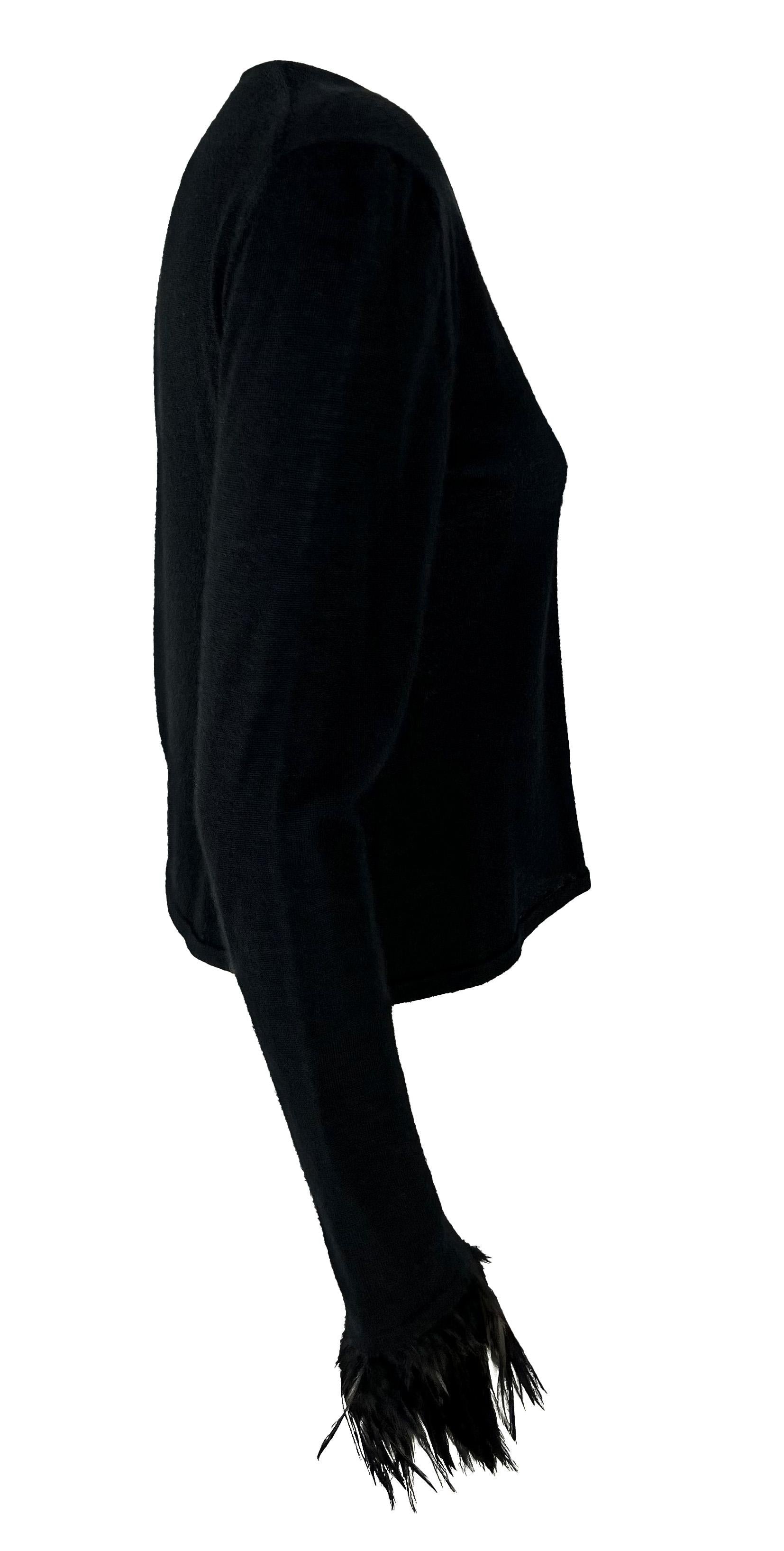 An incredible black cashmere Gucci sweater designed by Tom Ford for the Spring/Summer 1999 collection. Made entirely of luxurious cashmere, this sweater features black iridescent feather-accented cuffs. A perfectly elevated closet staple, this Gucci by Tom Ford piece is a must-have addition to any wardrobe!