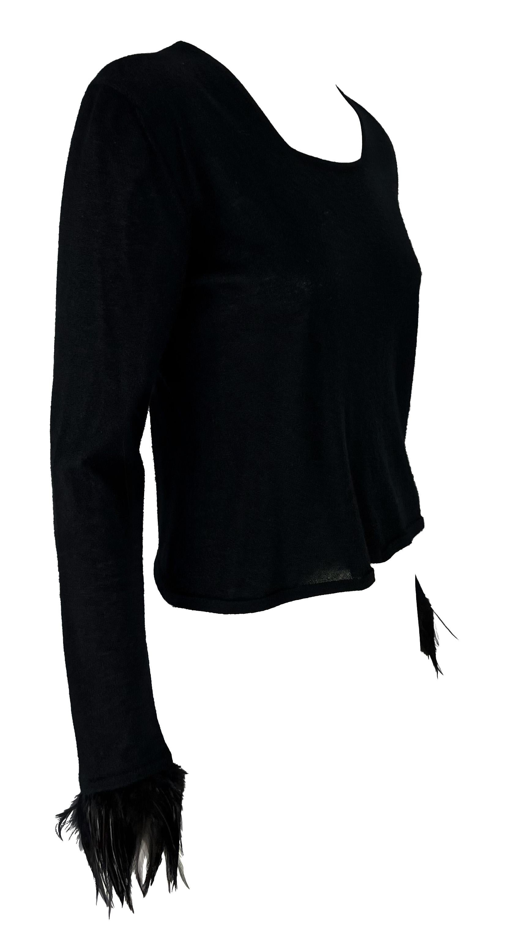 S/S 1999 Gucci by Tom Ford Feather Trim Cuff Black Stretch Knit Long Sleeve Top